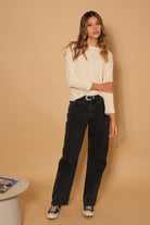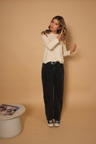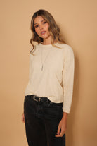 Buzo crema de cuello redondo, en  tela tejido punto liviano acanalada, de estilo casual y cómodo.