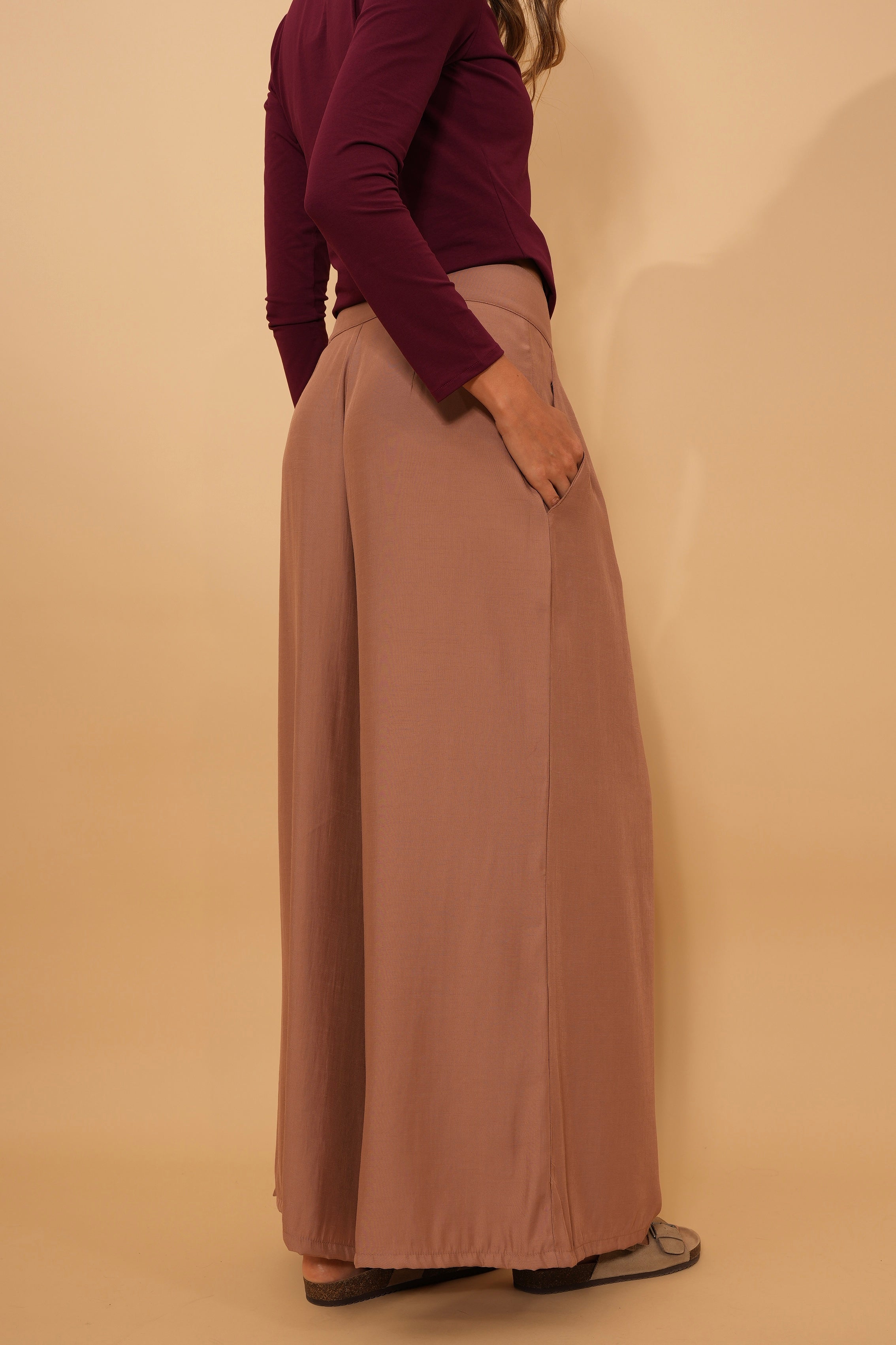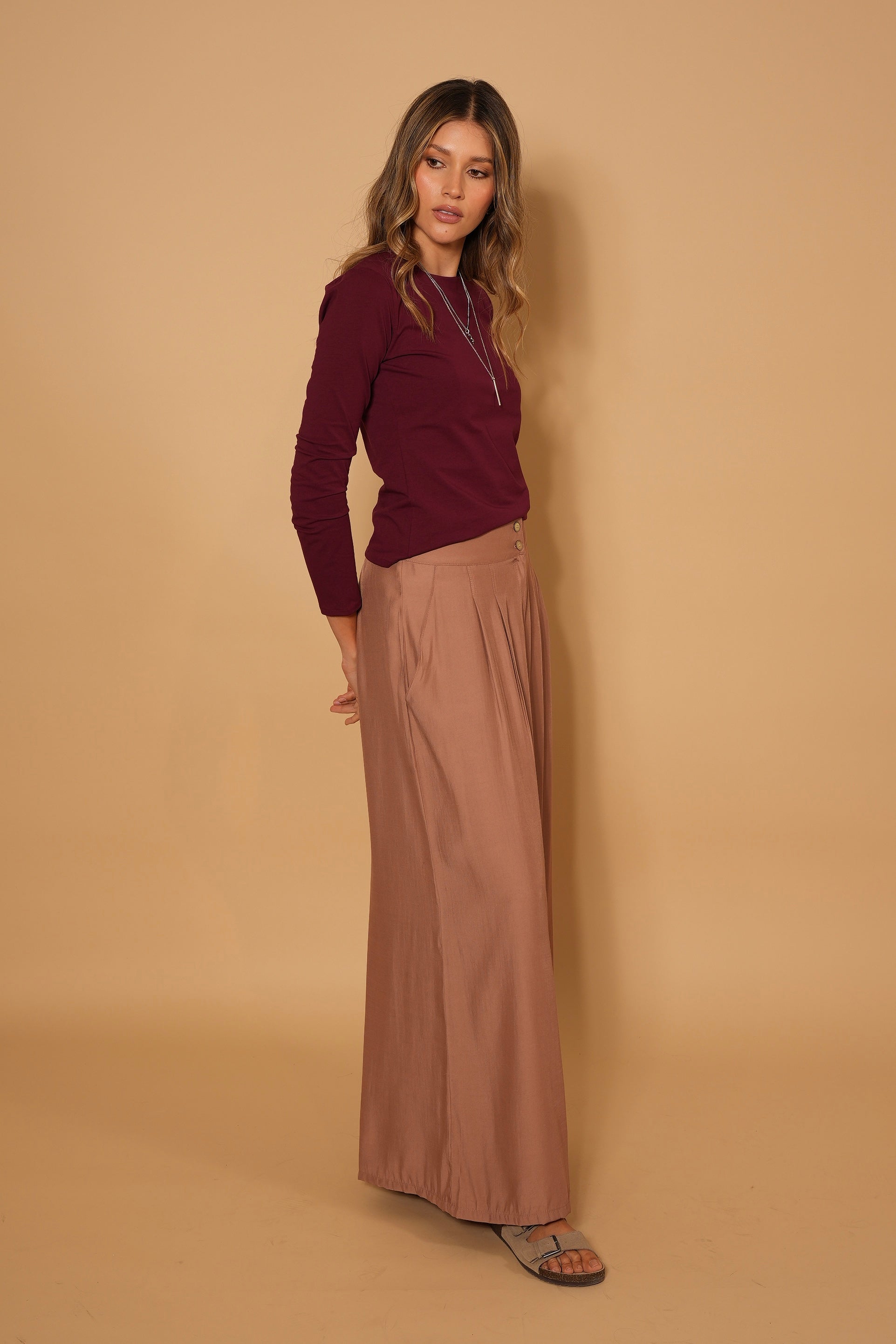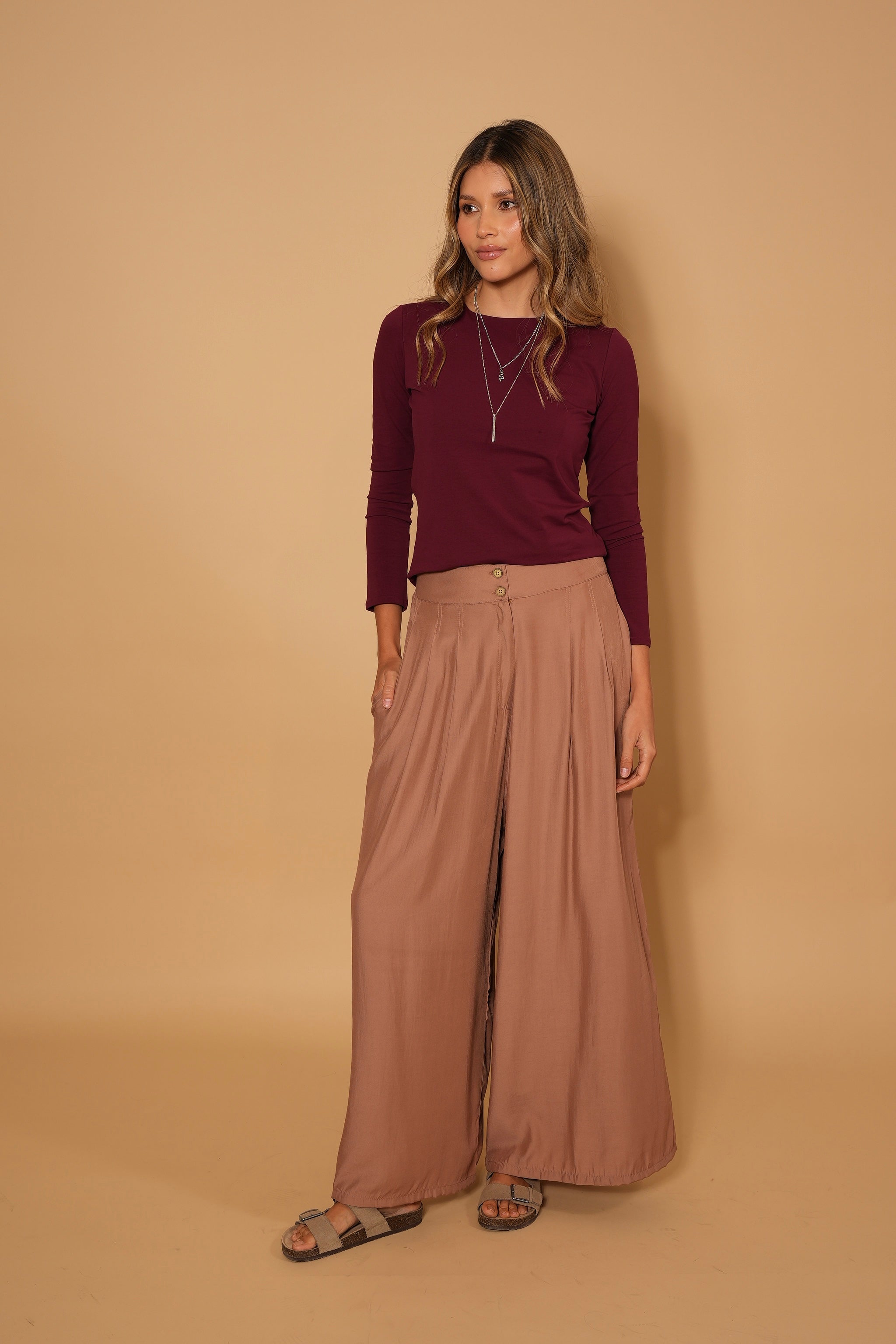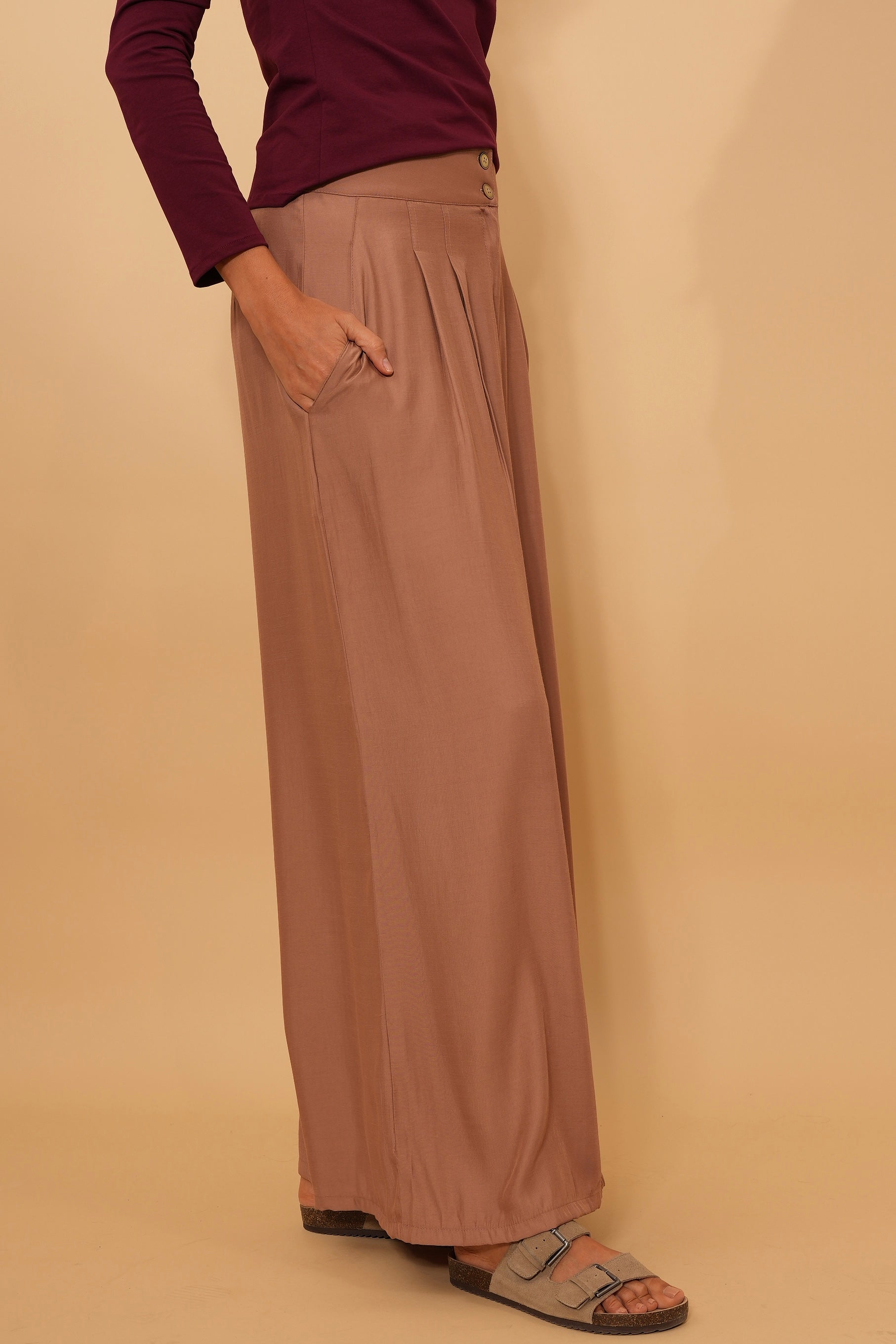 Pantalón mocca, en tela rayón, tiro alto, botones, bota ancha, cierre y bolsillos lo hacen una prenda infaltable en el armario.