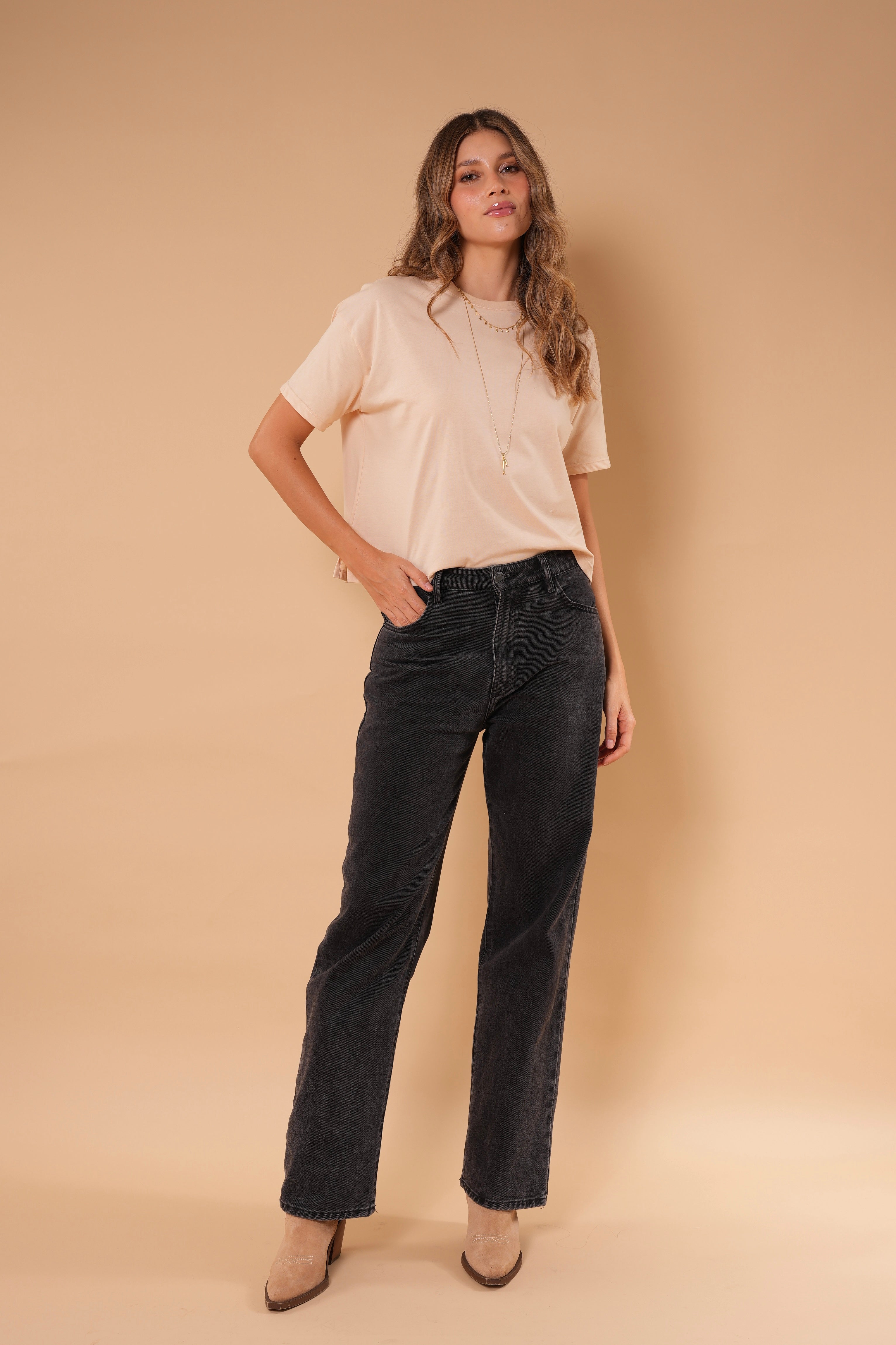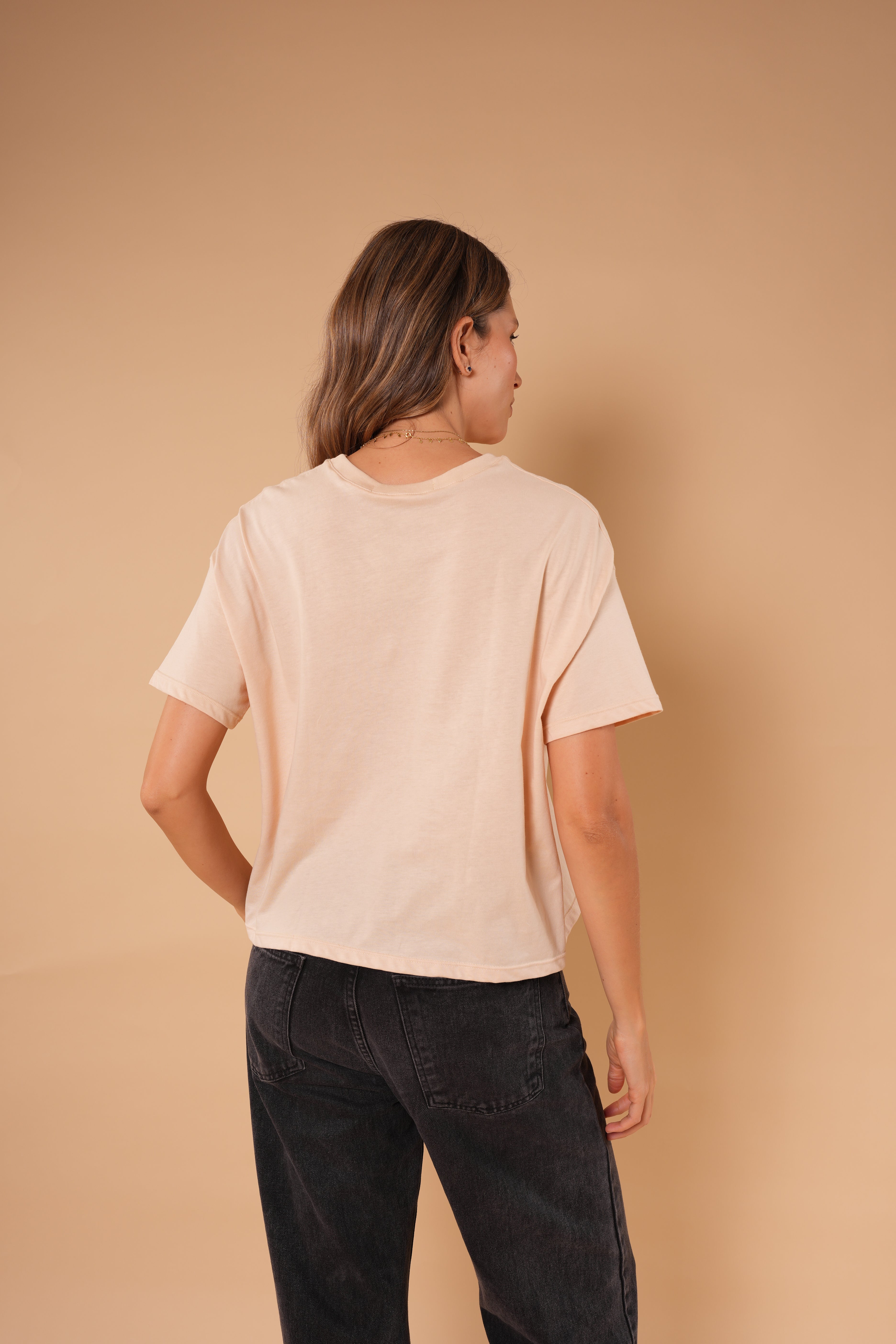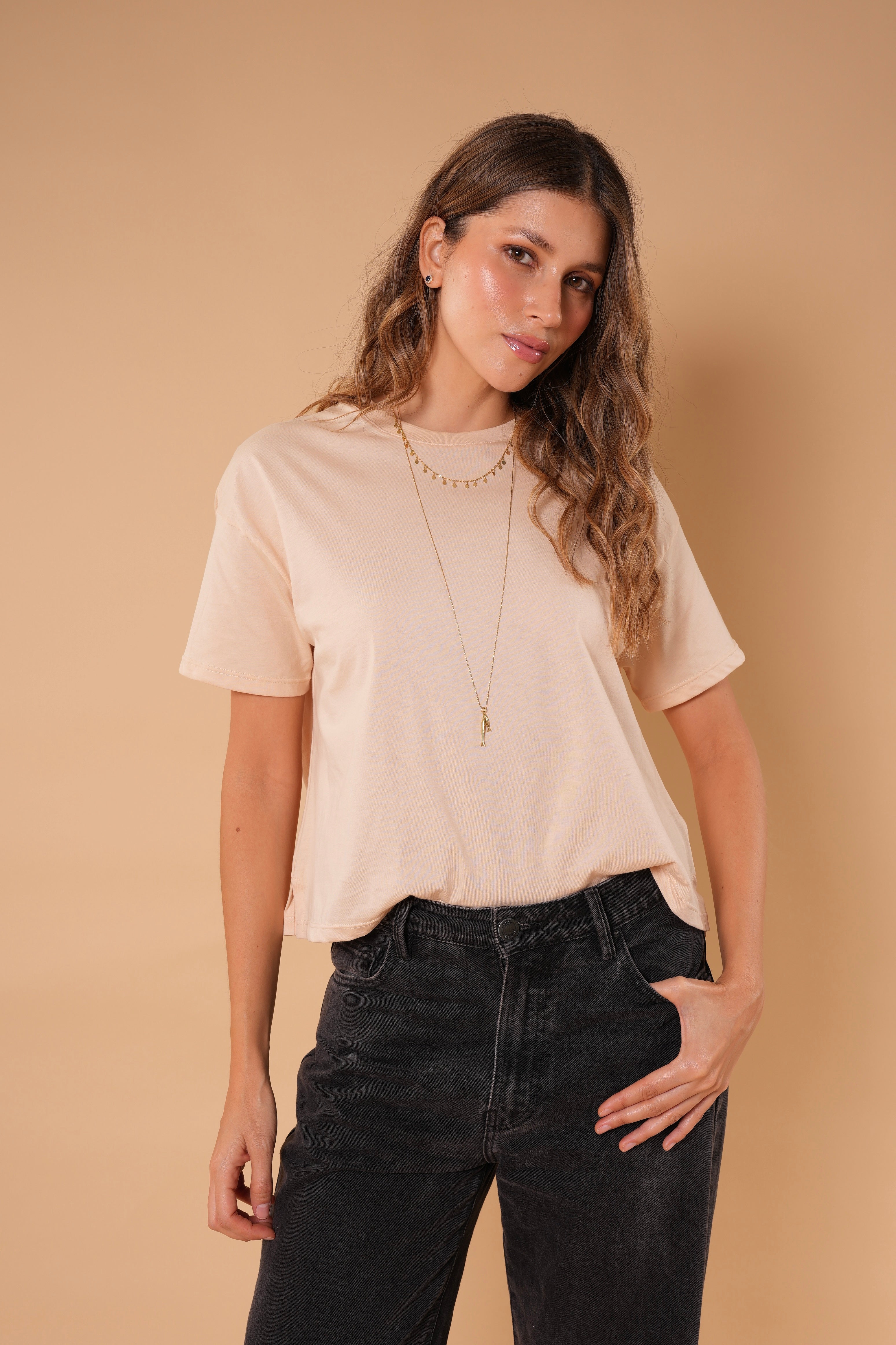 Camiseta beige básica de silueta relajada y manga corta, confeccionada en algodón Peruano para una sensación fresca y cómoda.