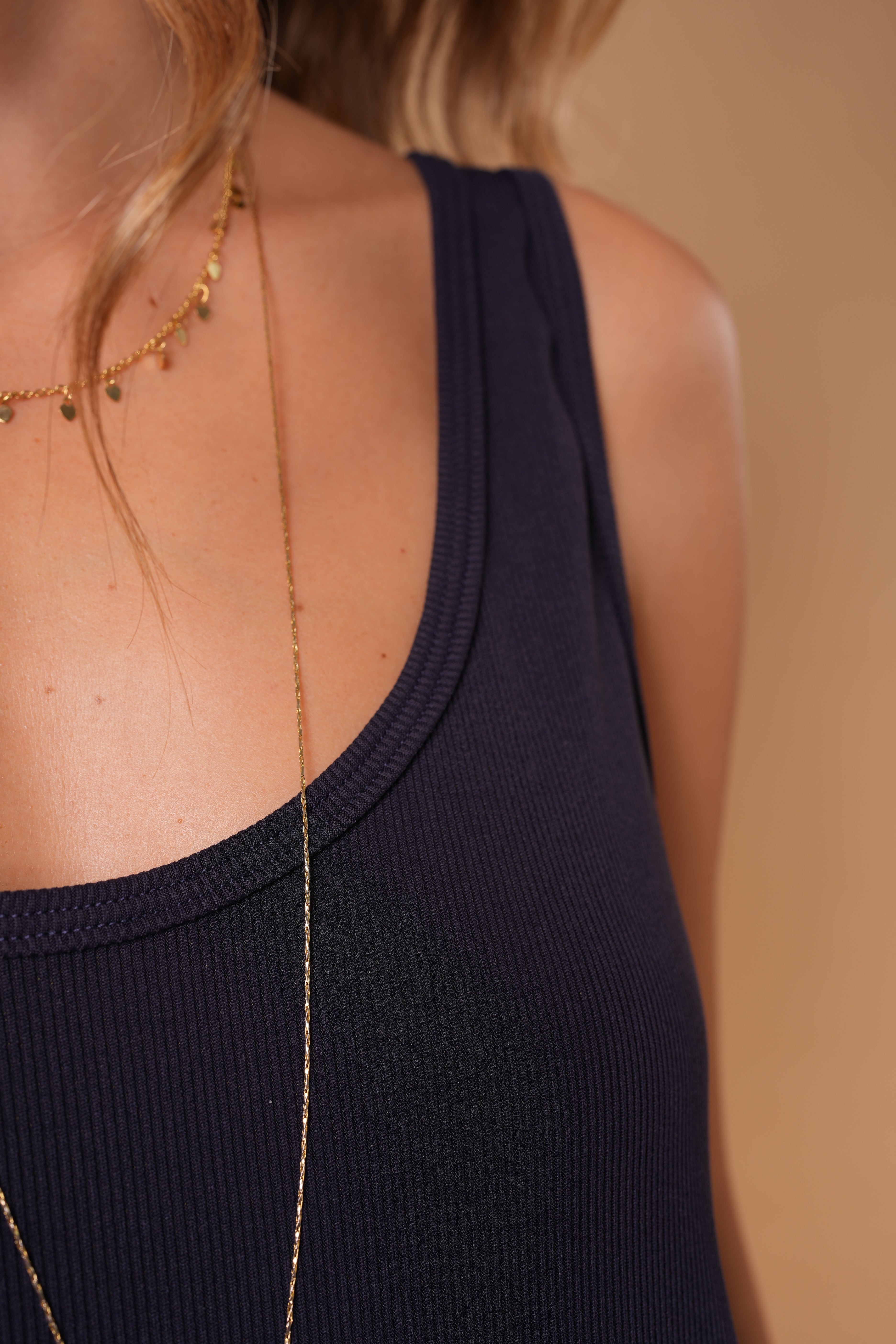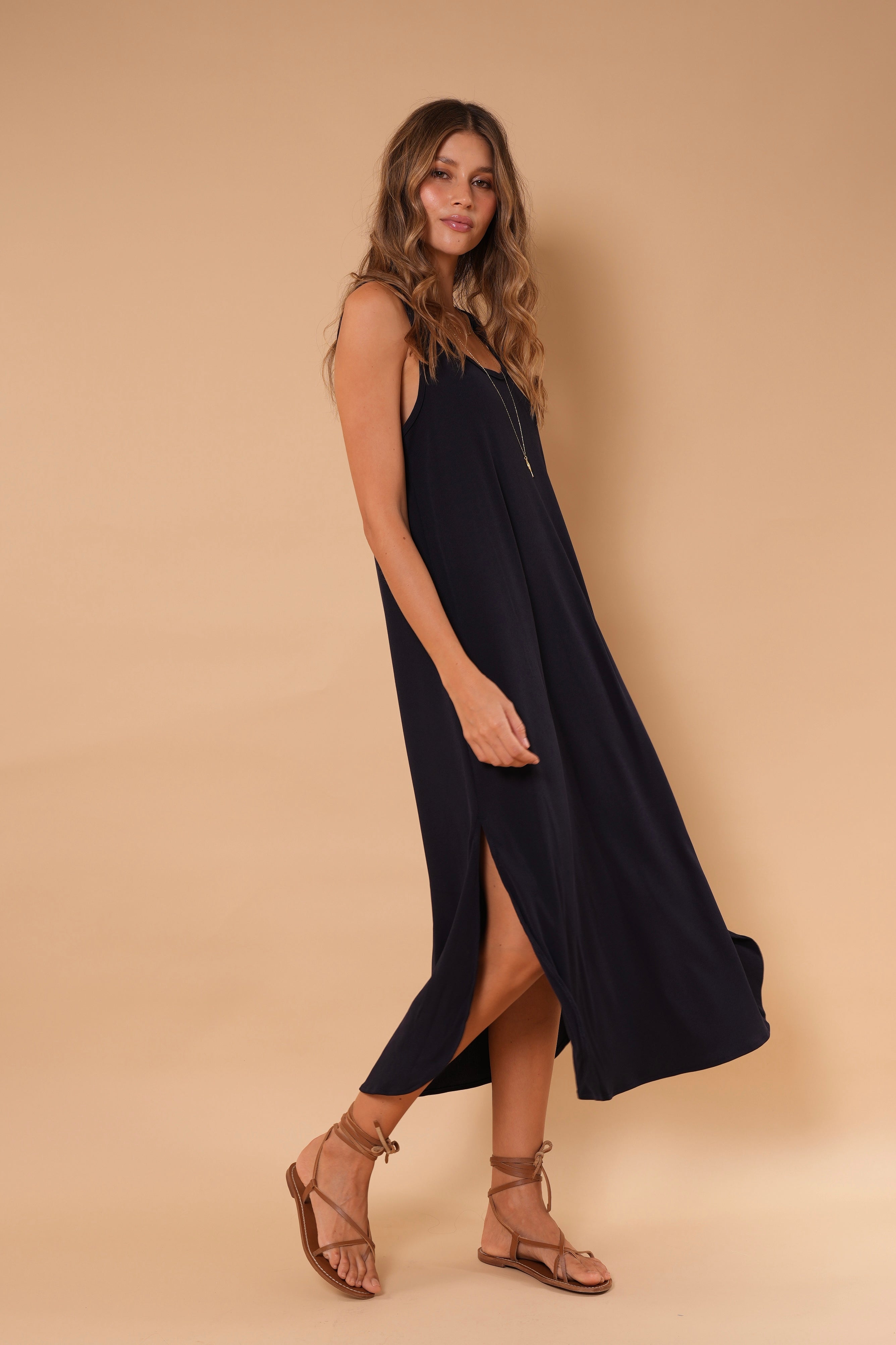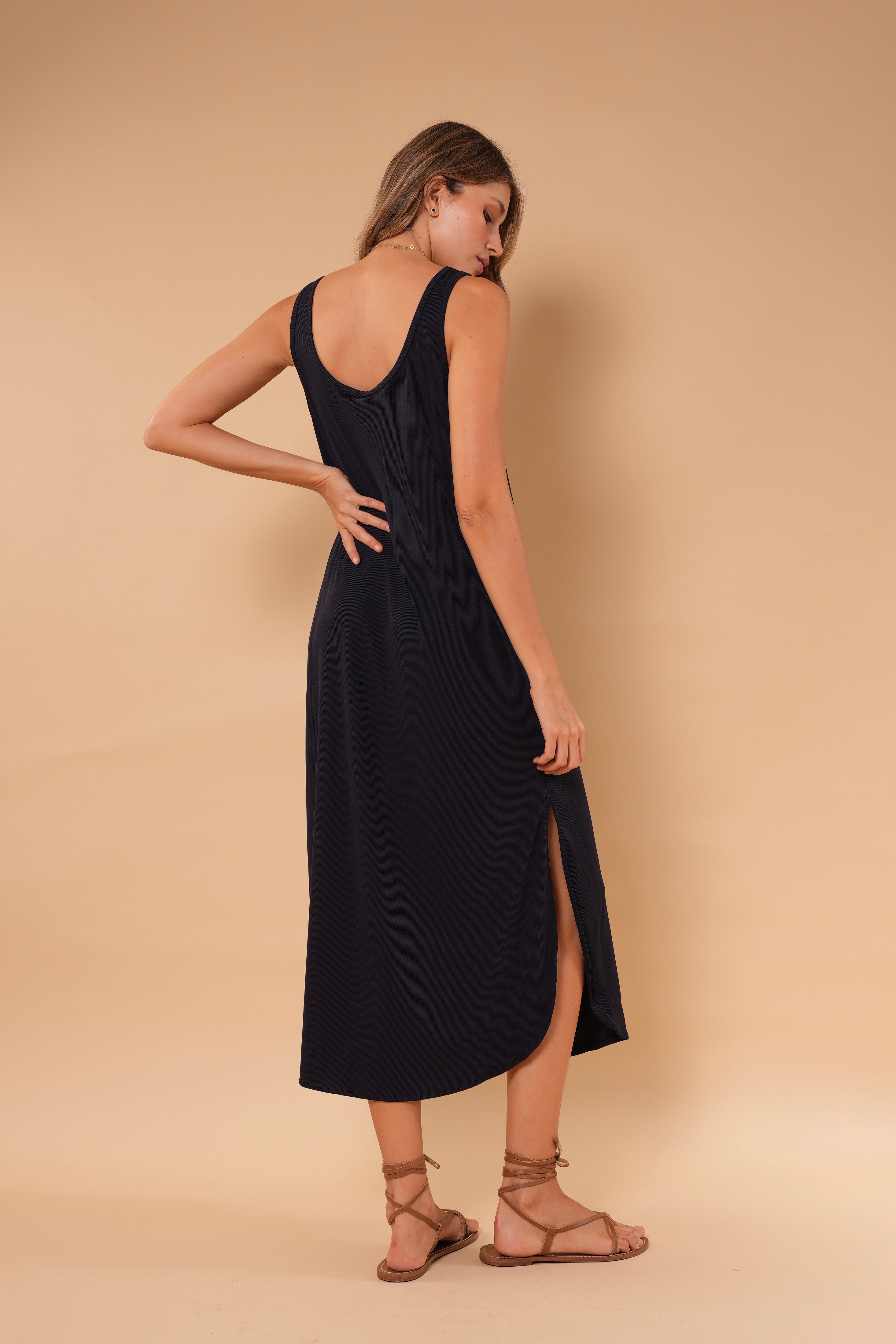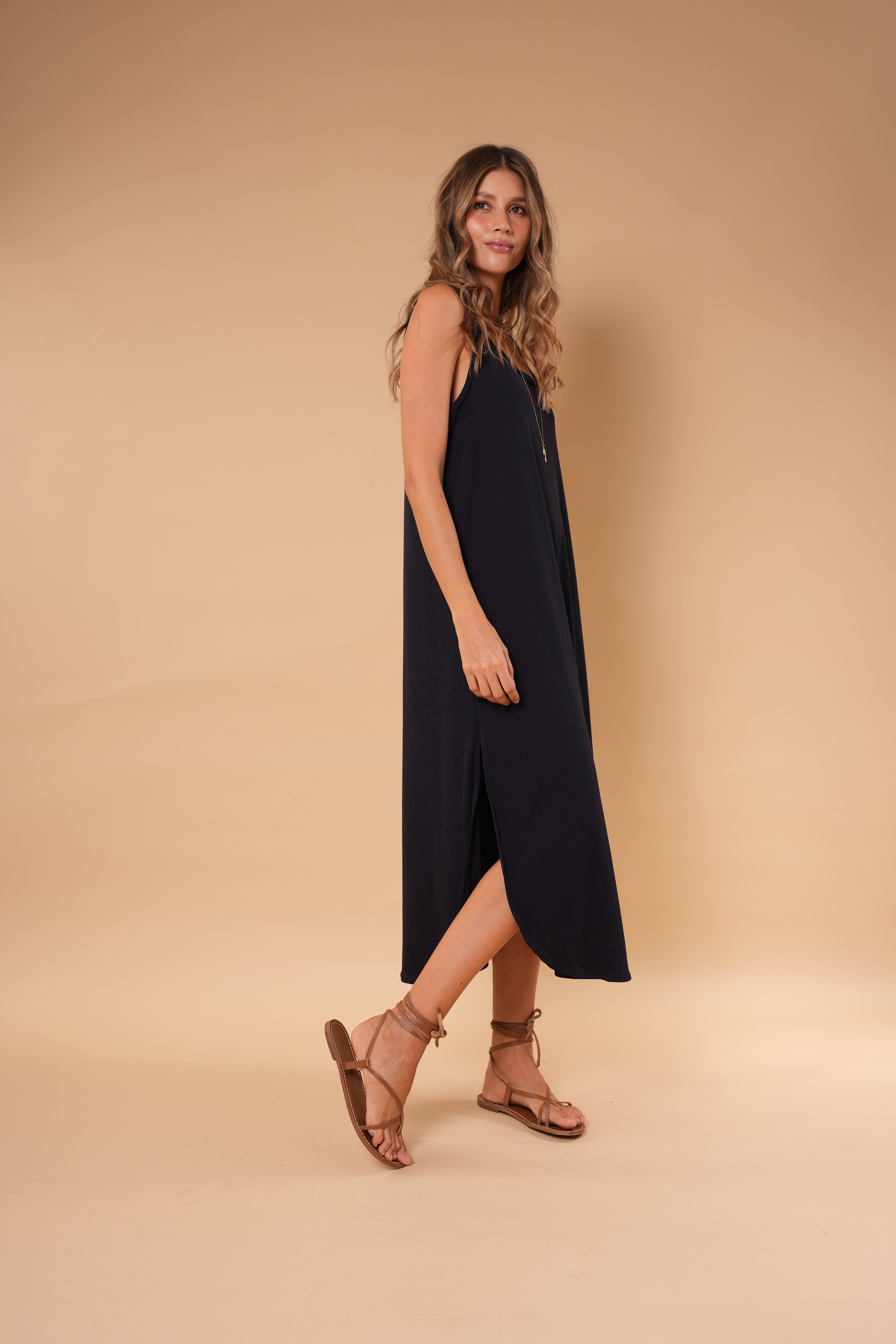 Vestido azul largo básico, en tela Rib con elongación, manga sisa y abertura al costado de la falda, fresco y cómodo.