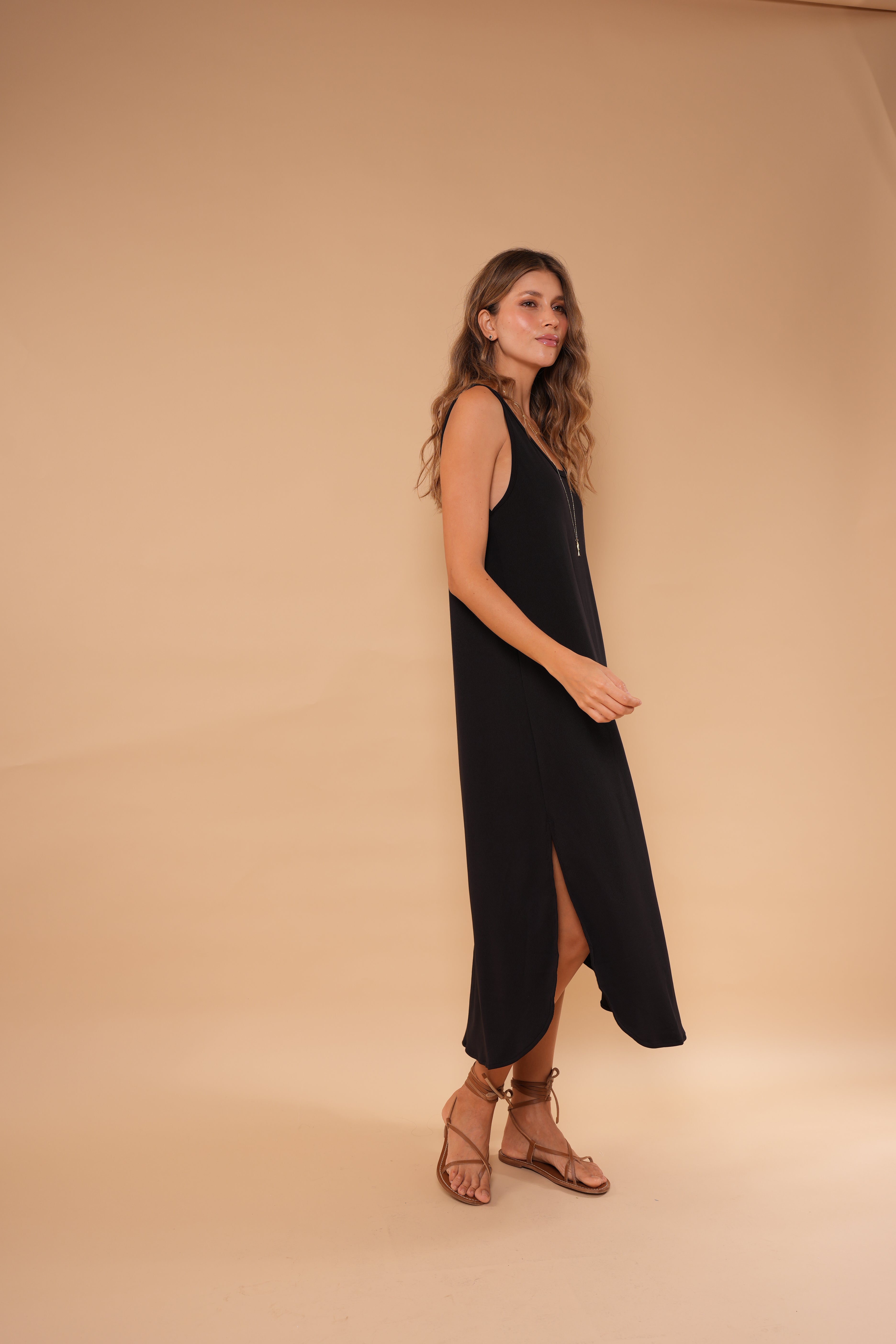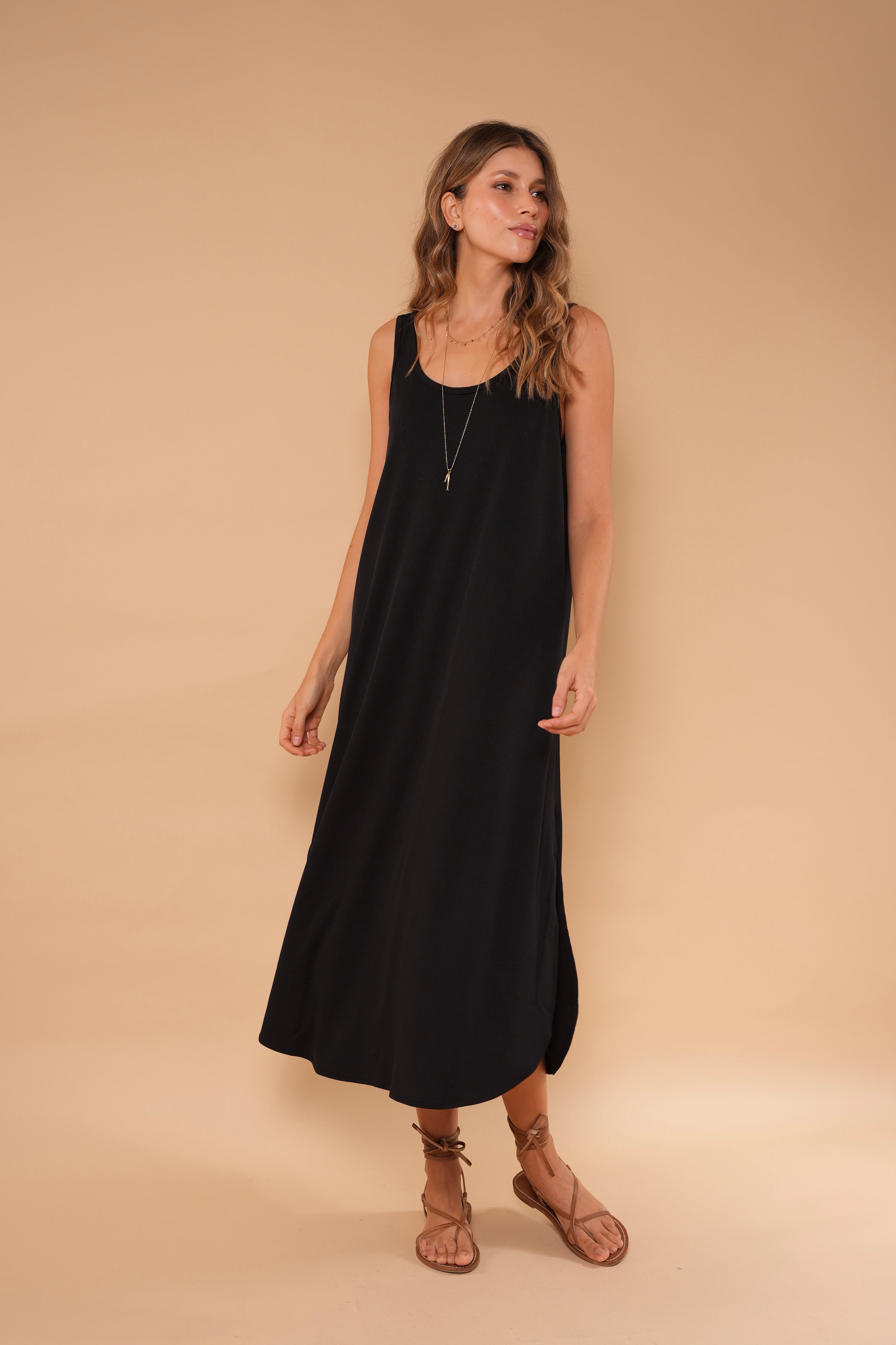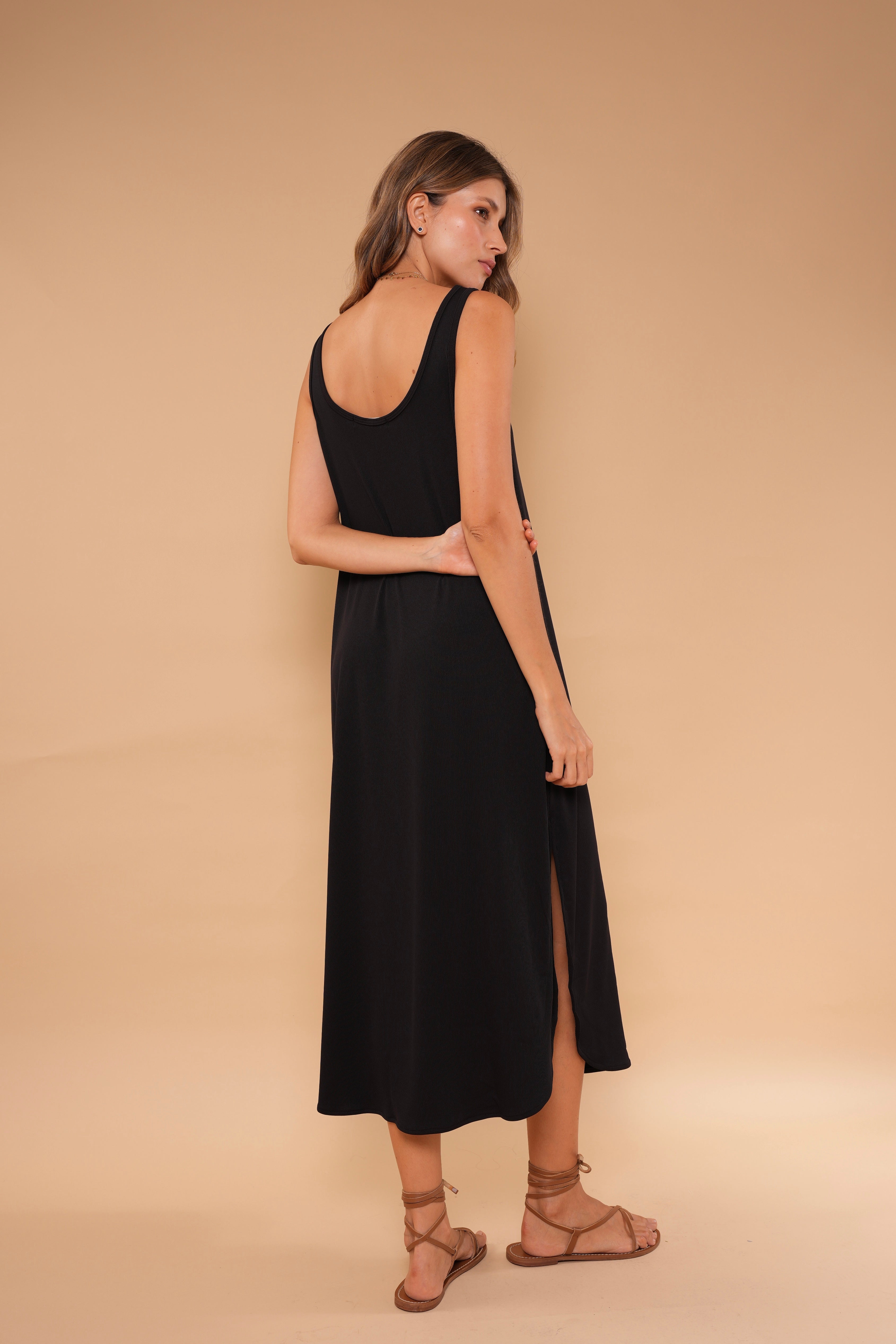 Vestido negro largo básico, en tela Rib con elongación, manga sisa y abertura al costado de la falda, fresco y cómodo.