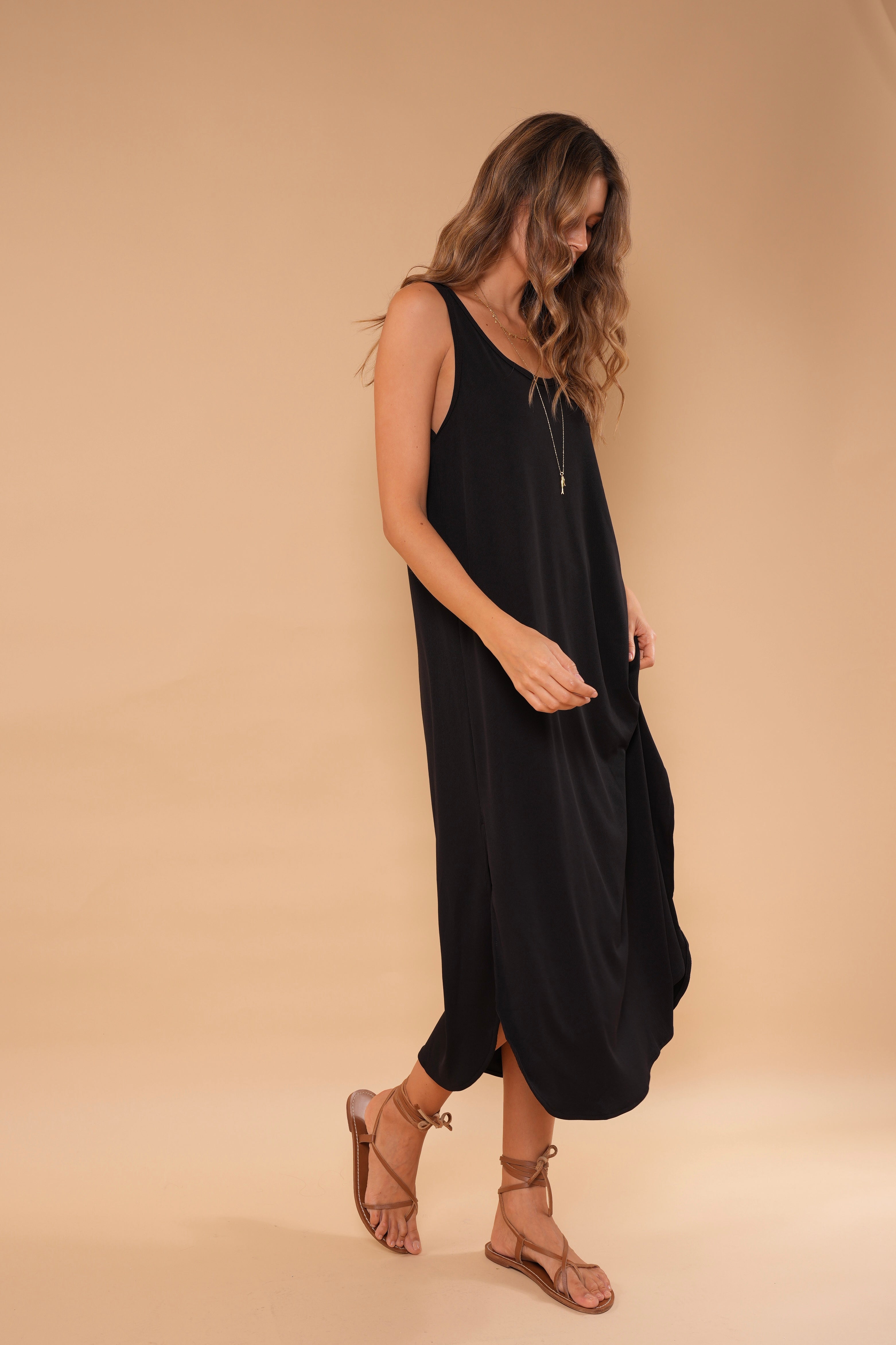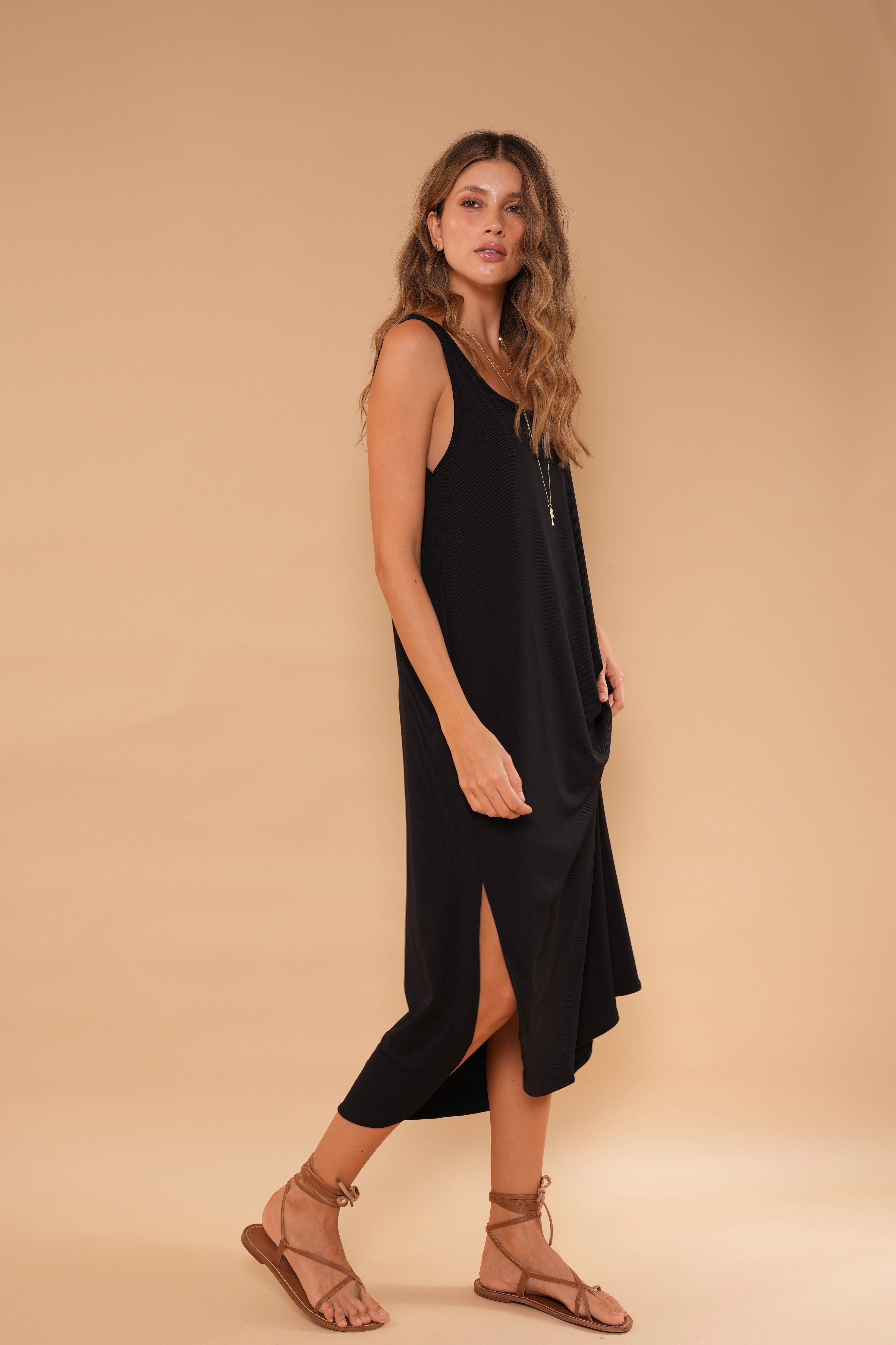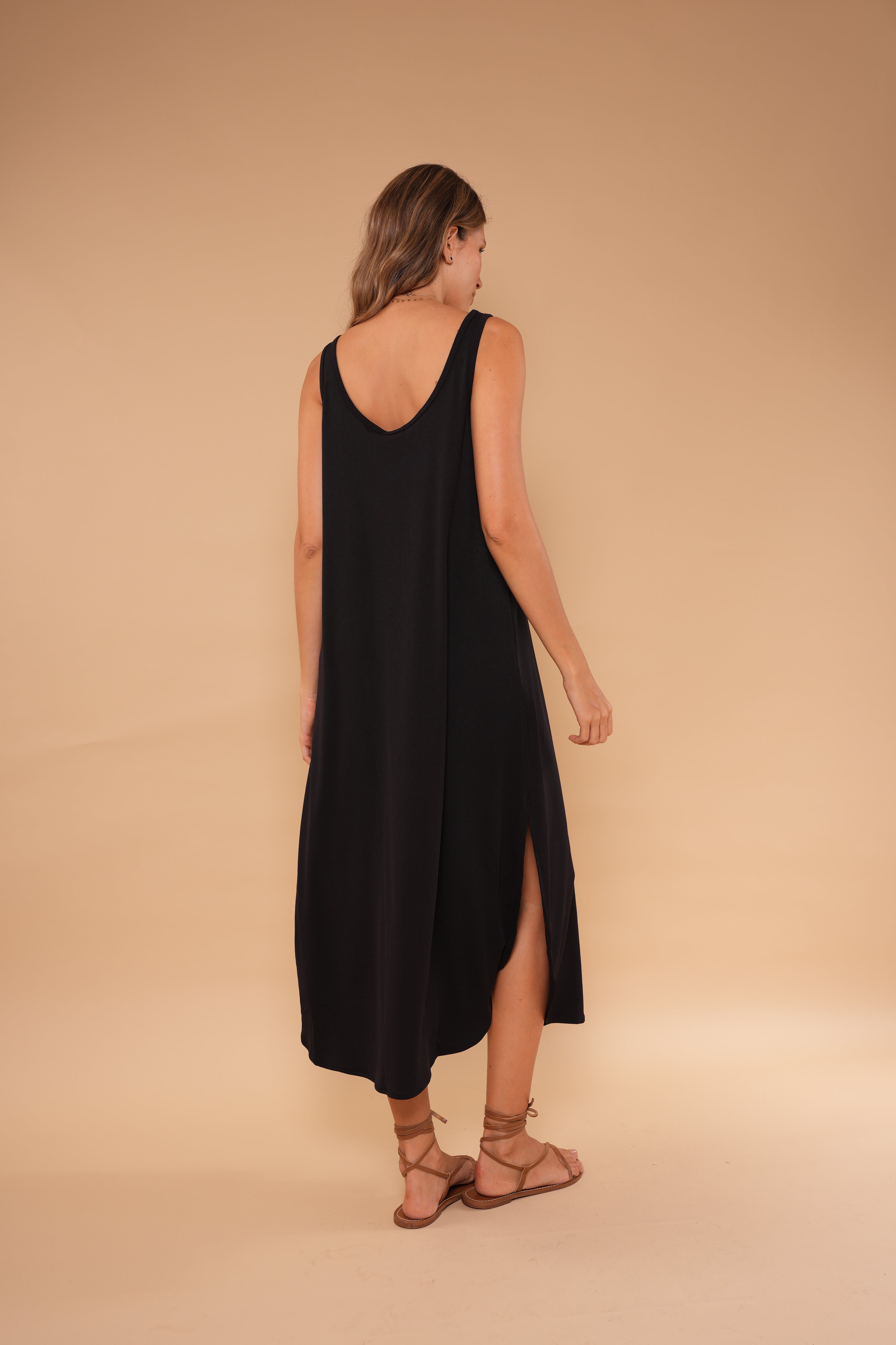 Vestido negro largo básico, en tela Rib con elongación, manga sisa y abertura al costado de la falda, fresco y cómodo.