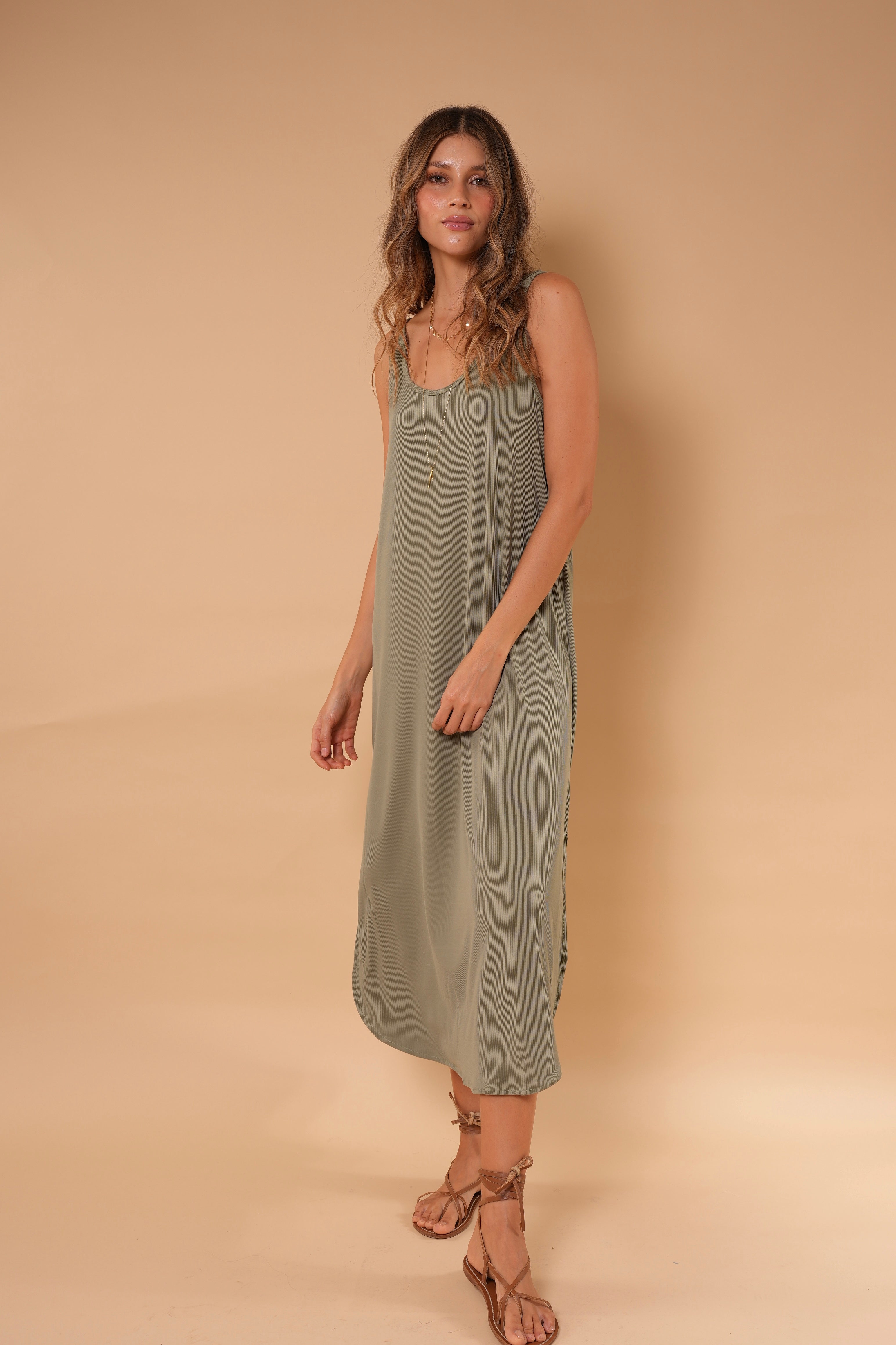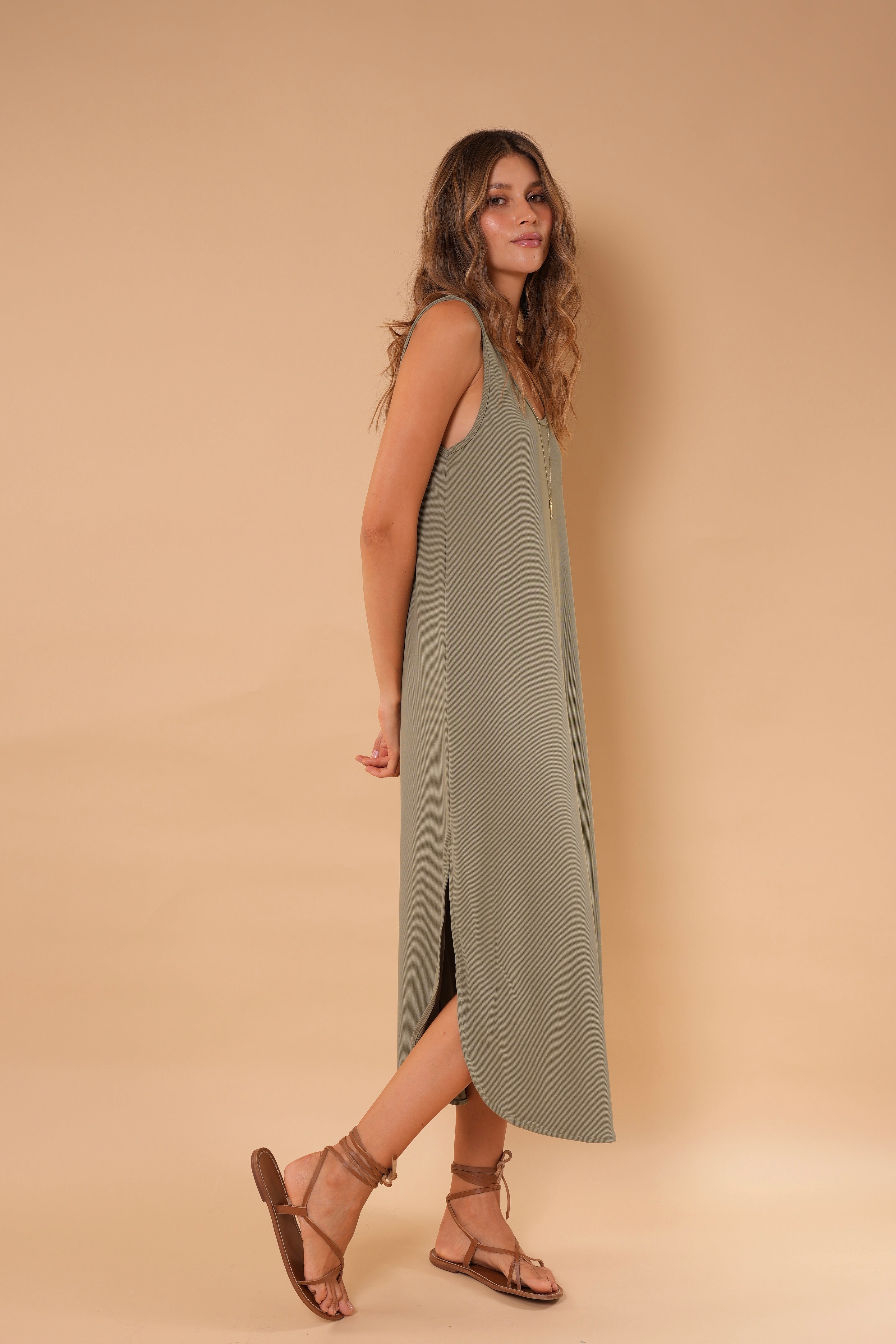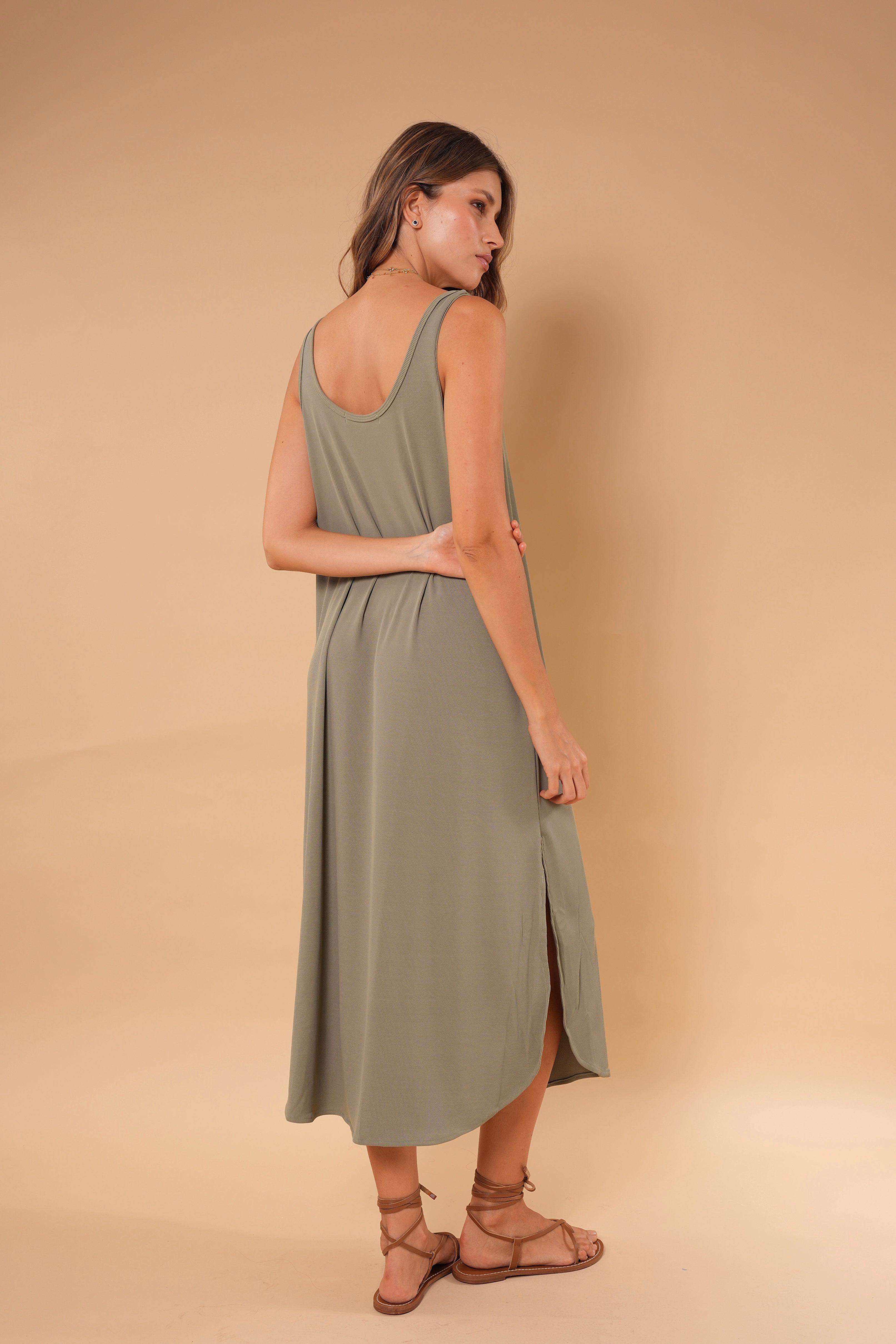 Vestido verde largo básico, en tela Rib con elongación, manga sisa y abertura al costado de la falda, fresco y cómodo.
