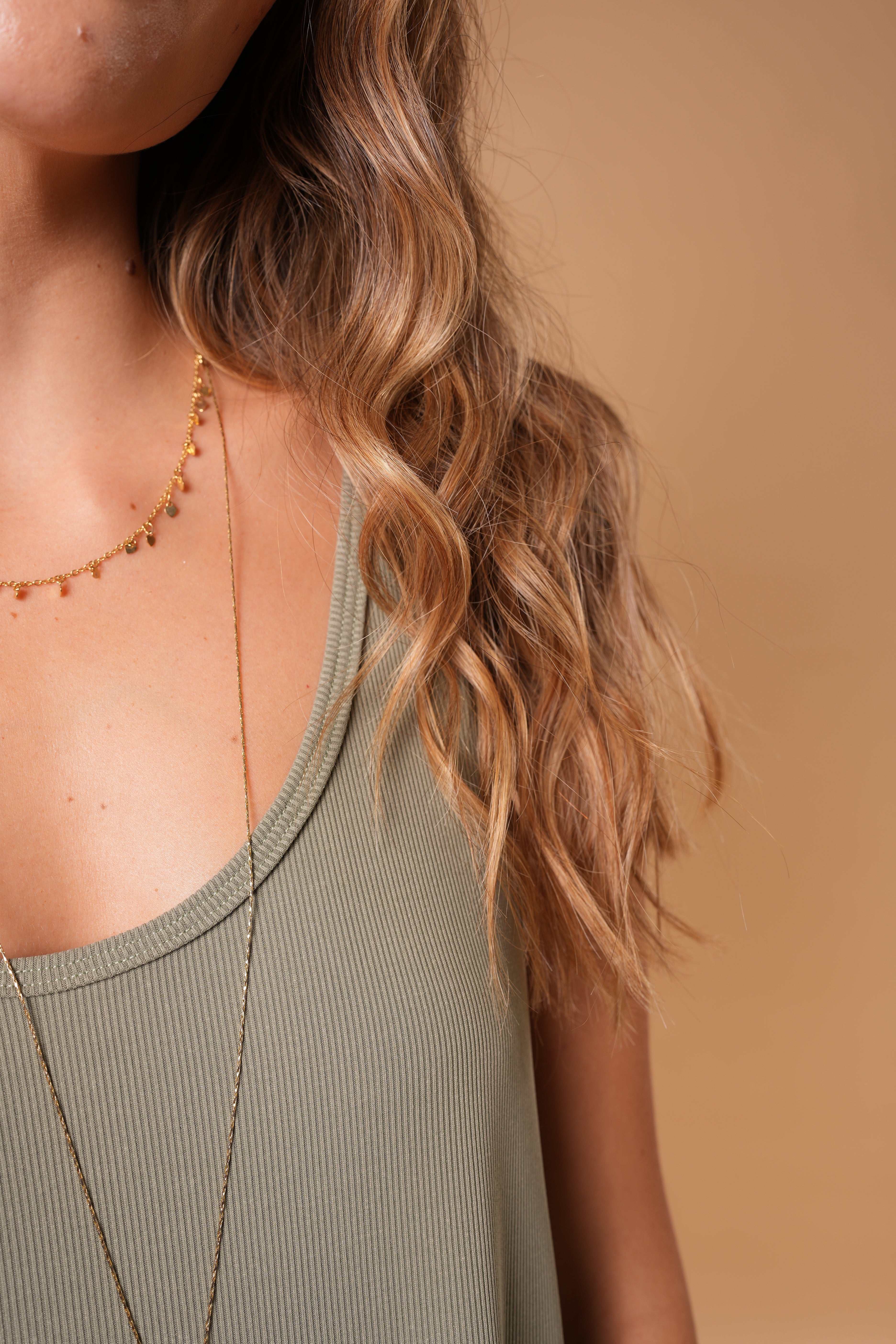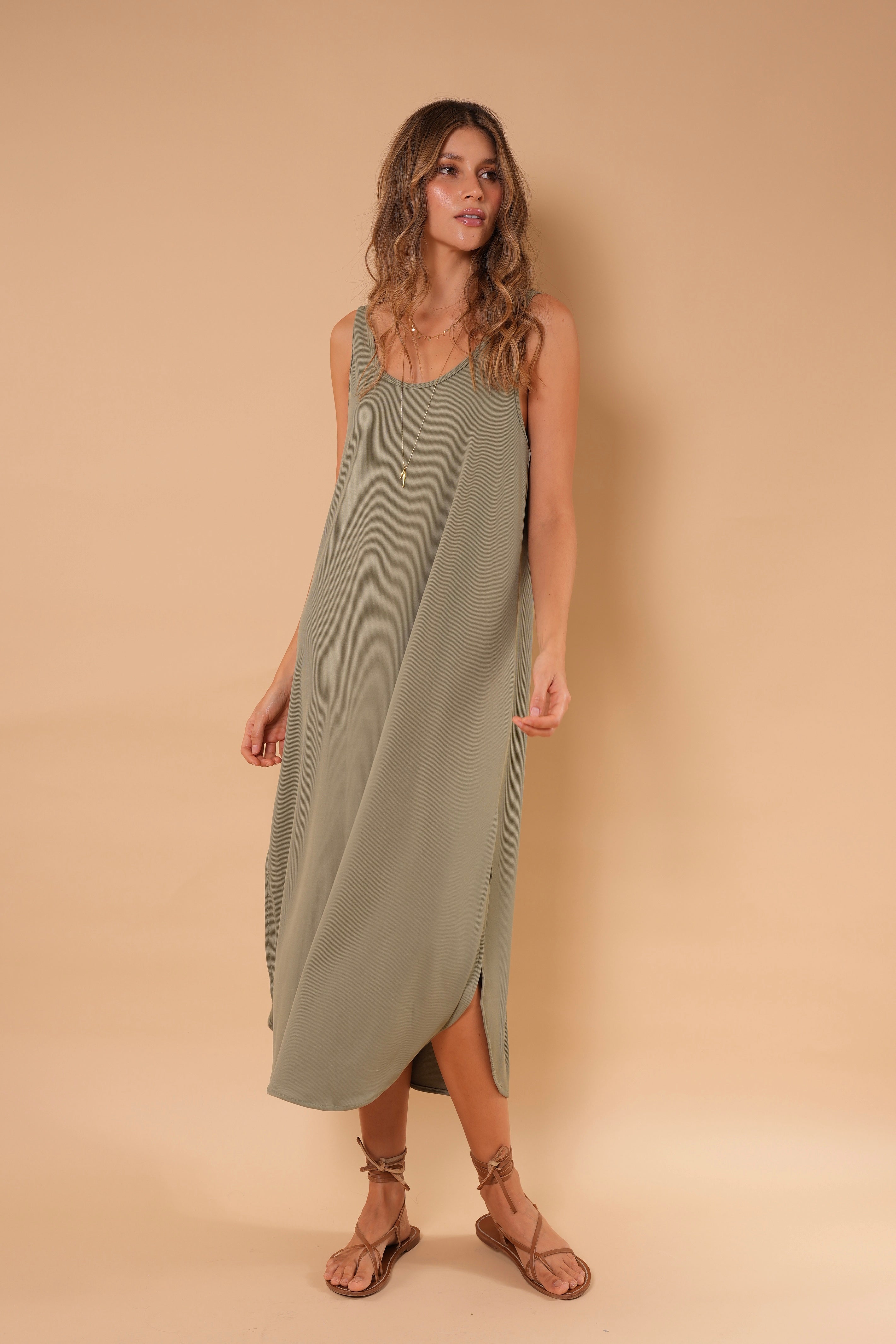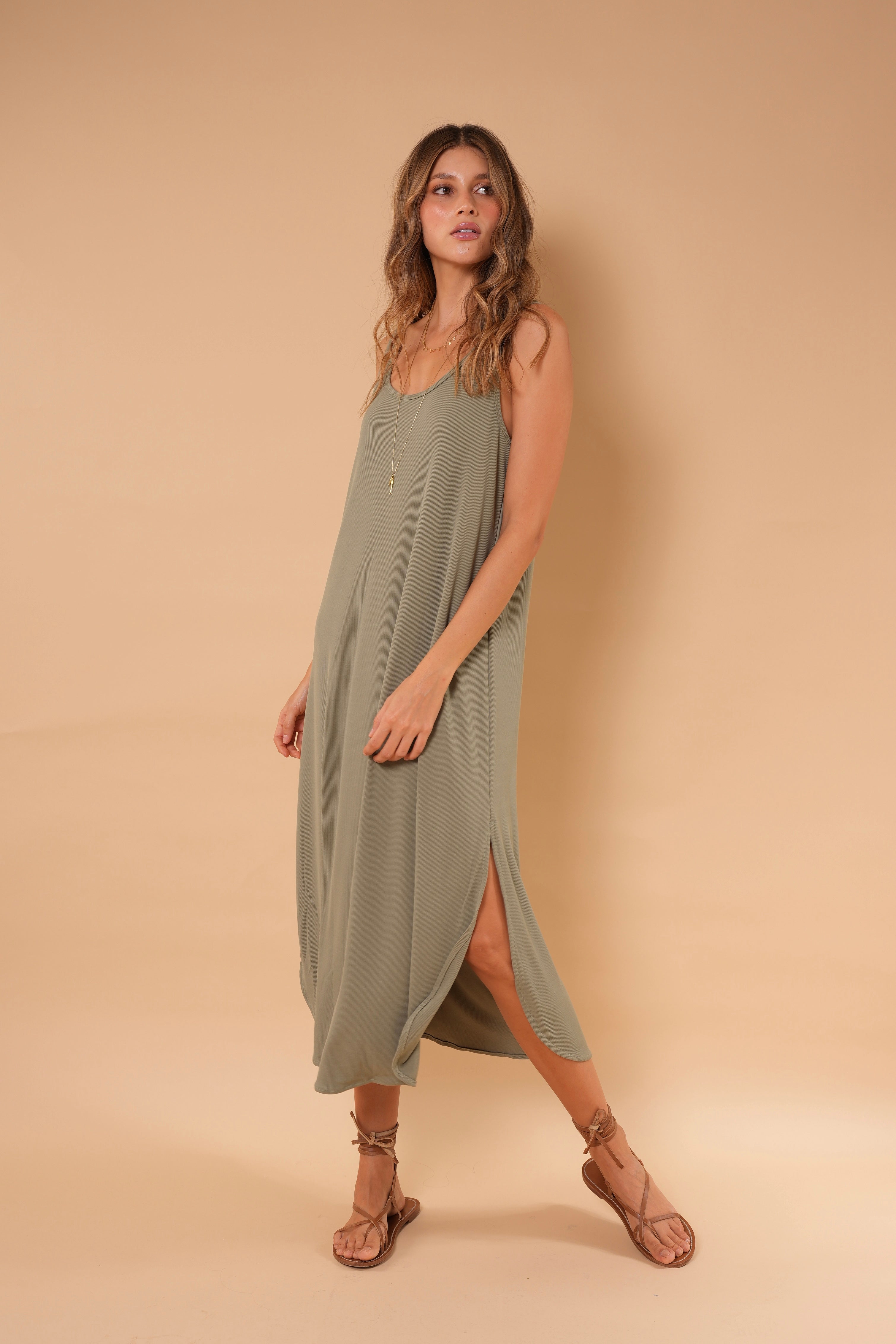 Vestido verde largo básico, en tela Rib con elongación, manga sisa y abertura al costado de la falda, fresco y cómodo.