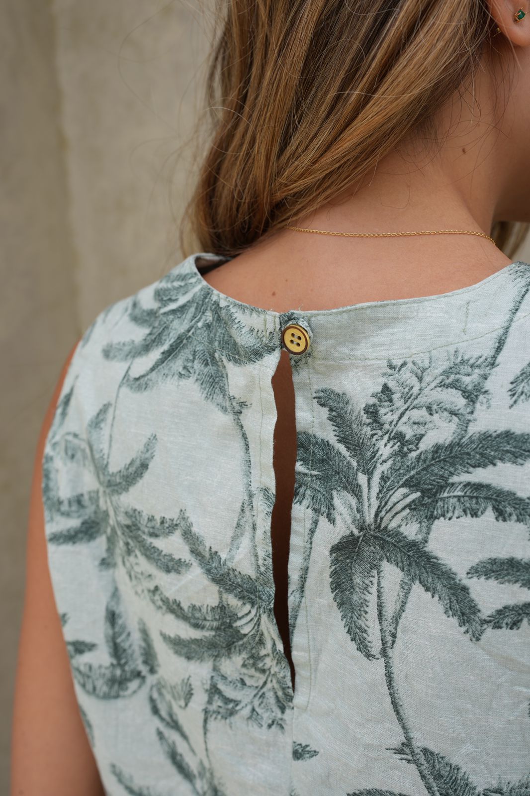 Blusa verde con estampado de palmas manga sisa en tela rayón tipo lino , silueta corta, cuello redondo ajustado con botón.