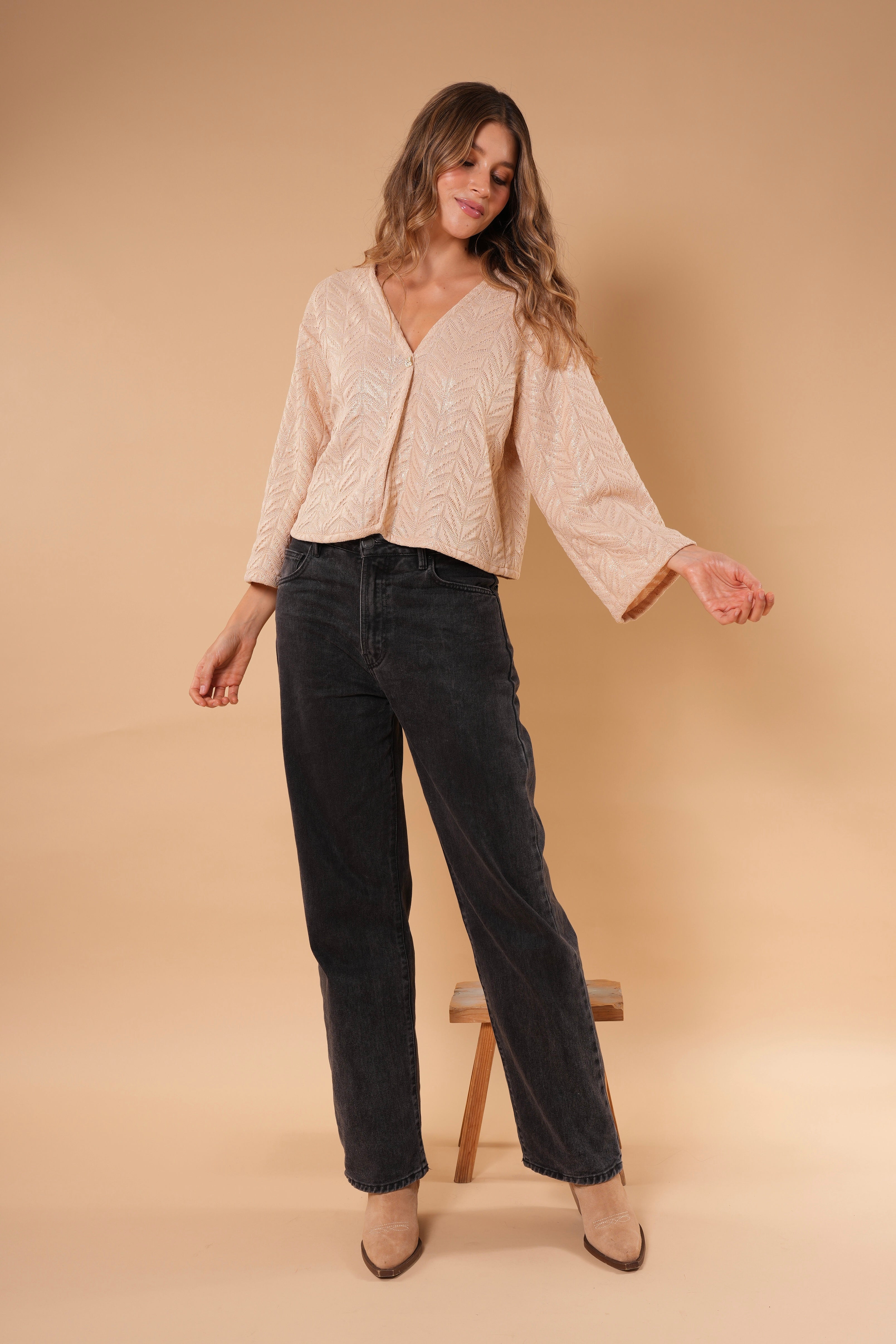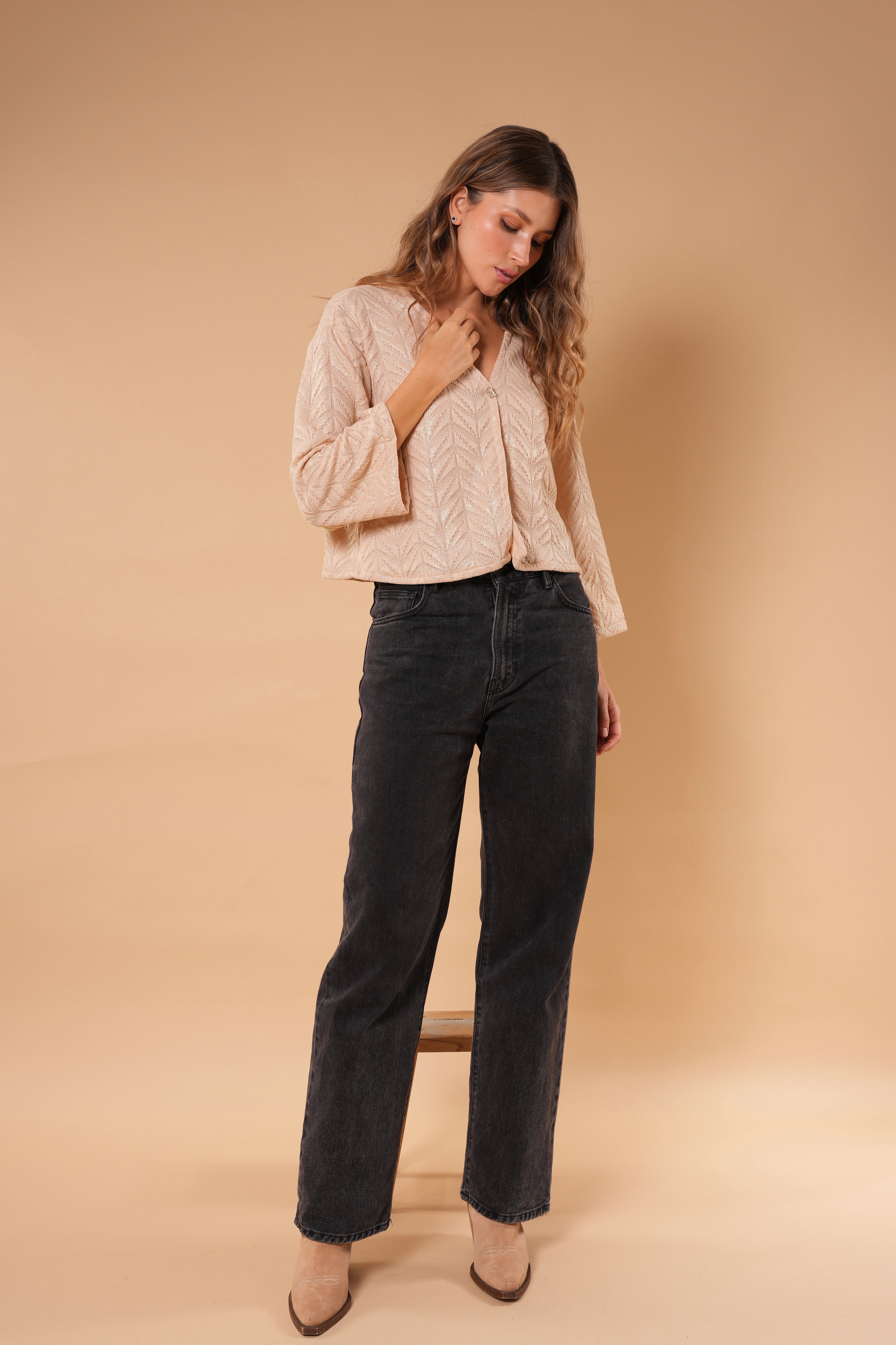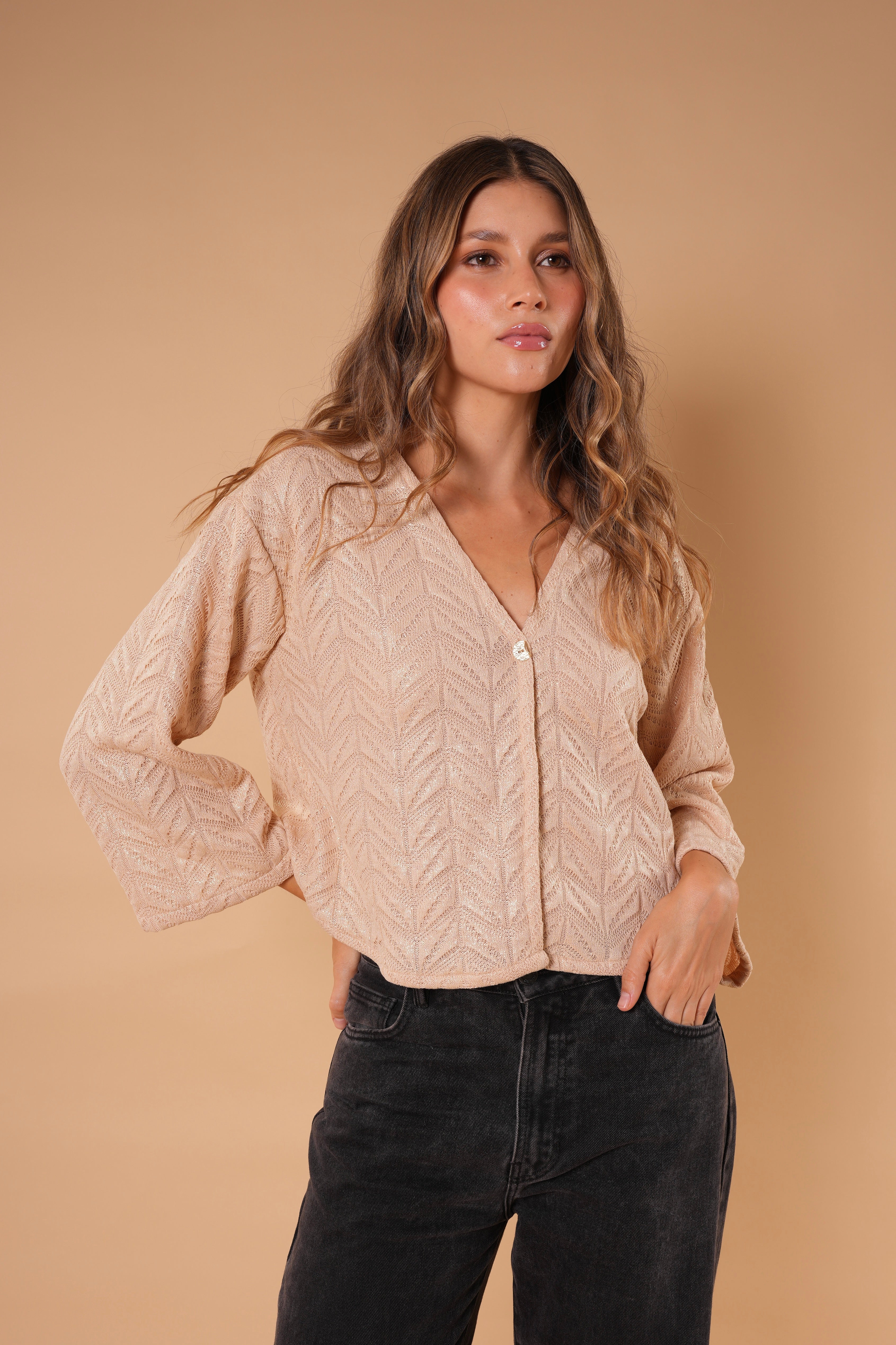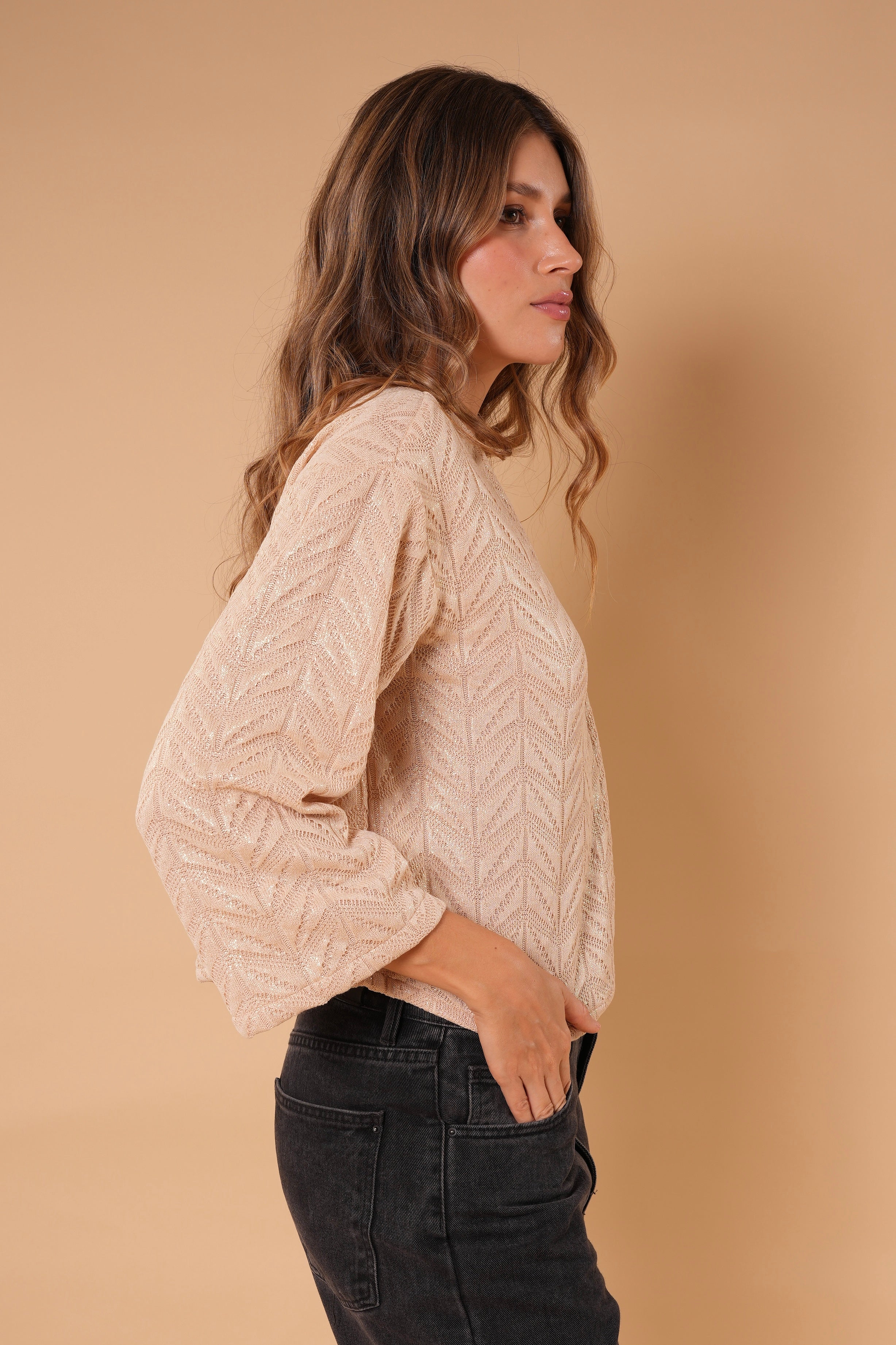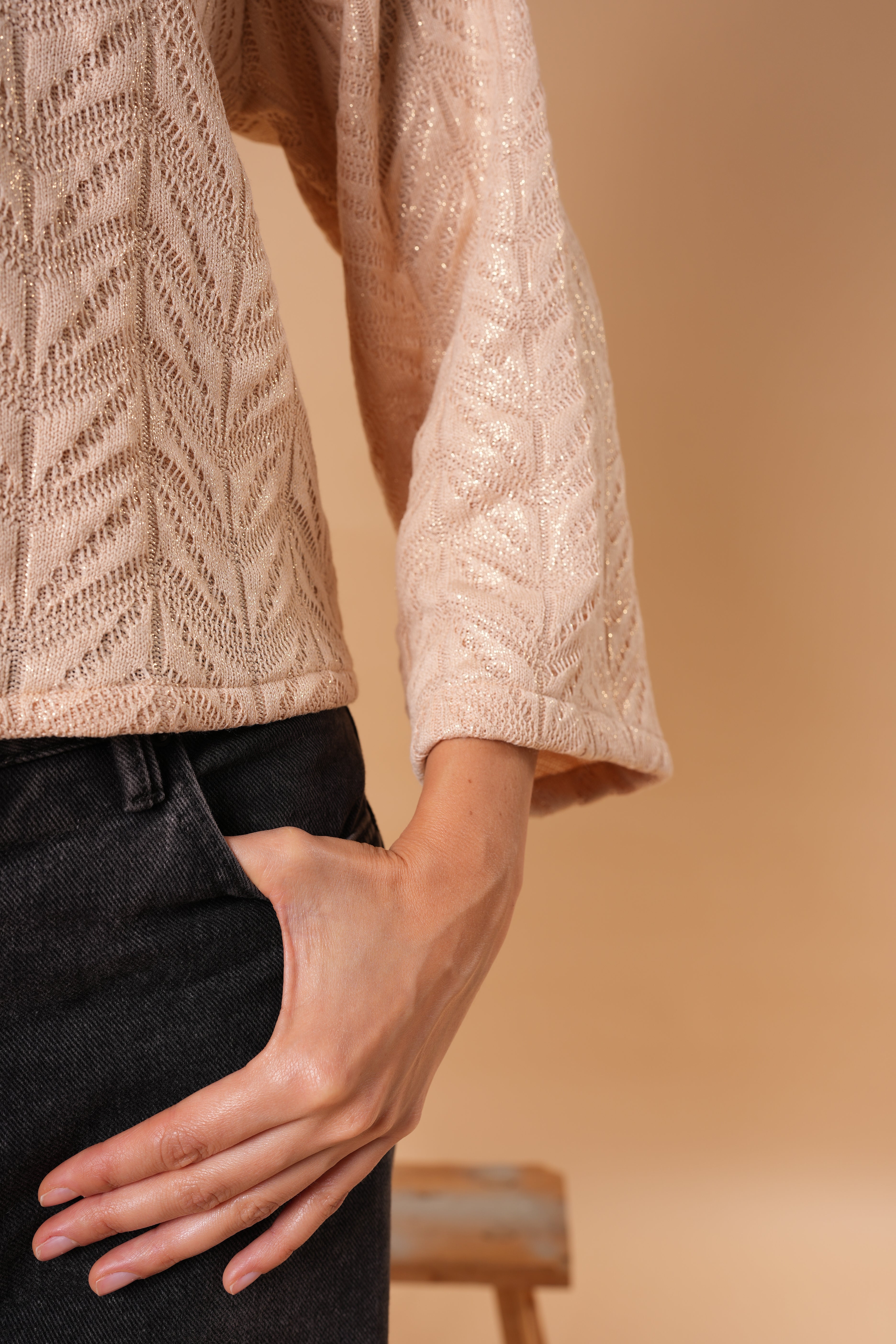 Blusa tejida manga midi ancha con escote en V, con sutiles brillos , ajustable al frente con un delicado botón