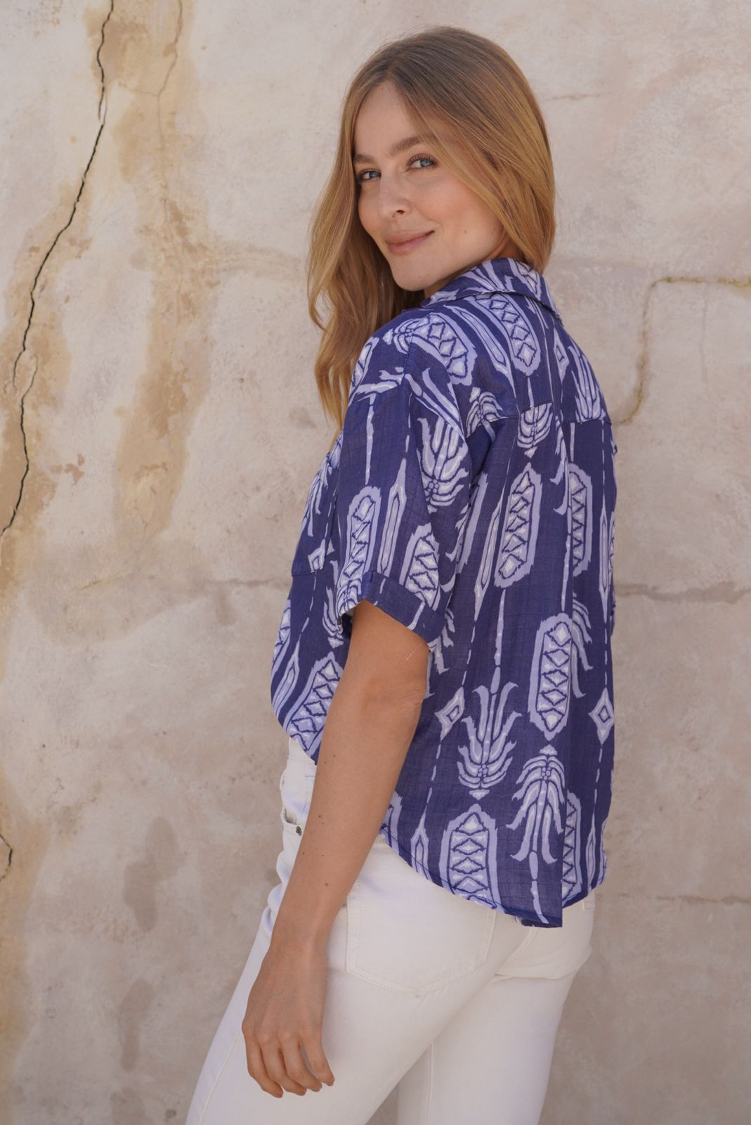 Camisa azul navy con estampado de piñas manga corta en tela rayón, cuello, botones funcionales, y bolsillo.