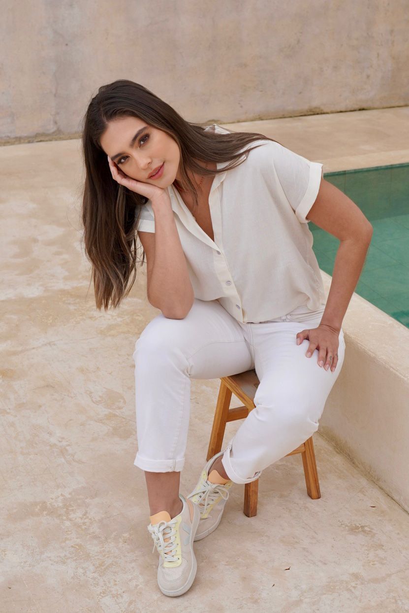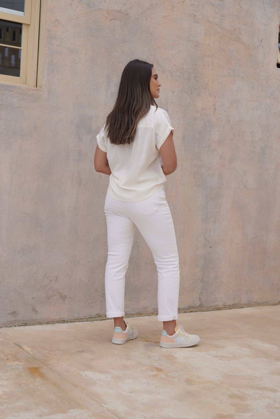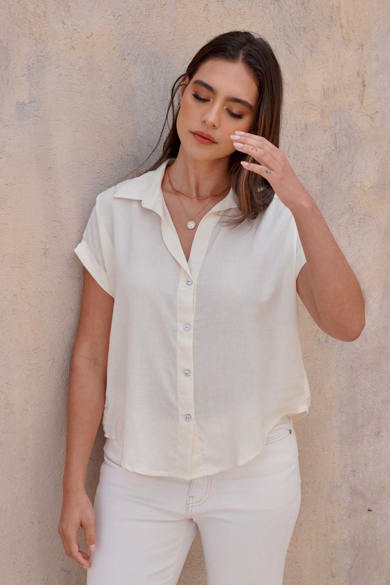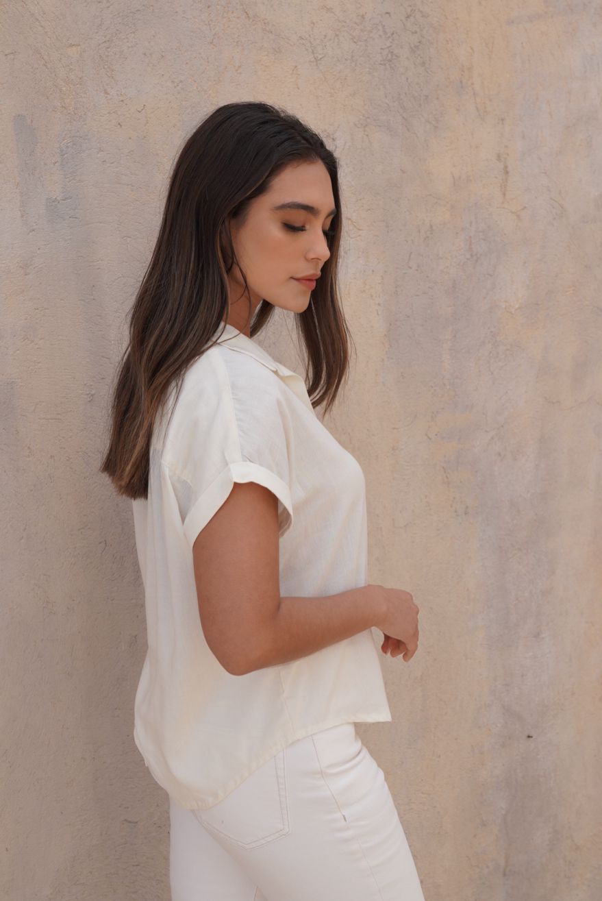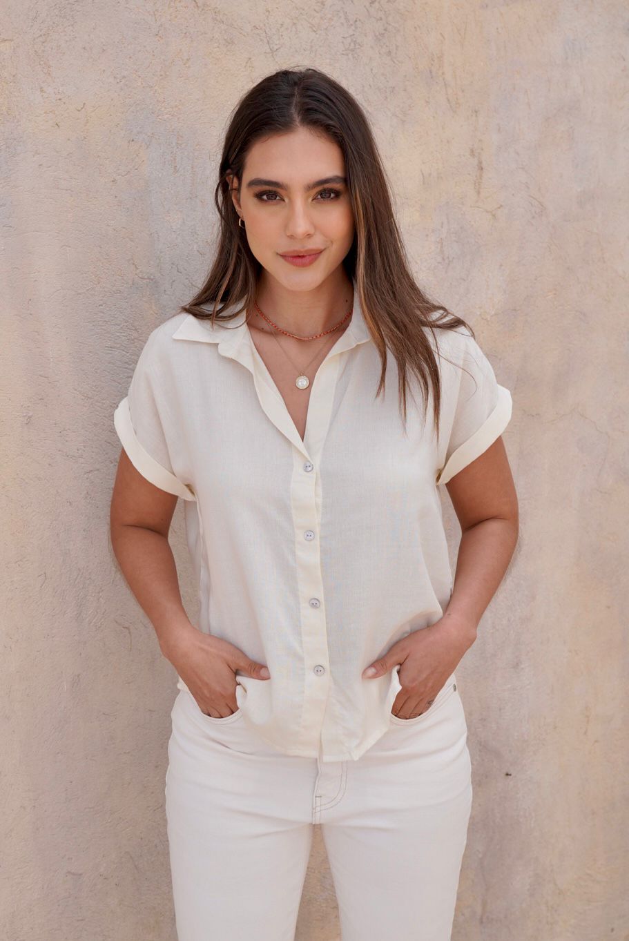 Camisa crudo básica de manga corta en tela rayón, con cuello, botones funcionales tipo nácar y delicados detalles .
