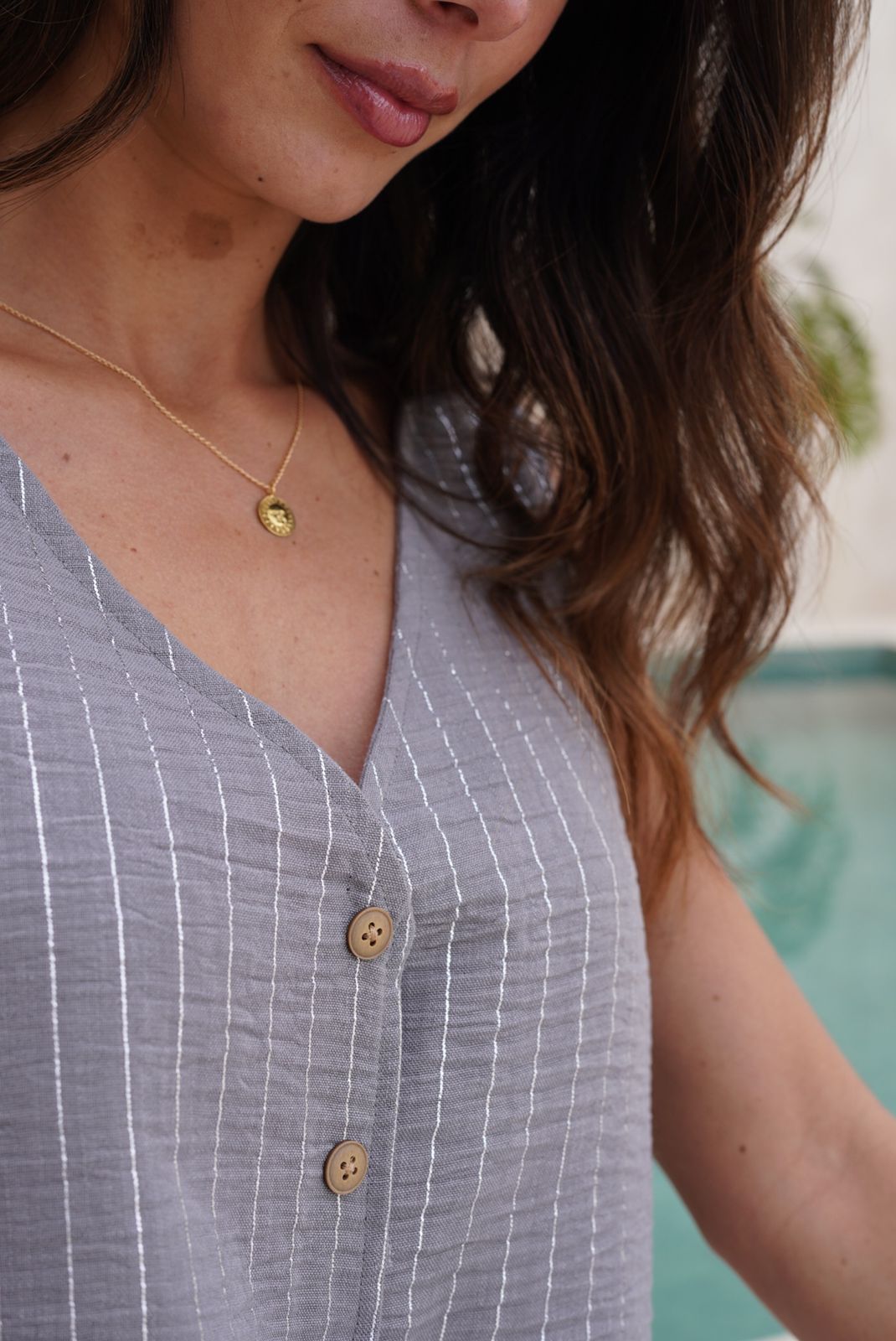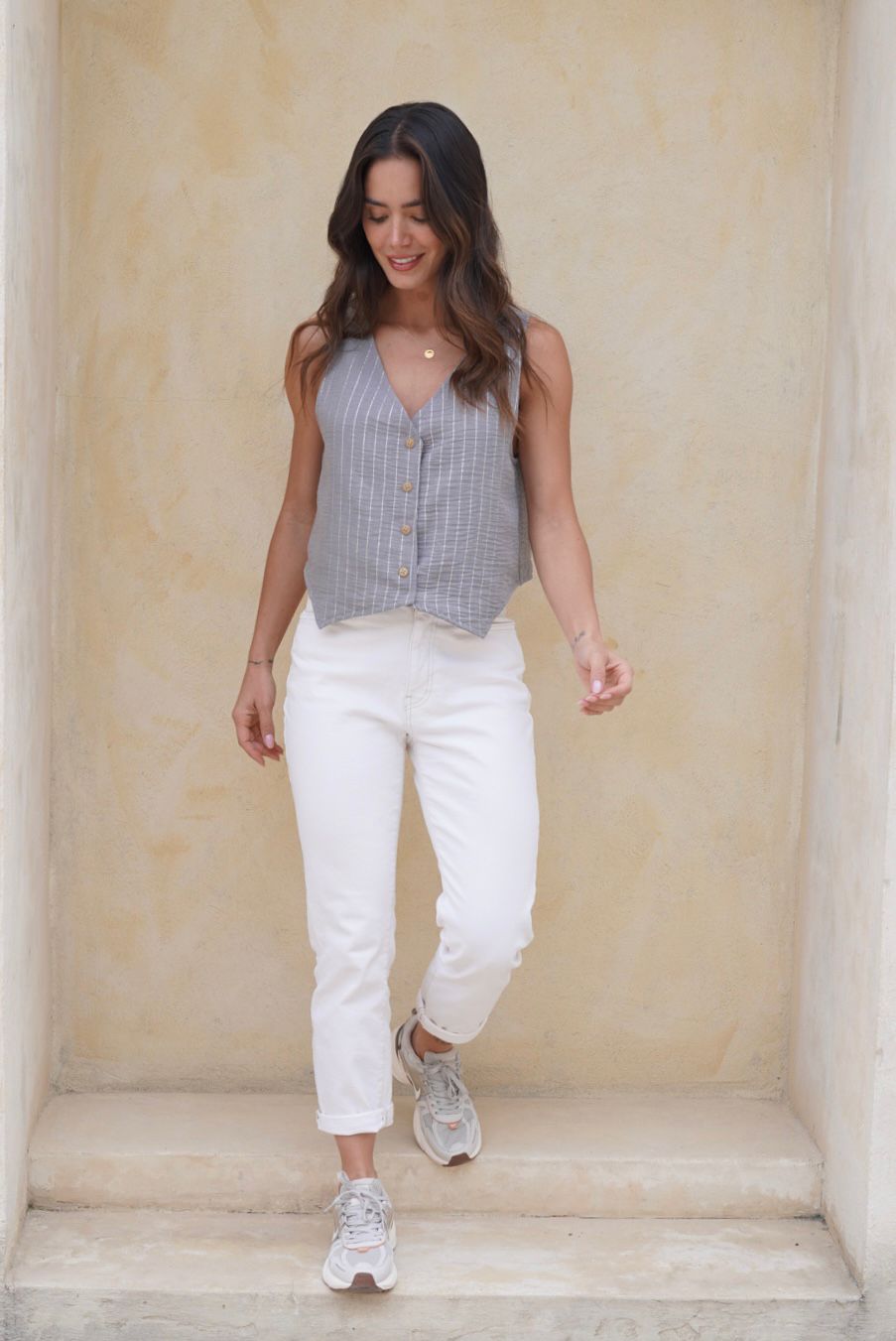 Chaleco gris con líneas plateadas, en tela poliéster de diseño liviano con escote en V y botones. Úsalo en set con el pantalón Xian Milan.