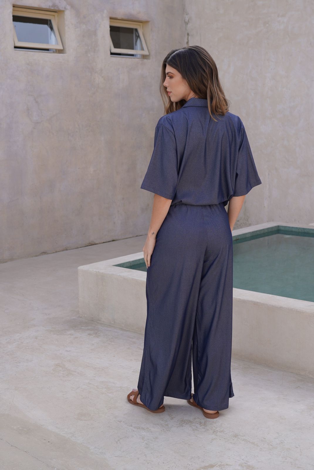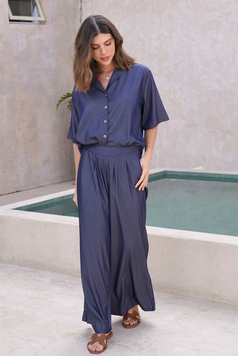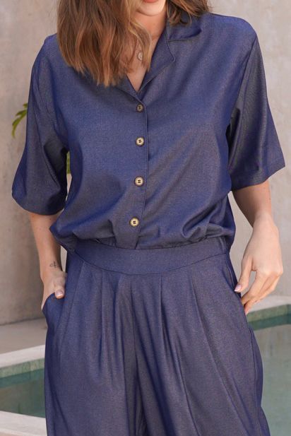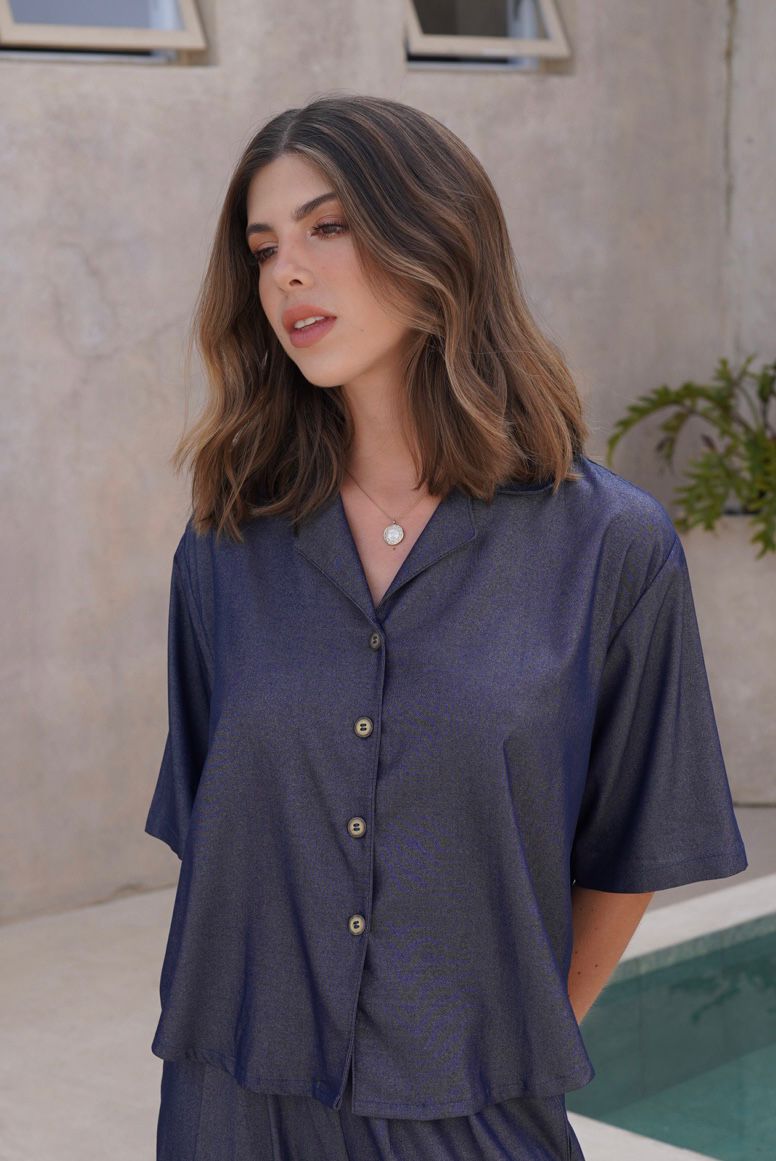 Camisa azul oscuron manga corta silueta amplia en tela rayón con brillo y botones funcionales.