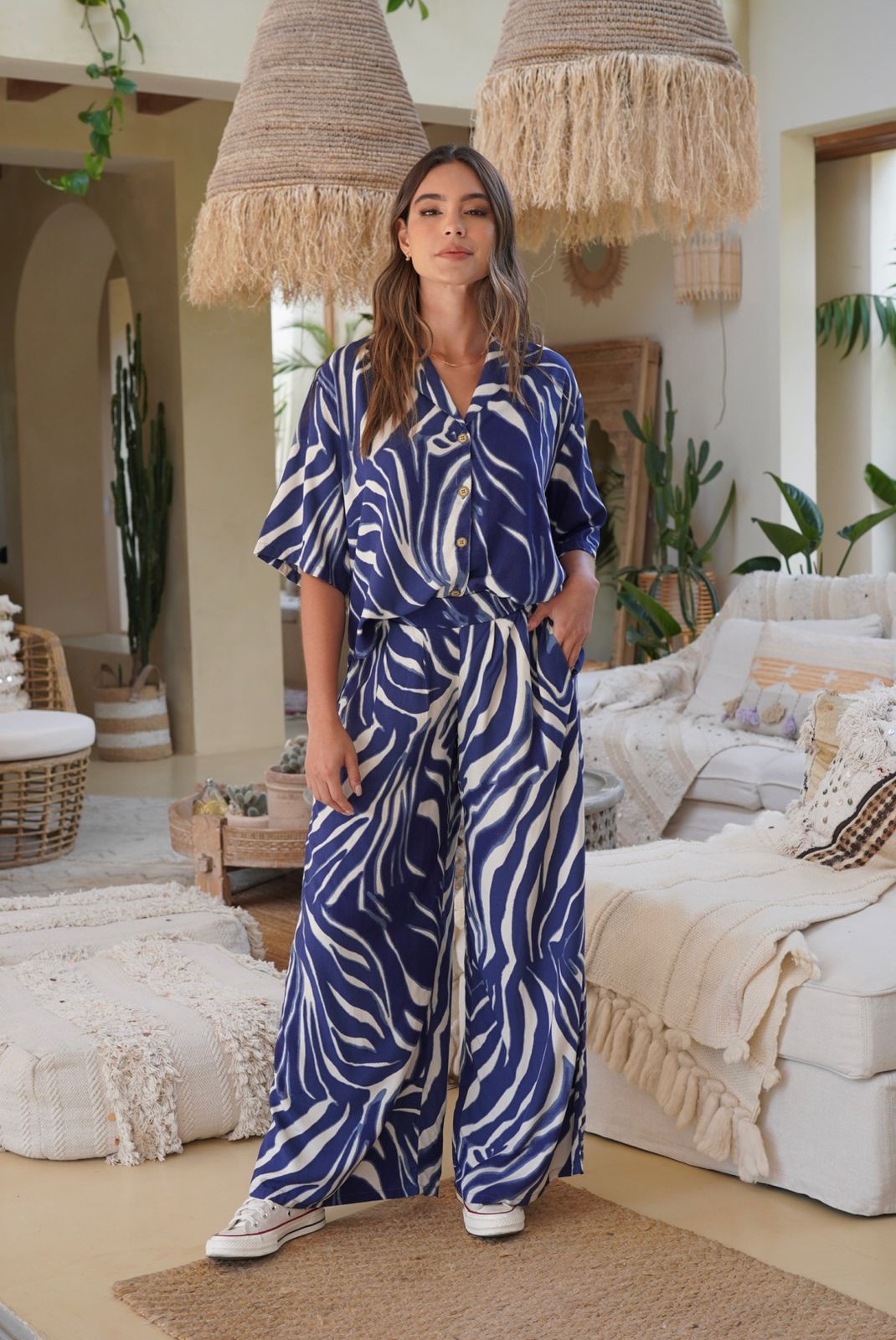 Pantalón azul con bota ancha con resorte en pretina y bolsillos, en tela rayón.