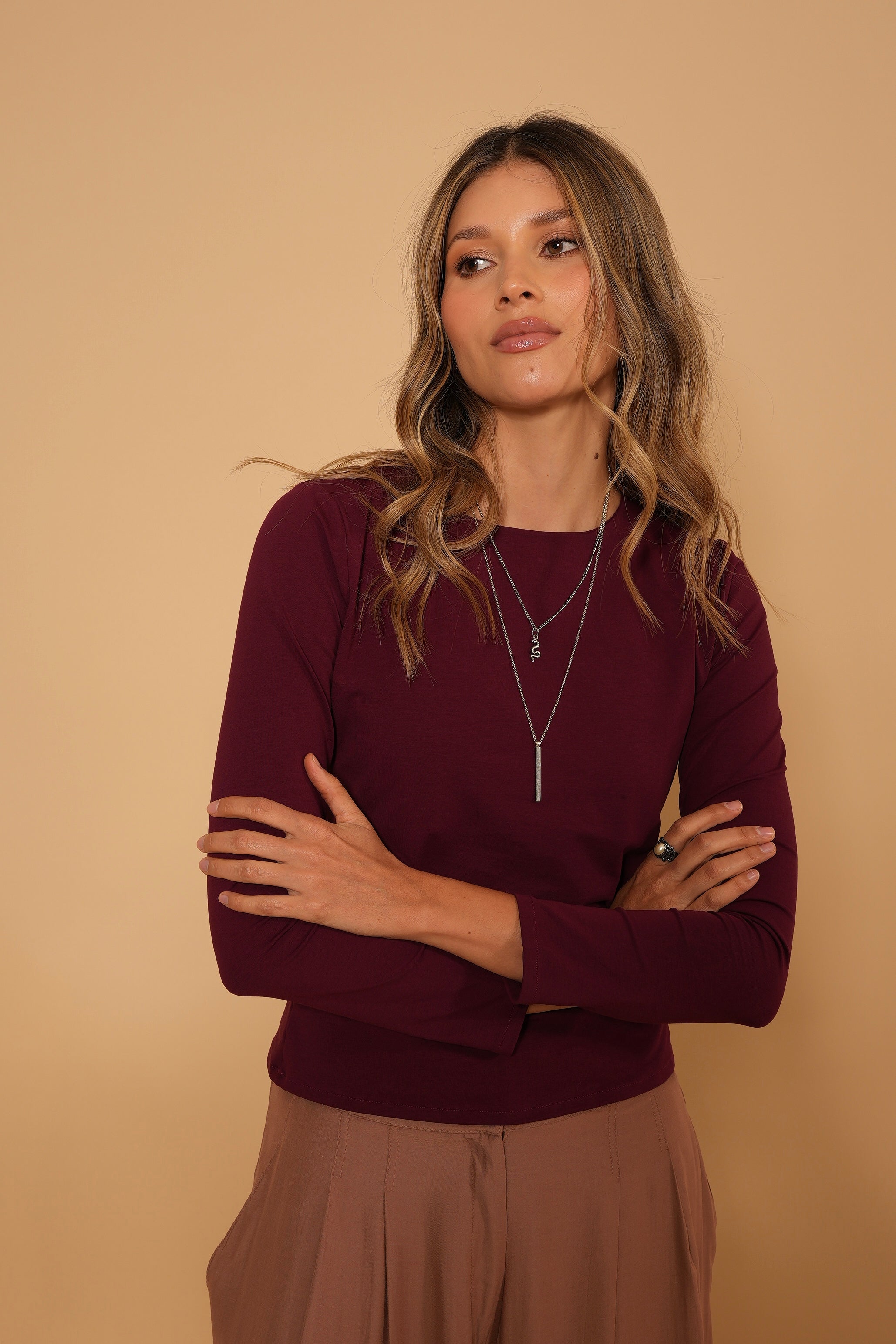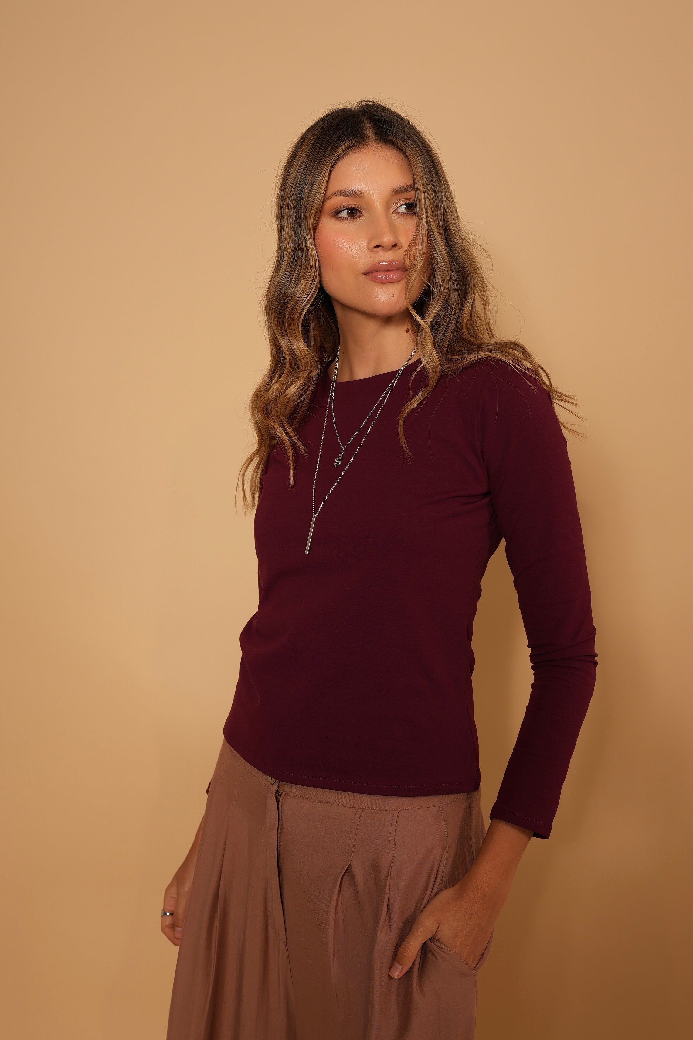 Buzo básico vinotinto de manga larga con silueta ajustada y cuello redondo. El fit limpio lo hace ideal para usar solo o como pieza base para capas, mientras que el color sólido aporta versatilidad para combinar con diferentes tonos y estilos.