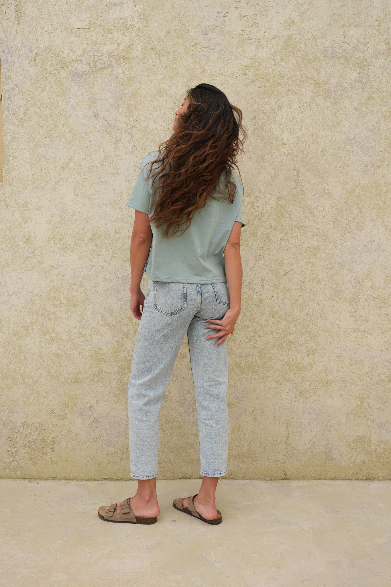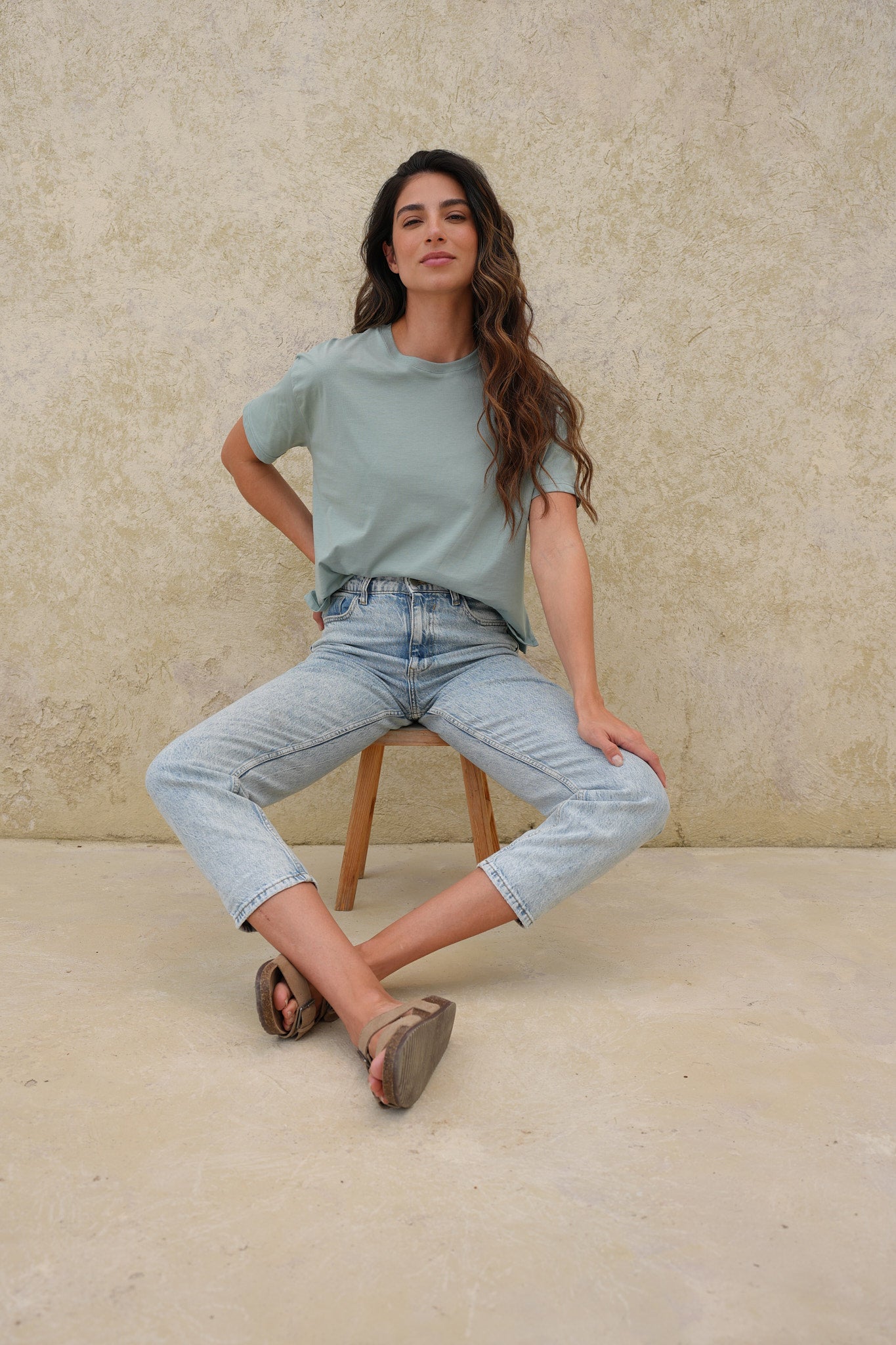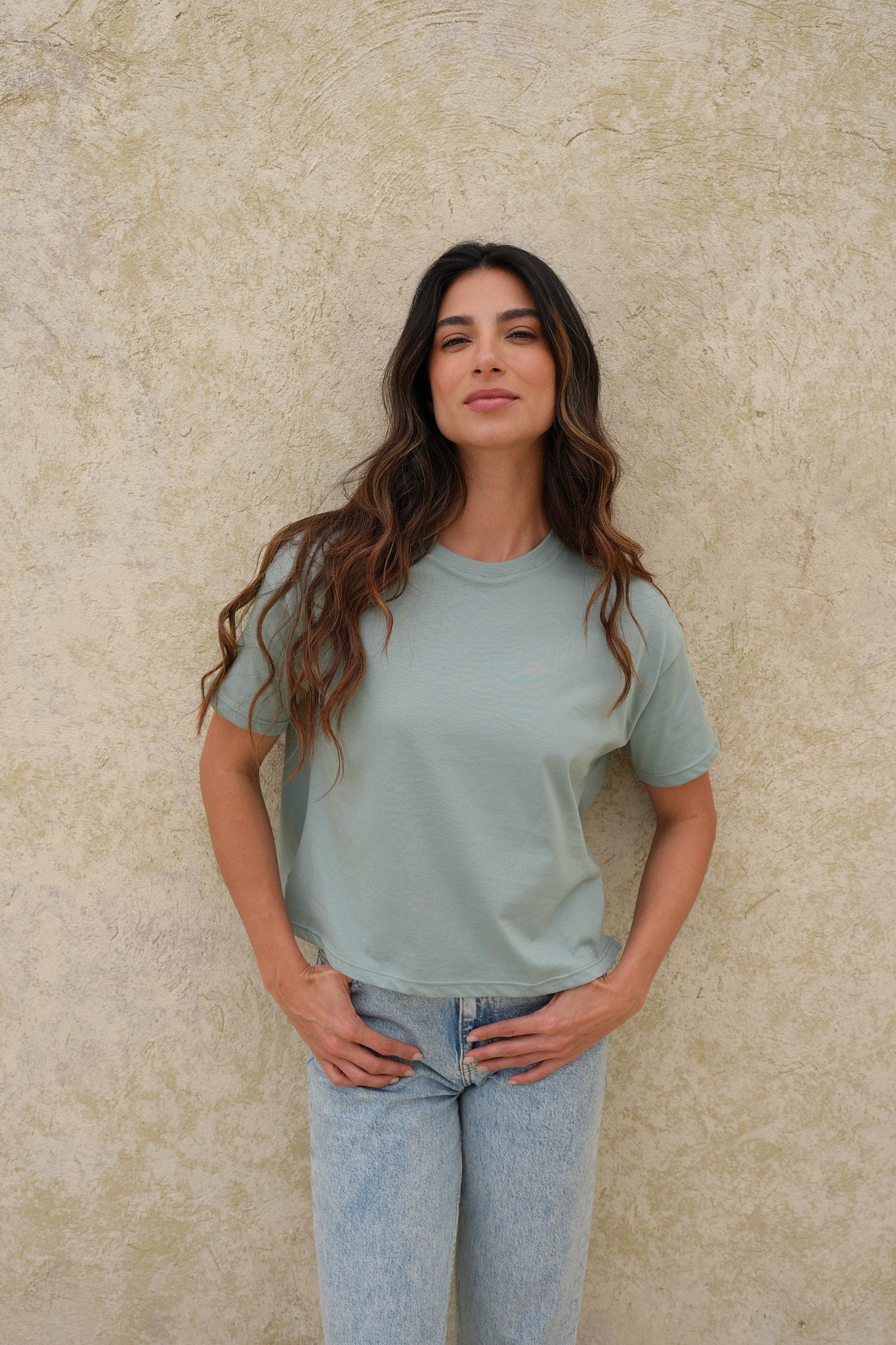 Camiseta verde menta básica de silueta relajada y manga corta, confeccionada en algodón Peruano para una sensación fresca y cómoda.