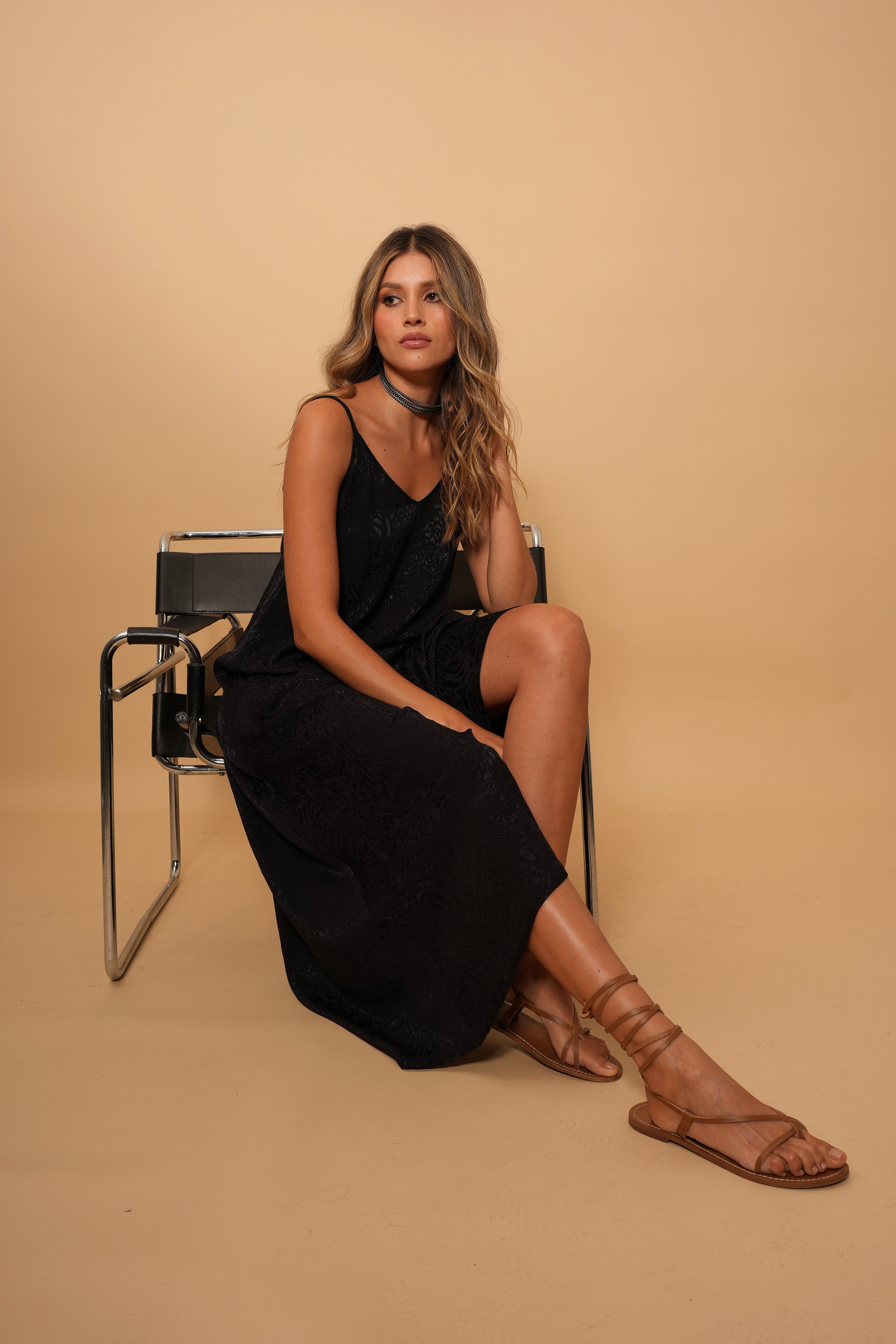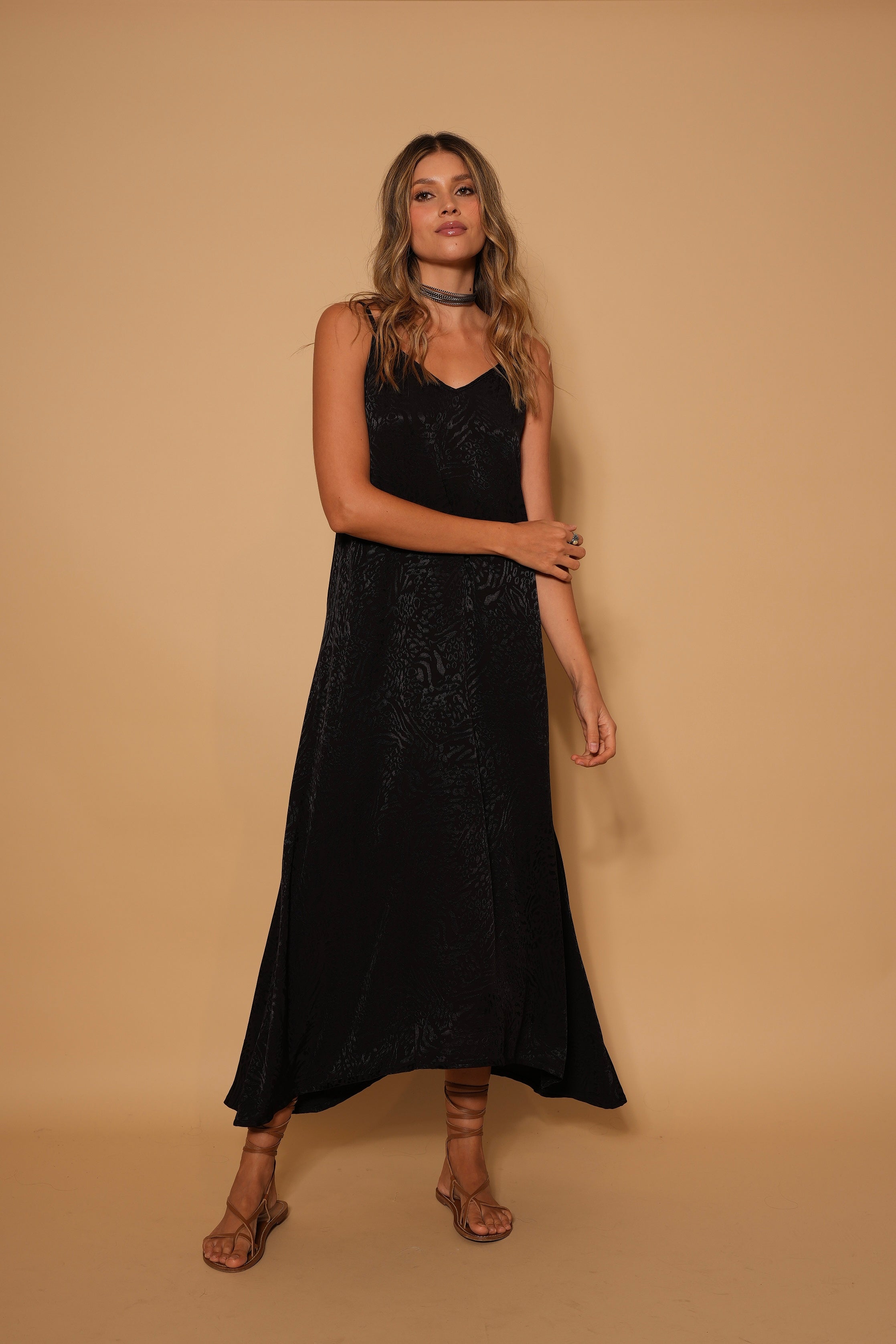 Vestido negro largo con textura leo, en tela rayón, de tirantes sisa con escote en la espalda, fresco y cómodo.