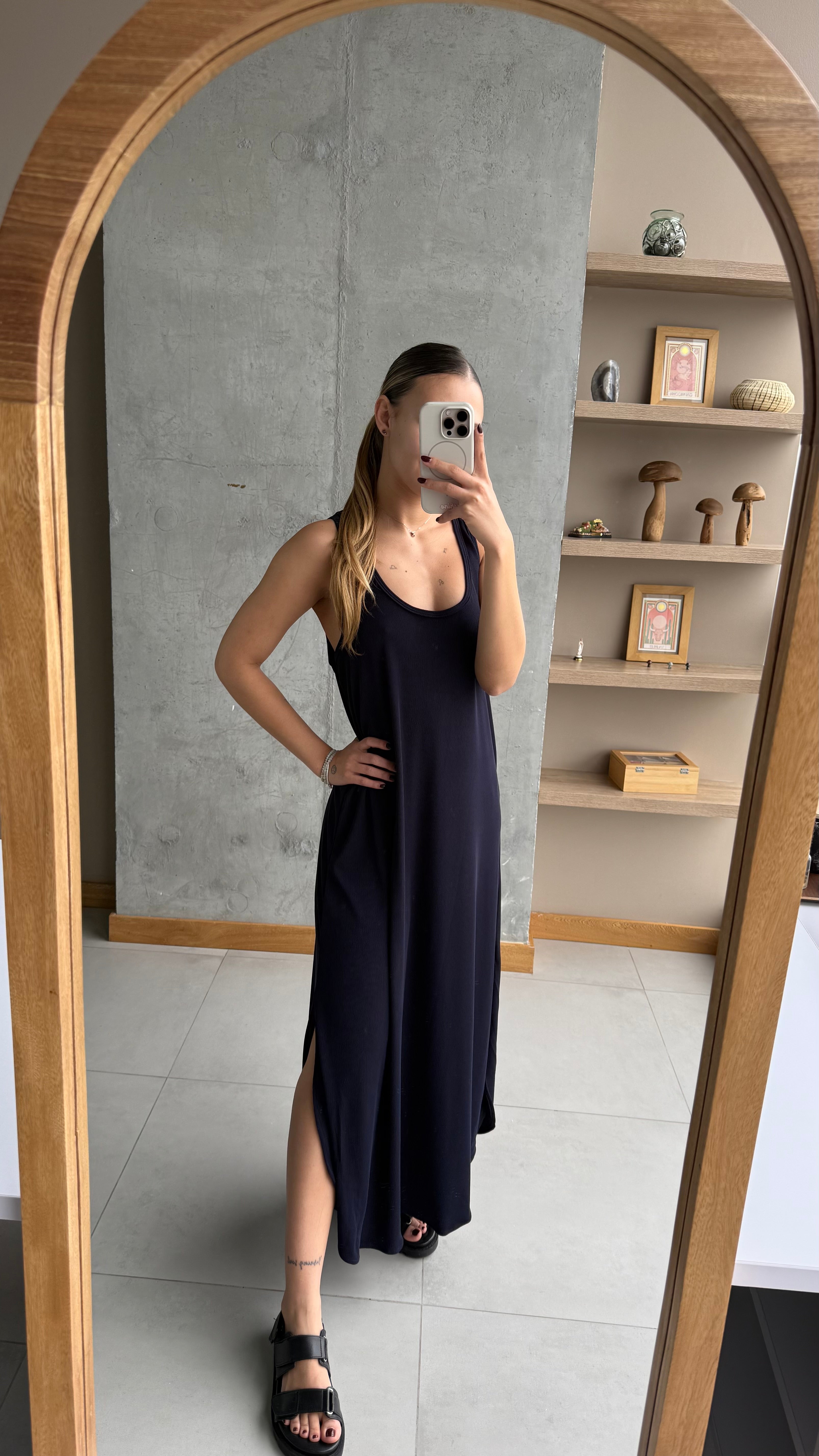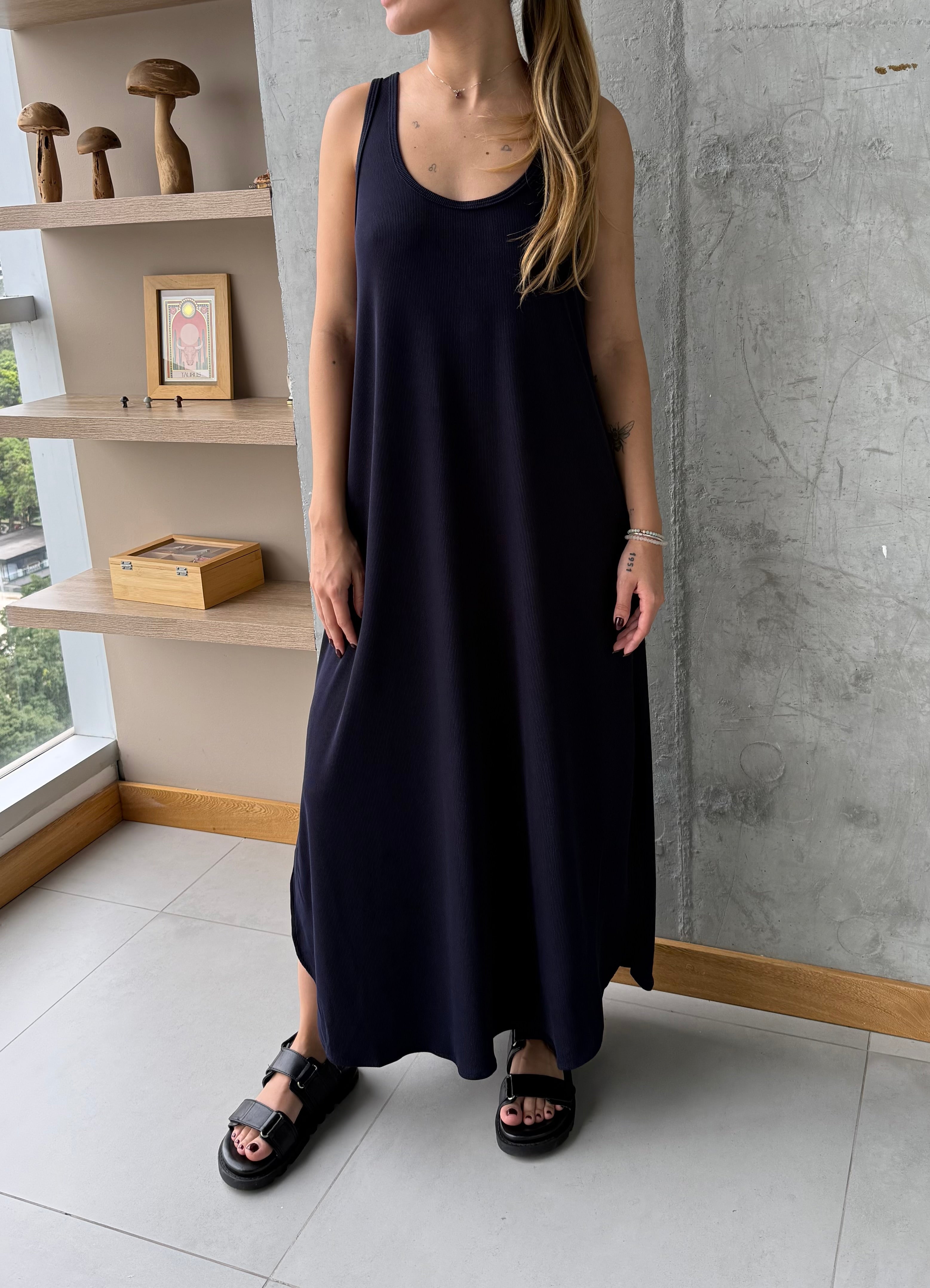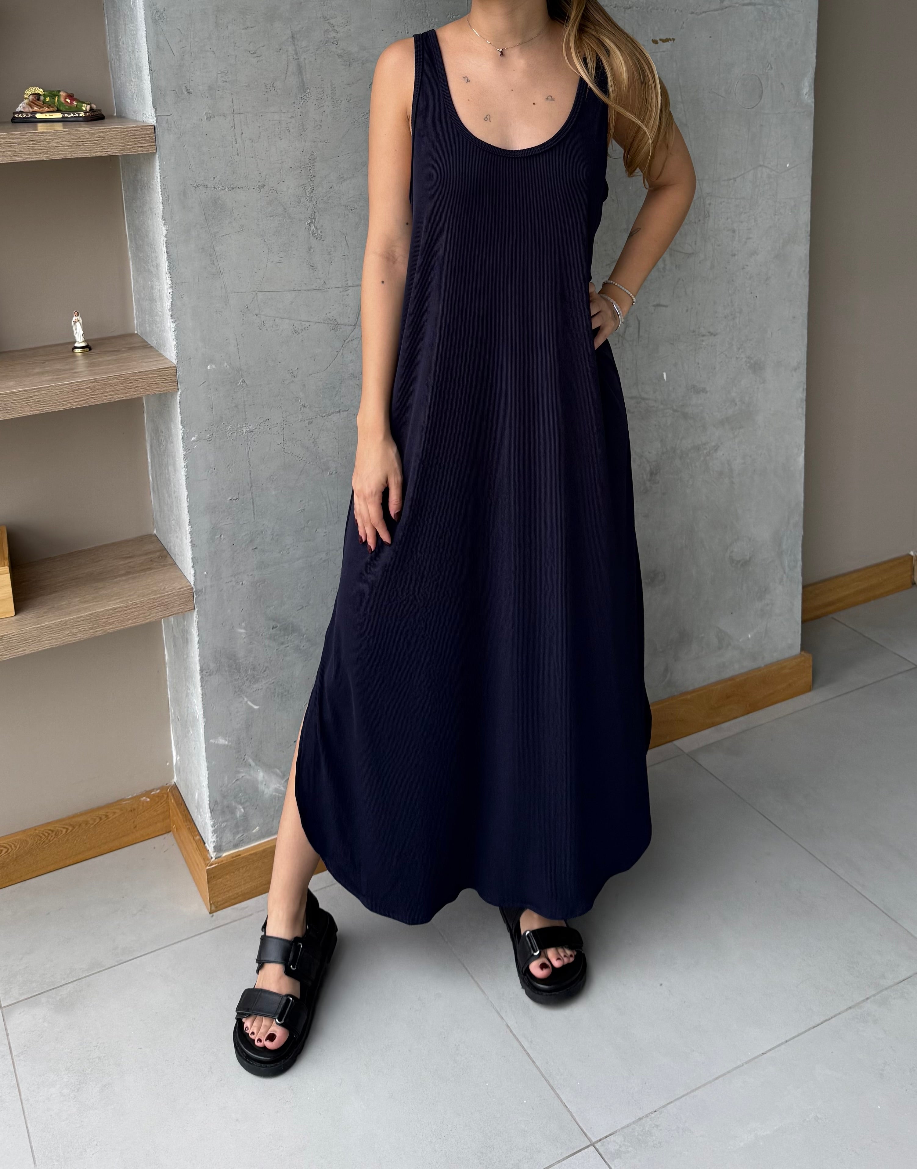 Vestido azul largo básico, en tela Rib con elongación, manga sisa y abertura al costado de la falda, fresco y cómodo.