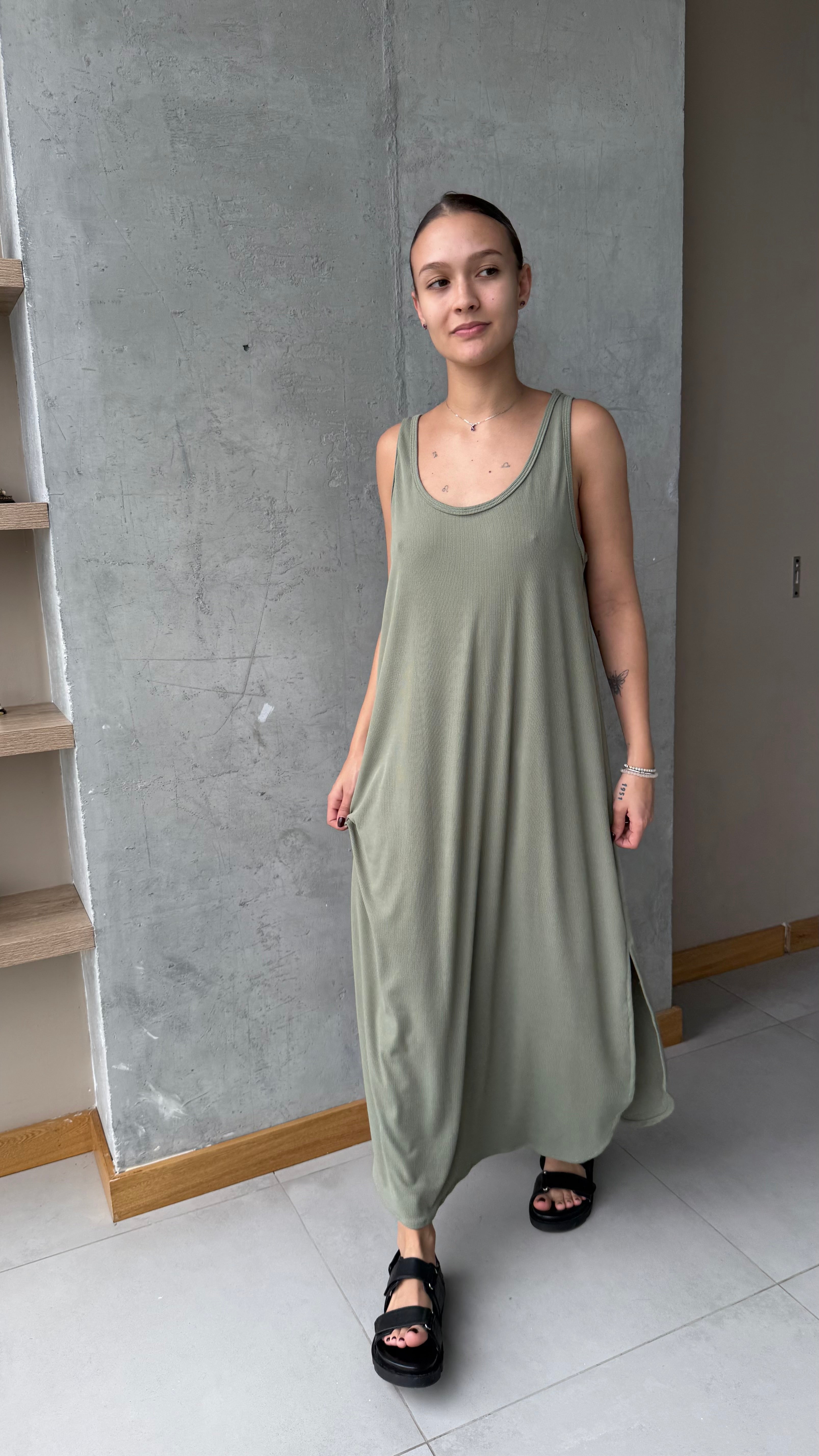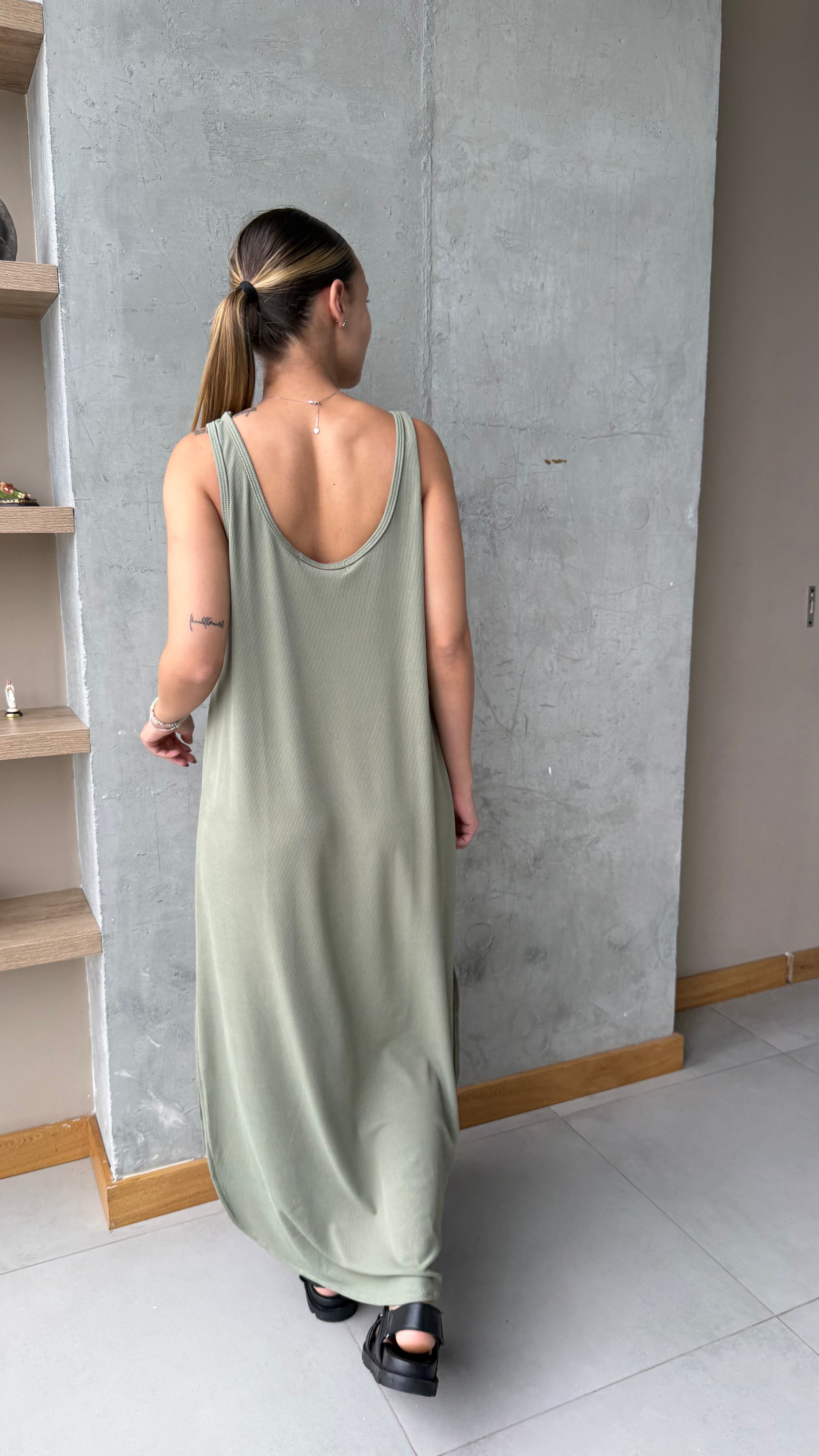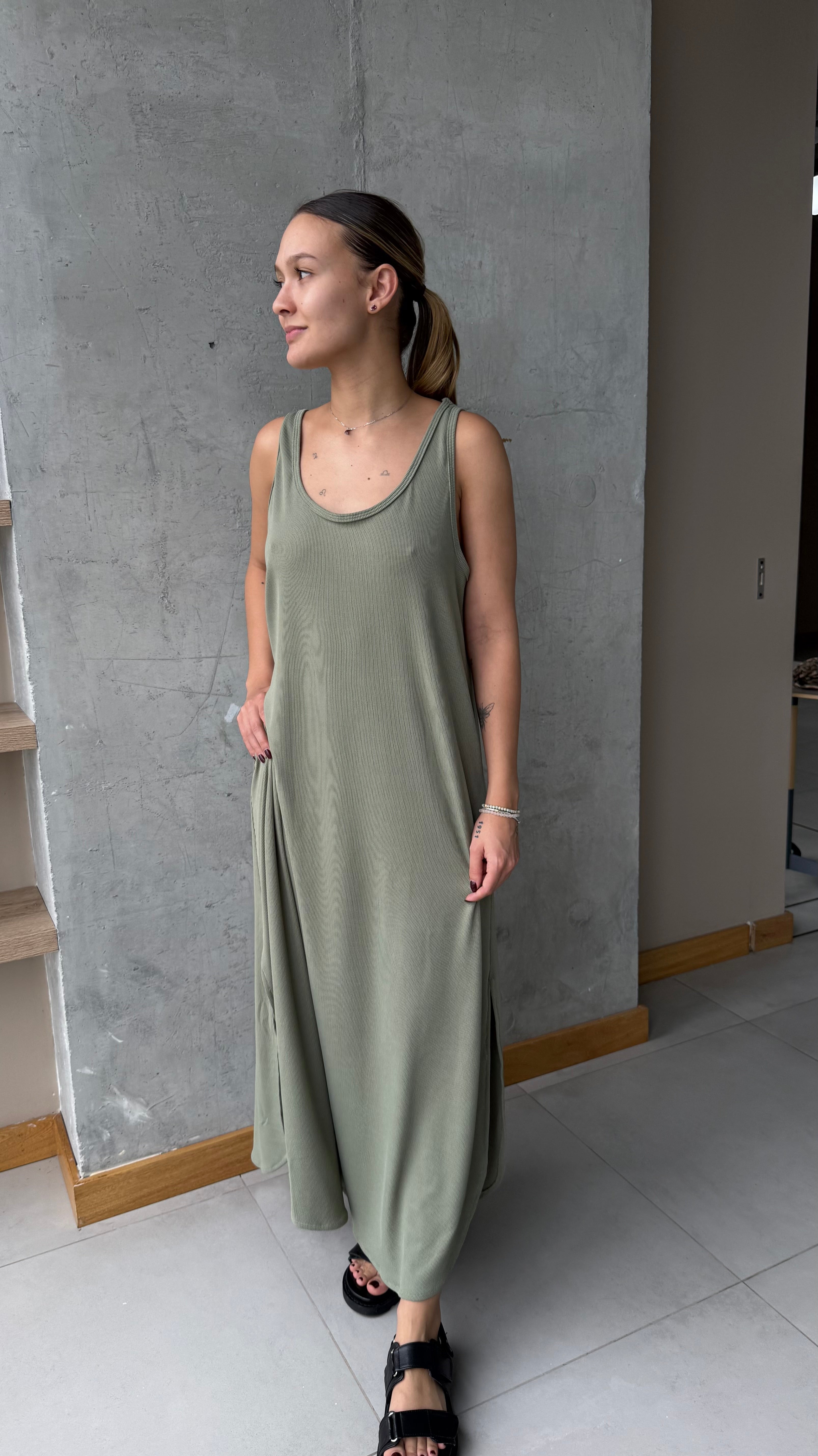 Vestido verde largo básico, en tela Rib con elongación, manga sisa y abertura al costado de la falda, fresco y cómodo.