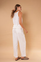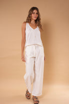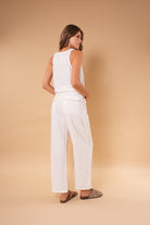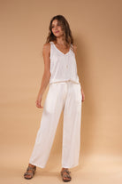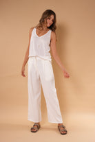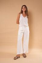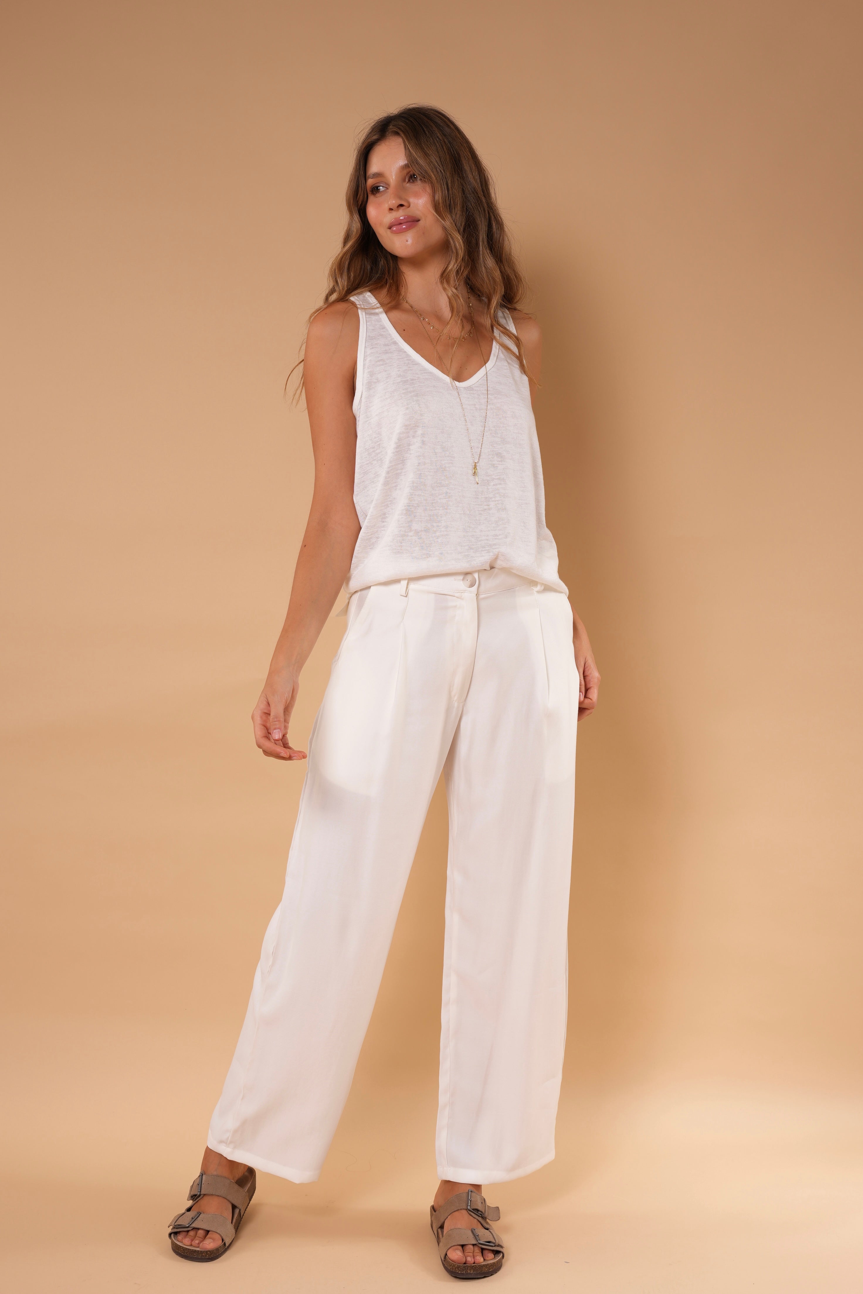 Nuestro pantalón palazzo en tono terracota combina estructura y fluidez en una silueta amplia que alarga visualmente la figura y aporta movimiento natural al caminar.
