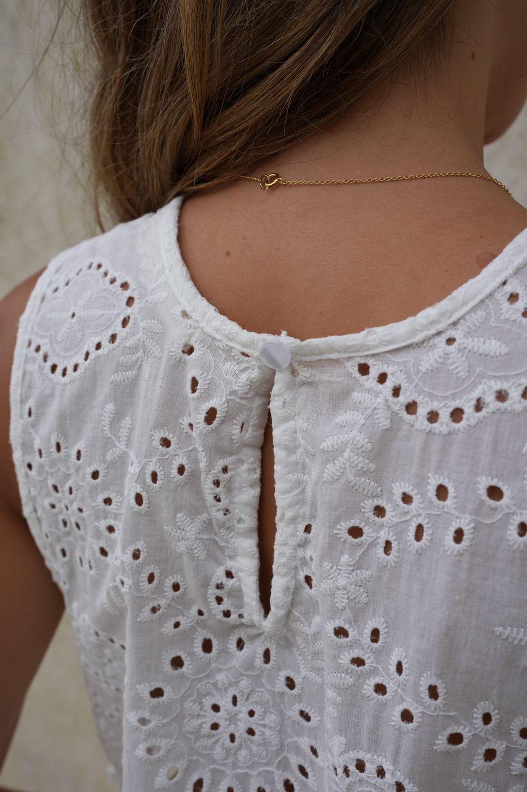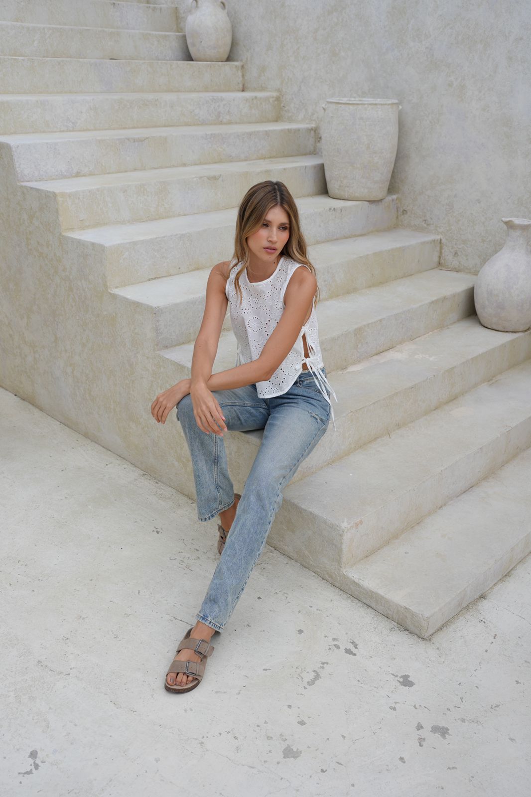 Blusa blanca crop en algodón bordado con detalles florales, ideal para looks frescos y casuales. Su diseño sin mangas con costados ajustables mediante lazos la convierte en una prenda versátil, perfecta para combinar.
