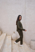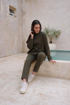 Buzo en tela burda liviana color verde militar, diseñado para ofrecer frescura y comodidad. Su textura suave lo convierte en un básico ideal para el día a día, mientras que la costura central y su fit relajado aportan un aire moderno y minimalista.