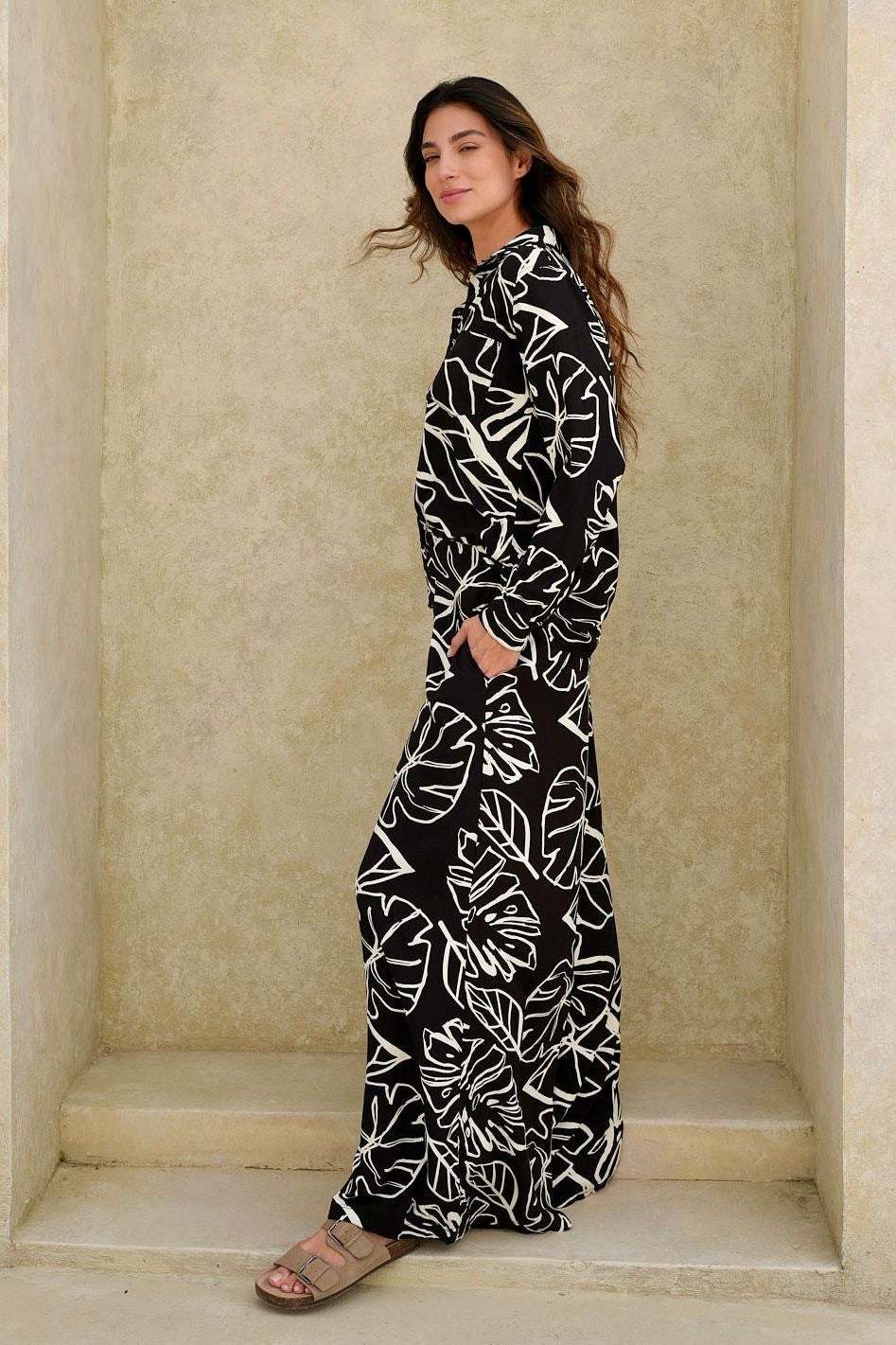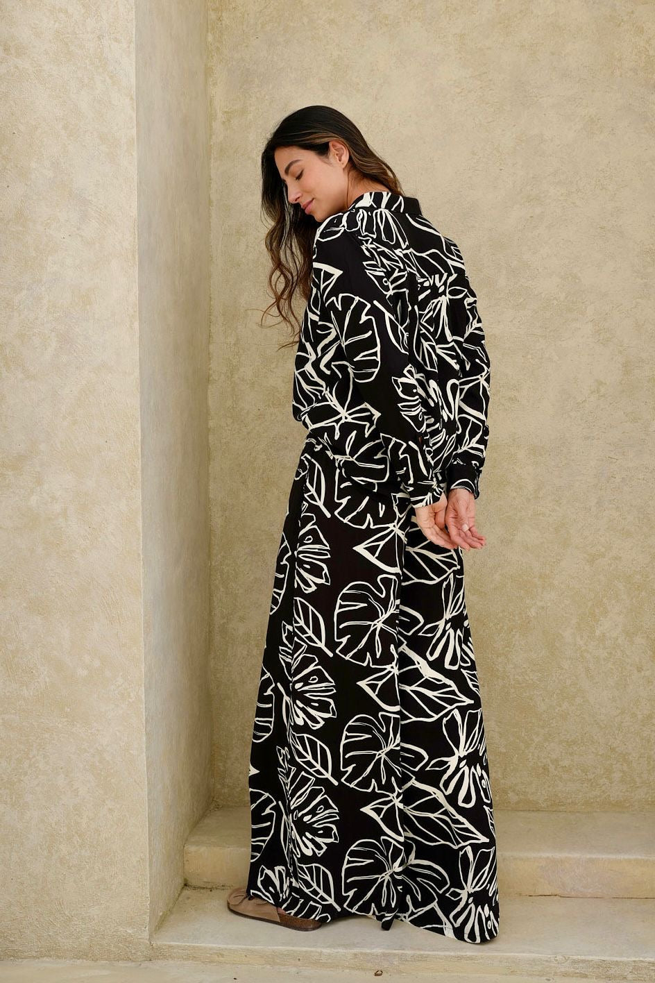 Camisa negra con estampado de hojas en tela Rayón, manga larga, botones funcionales, perfecta para un look fresco y femenino.
