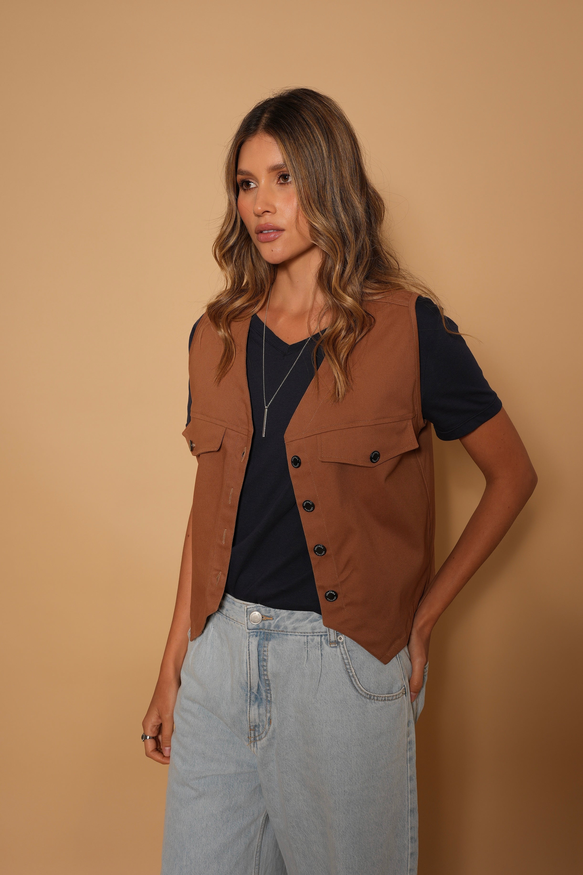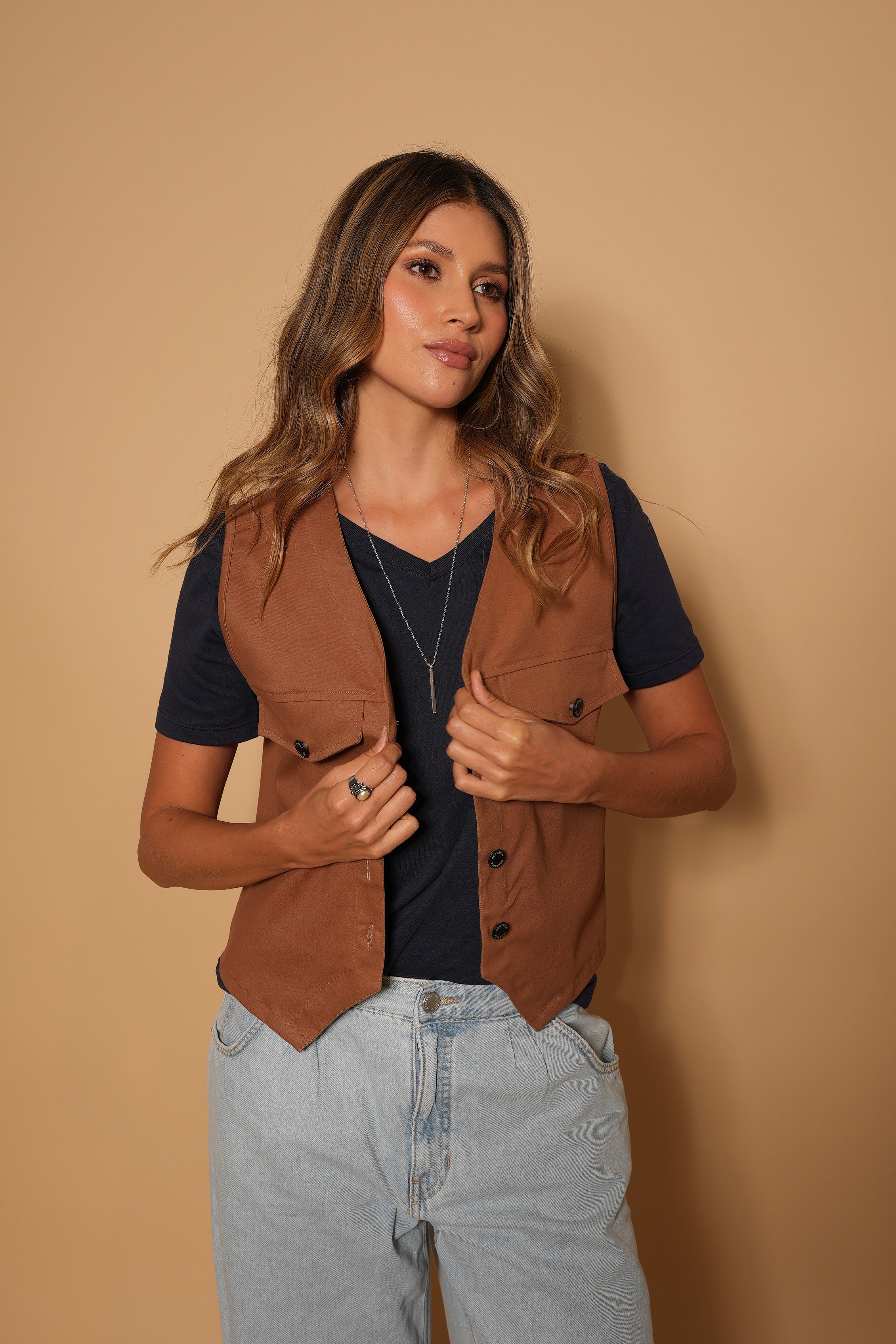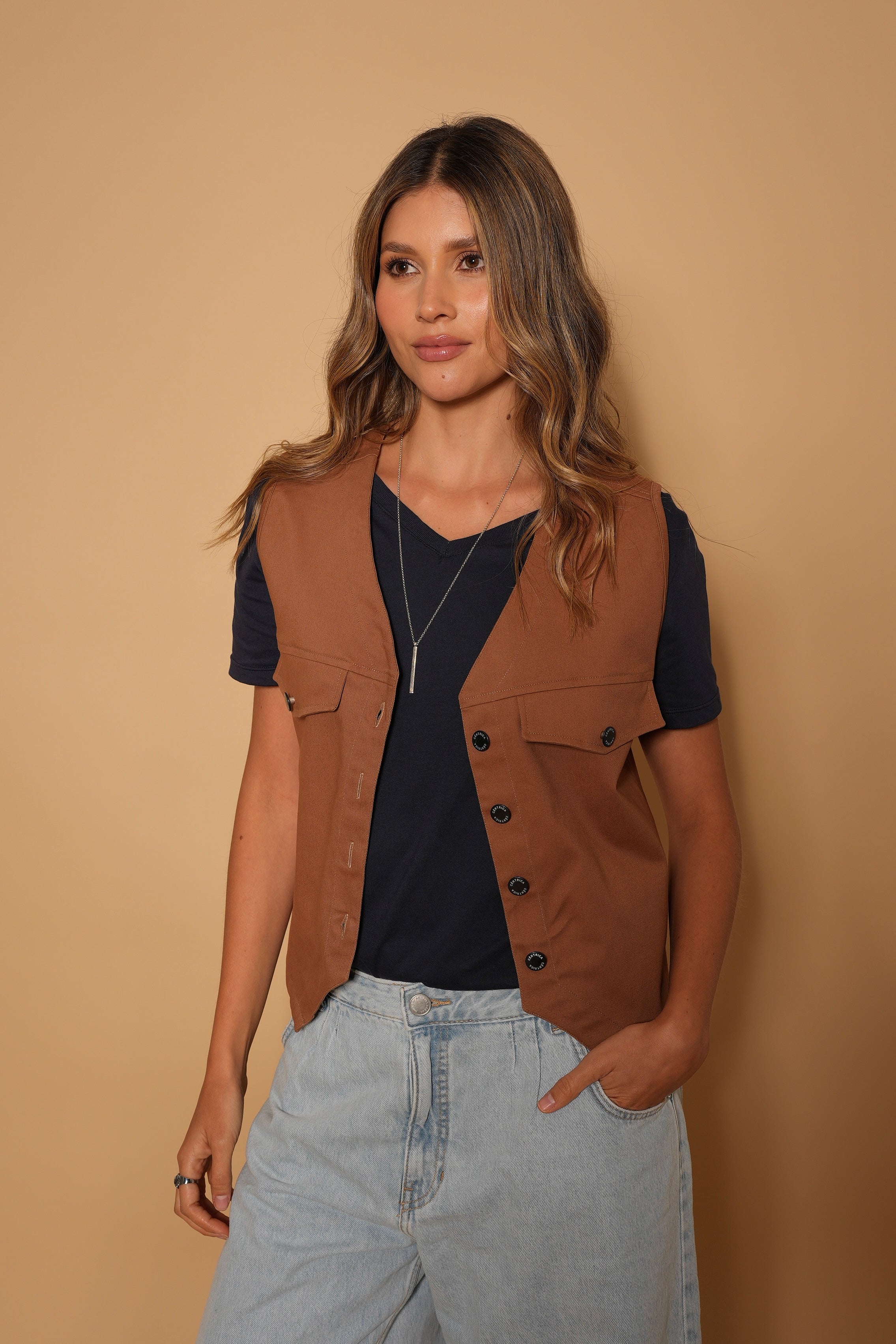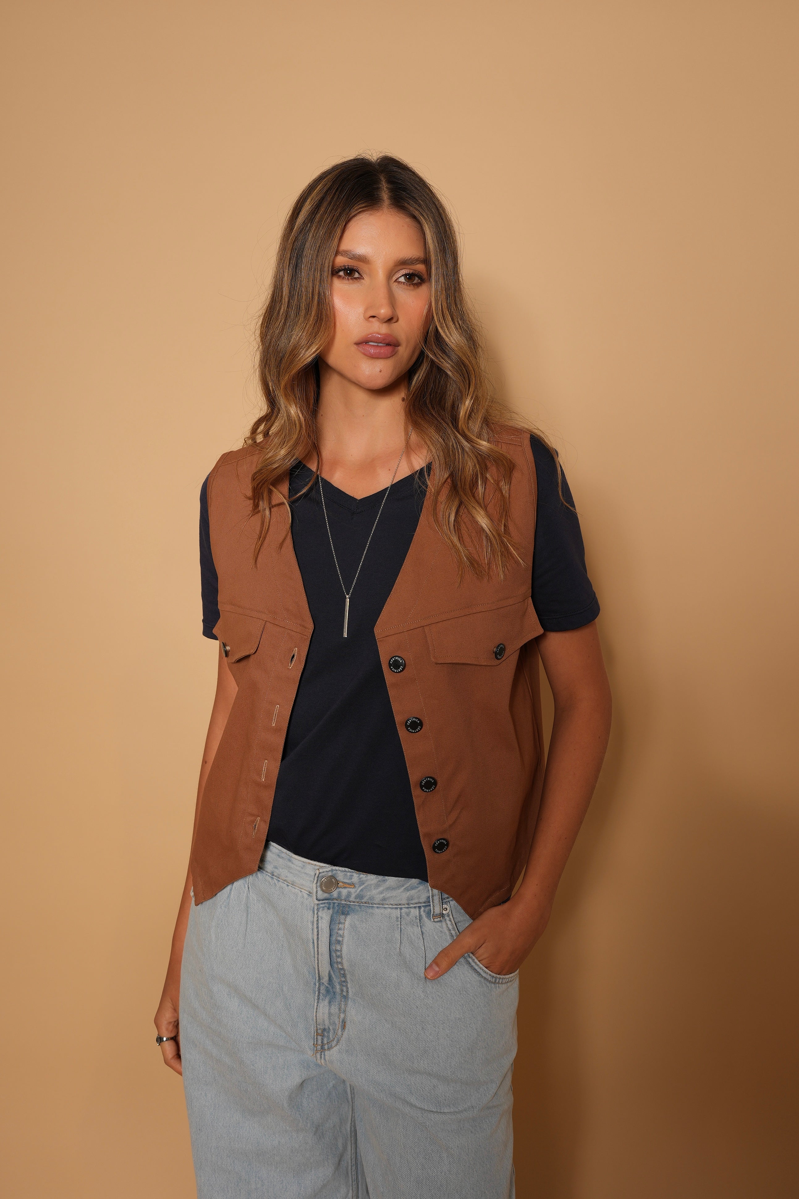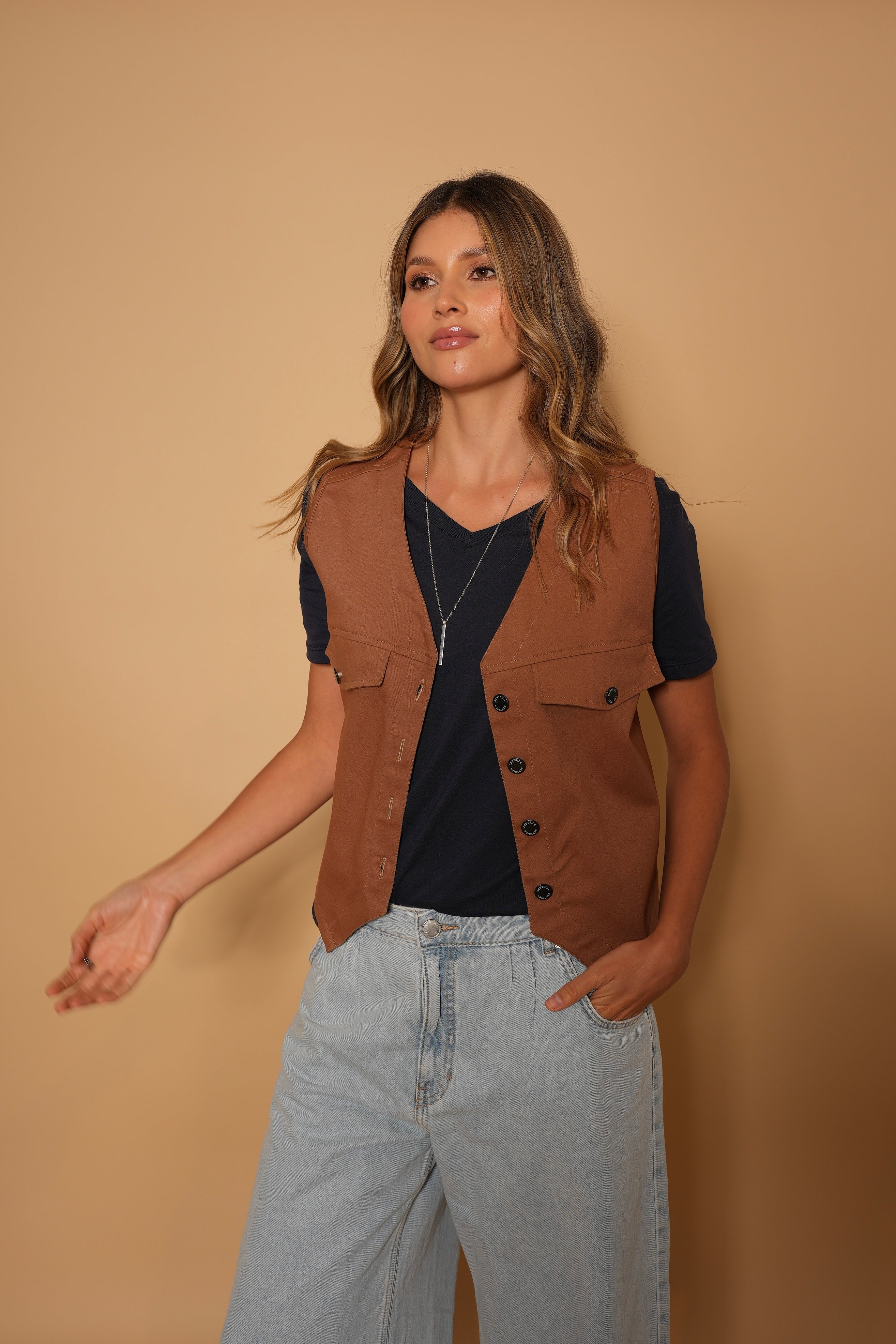 Chaleco color cafe en tela drill gruesa, con botones y bolsillos decorativos.