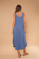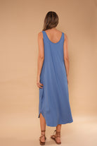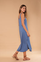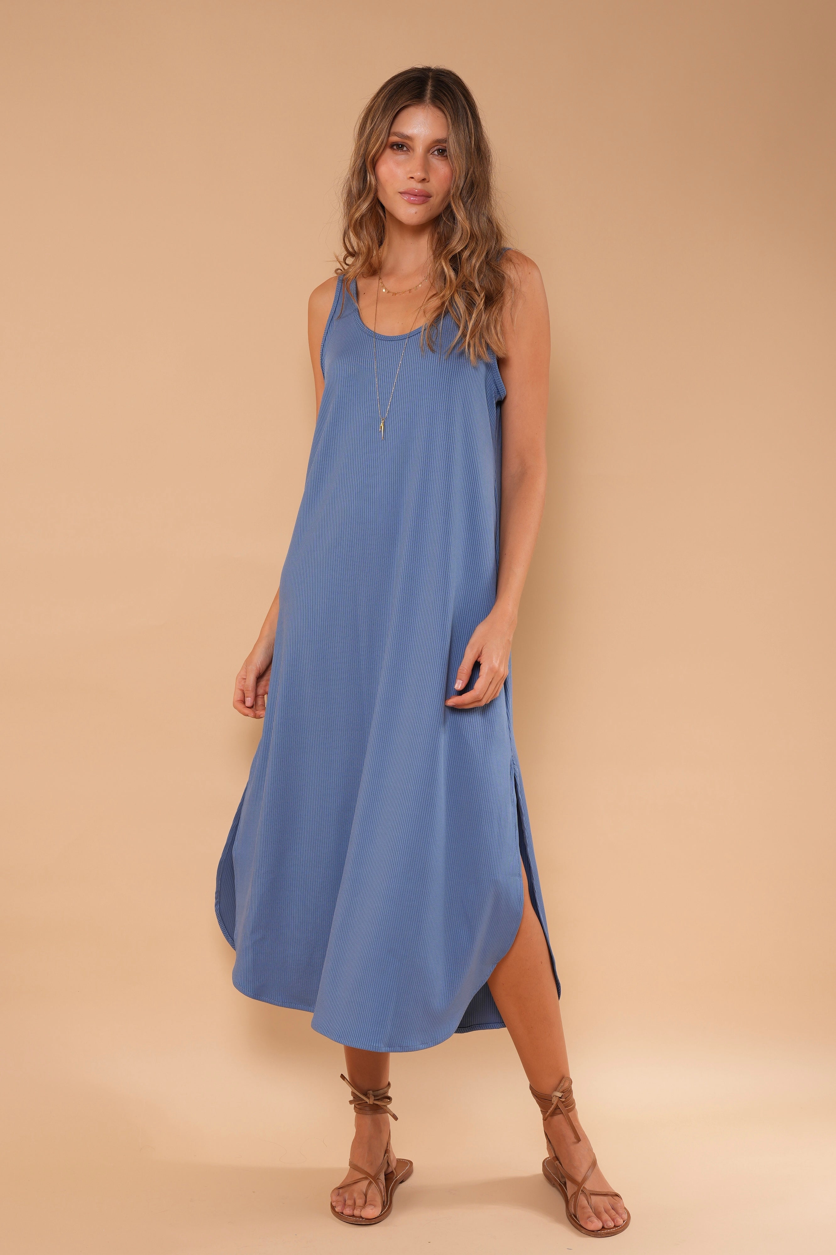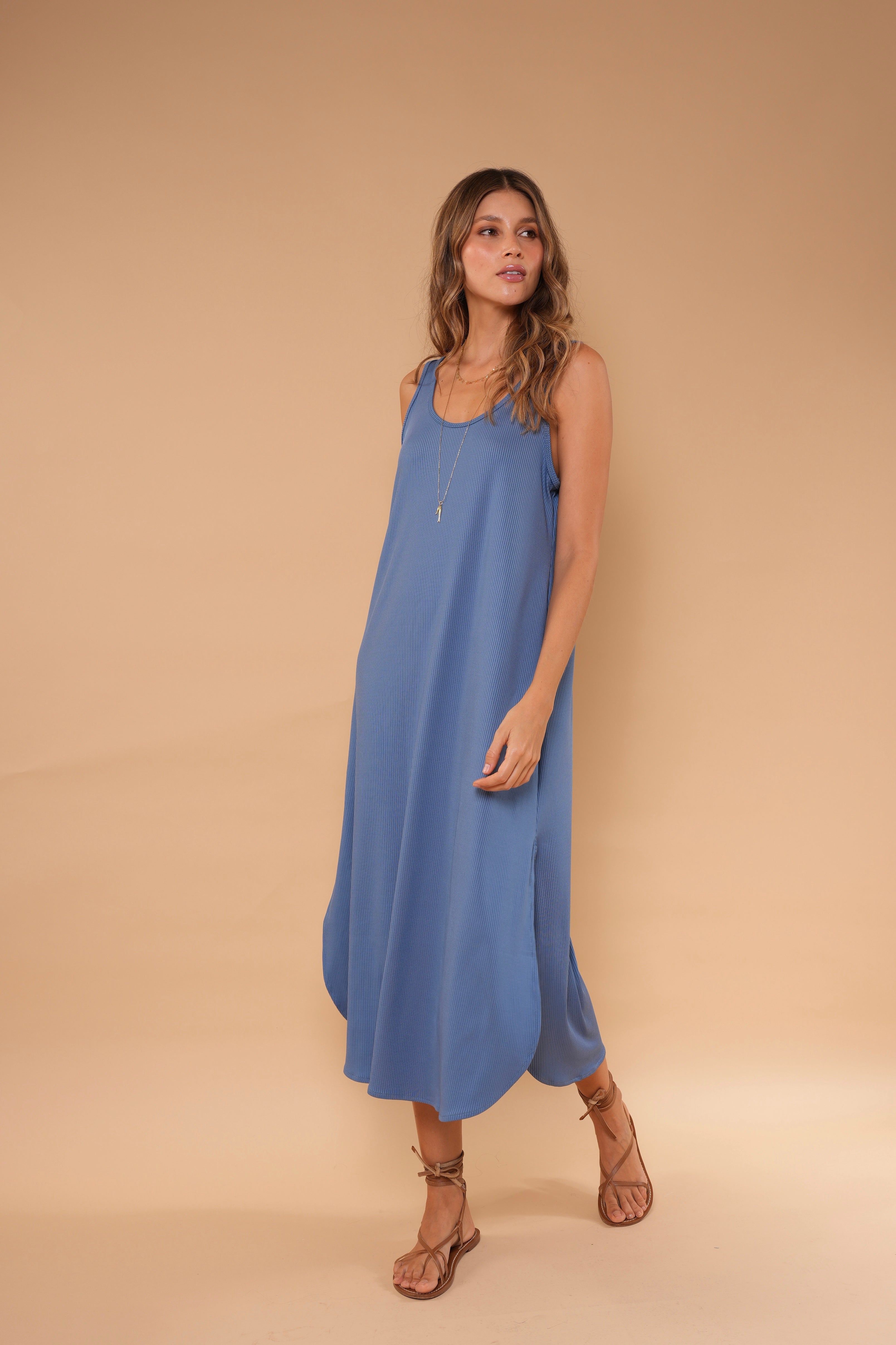 Vestido azul largo básico, en tela Rib con elongación, manga sisa y abertura al costado de la falda, fresco y cómodo.