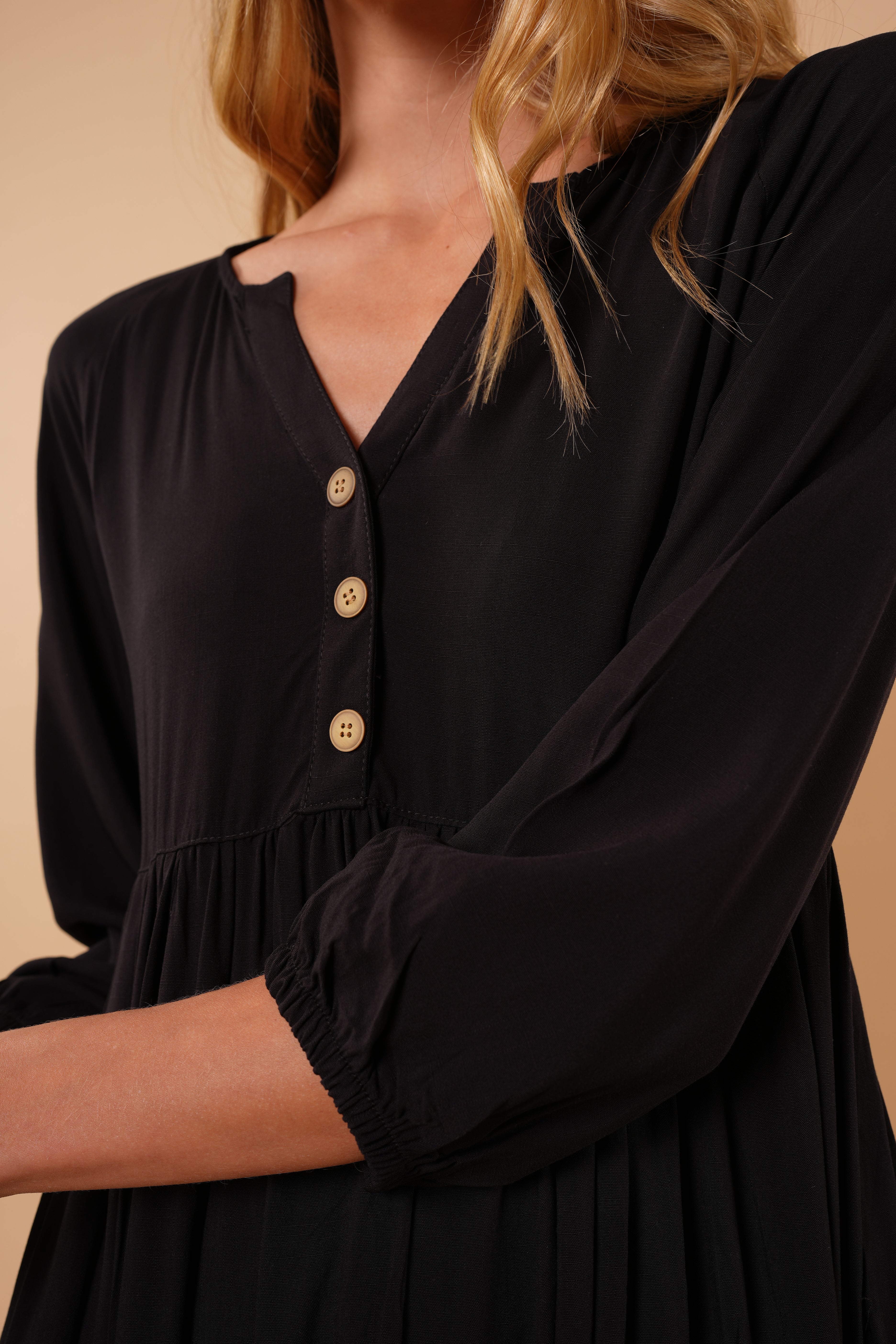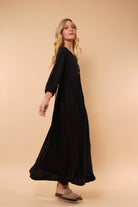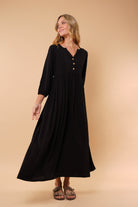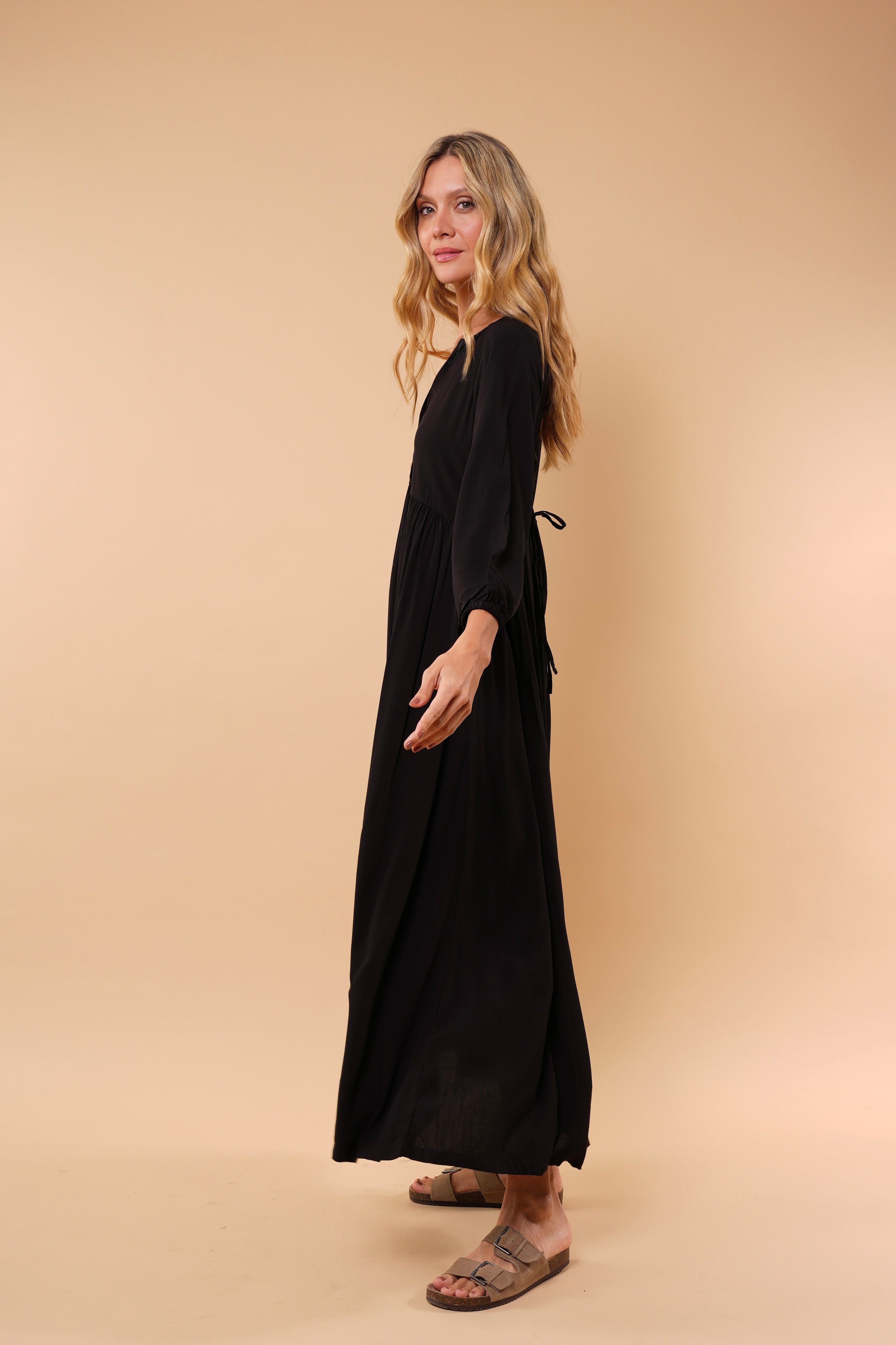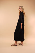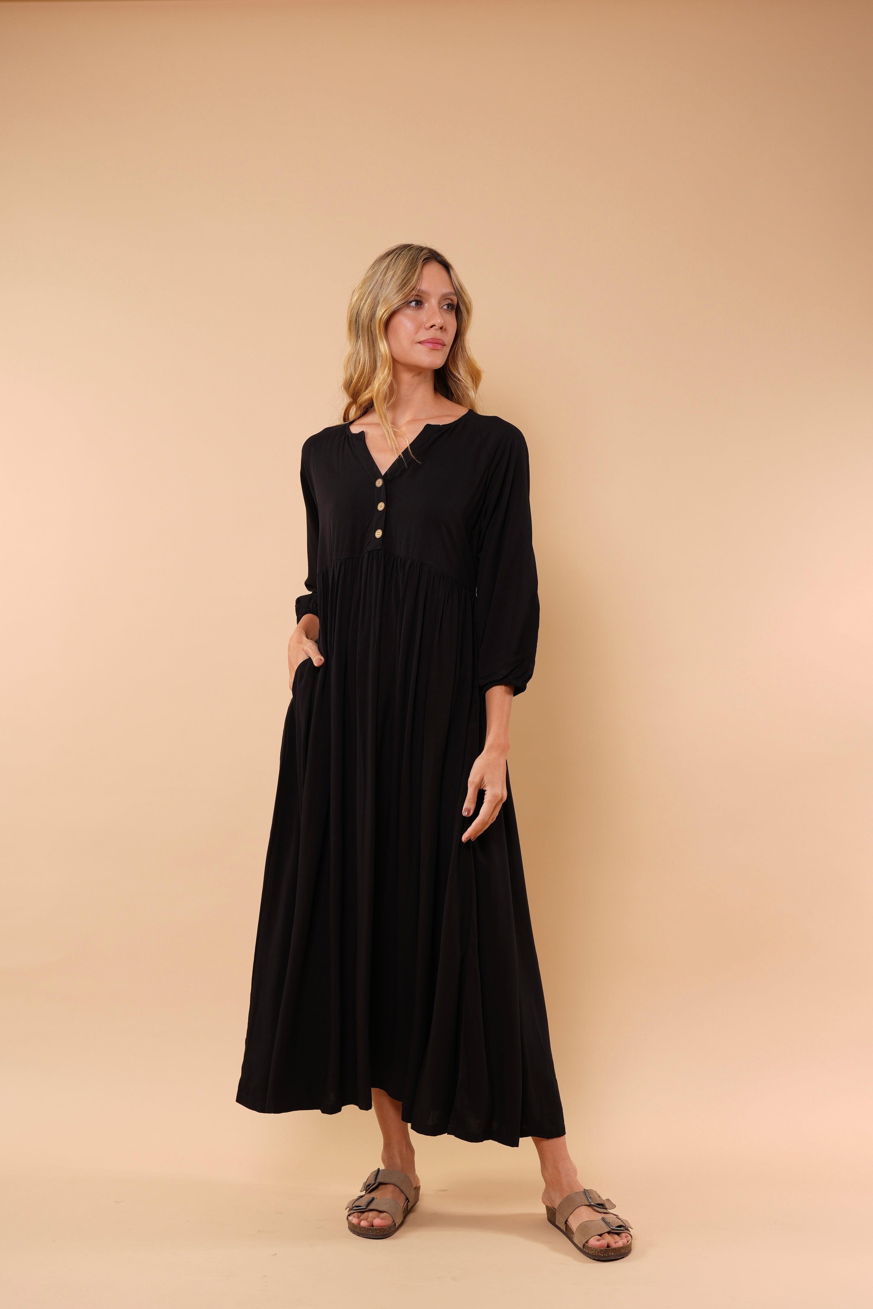 Ligero, femenino y naturalmente elegante. Este vestido está diseñado para acompañarte con suavidad y movimiento en cada paso. Su silueta amplia y fluida estiliza sin ajustar, brindando comodidad y sofisticación al mismo tiempo.