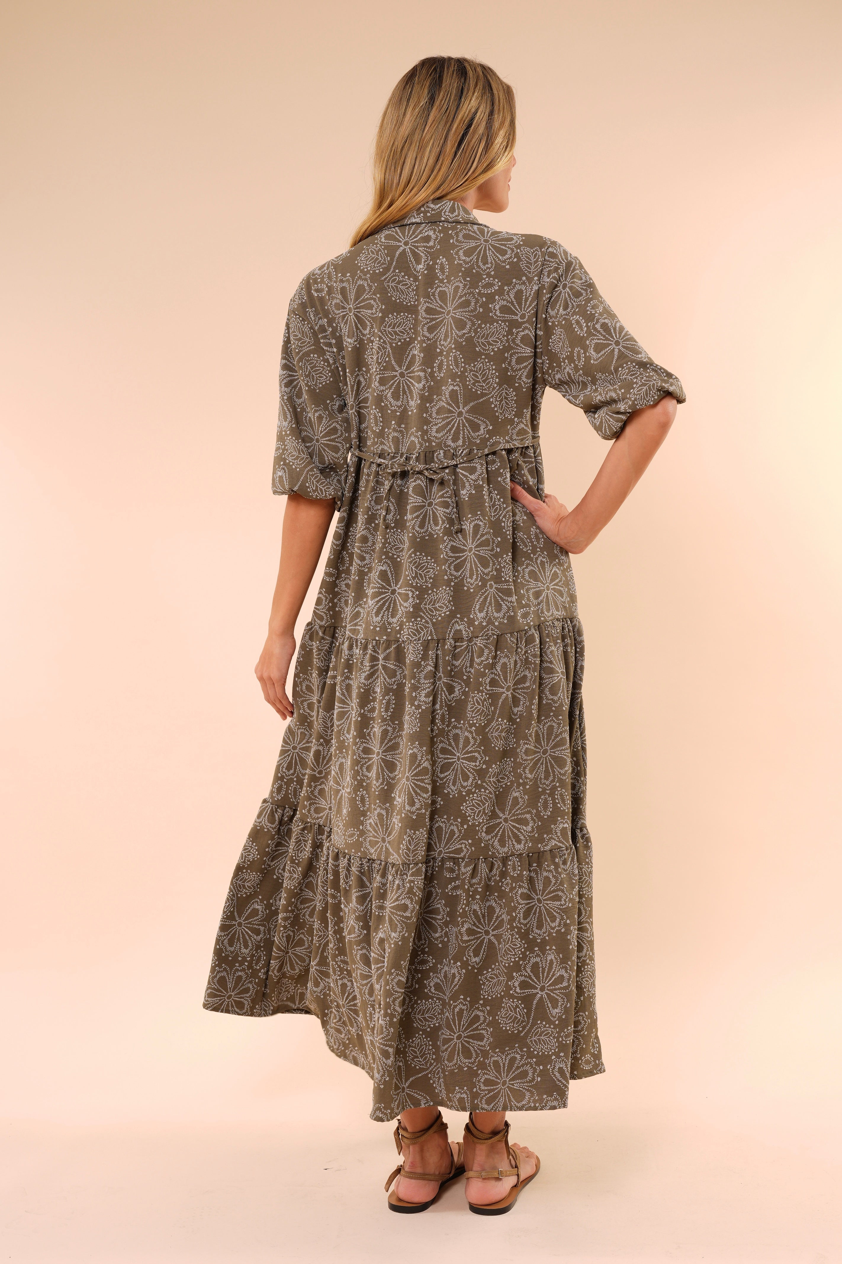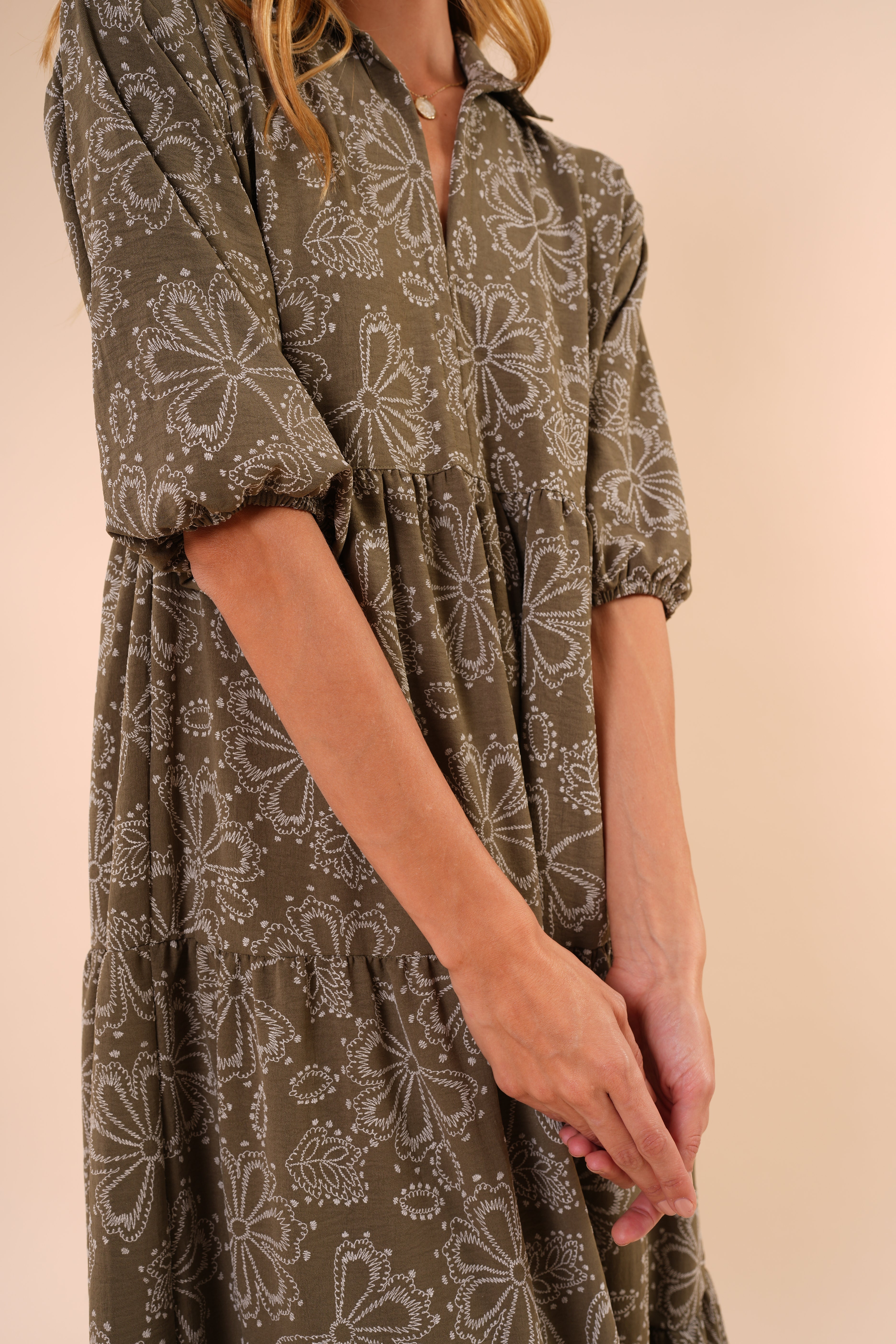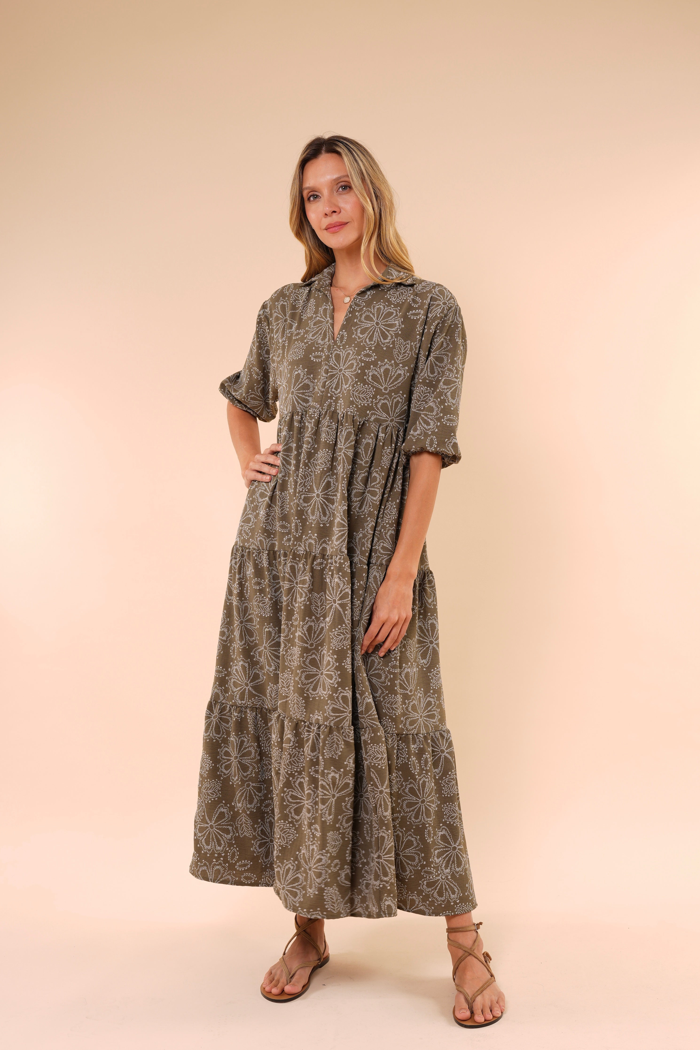 Su silueta amplia y fluida estiliza sin ajustar, mientras el escote en “V” y las mangas con volumen aportan un toque femenino y sofisticado. El estampado floral en tonos neutros lo convierte en una opción atemporal y fácil de combinar.