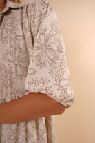 Su silueta amplia y fluida estiliza sin ajustar, mientras el escote en “V” y las mangas con volumen aportan un toque femenino y sofisticado. El estampado floral en tonos neutros lo convierte en una opción atemporal y fácil de combinar.