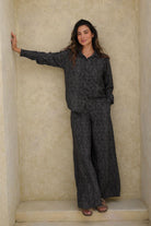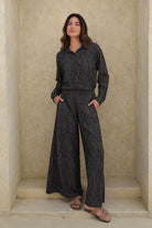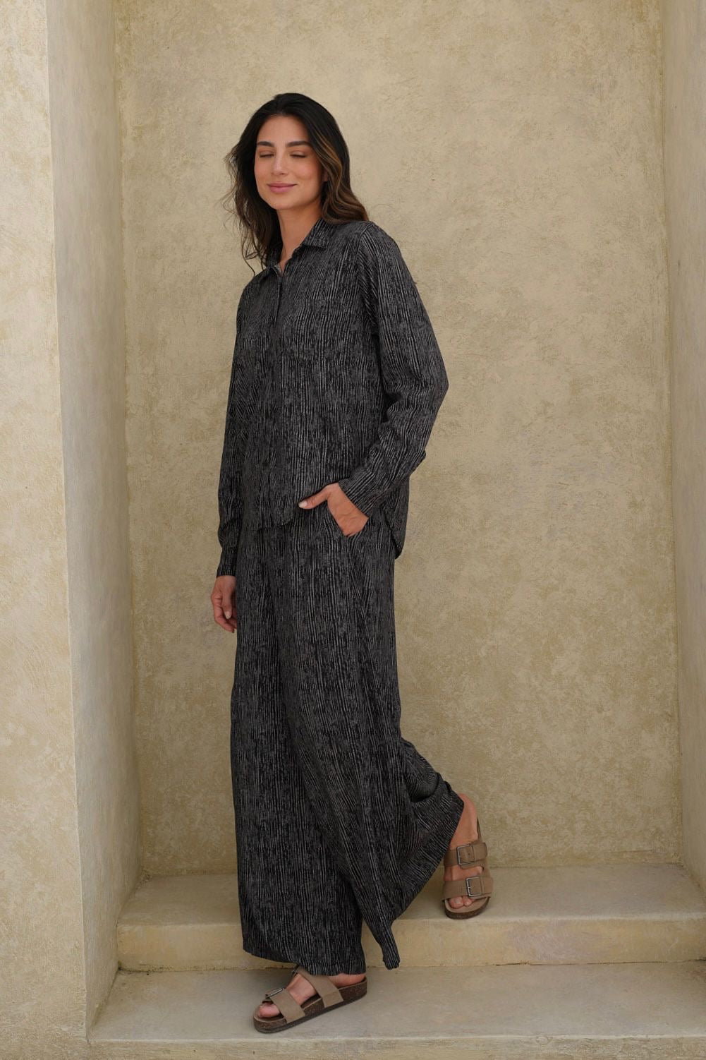 Pantalón negro con estampado, de pierna ancha, tiro alto, elástico y bolsillos, en tela rayón ligera y fluida aporta movimiento y comodidad.