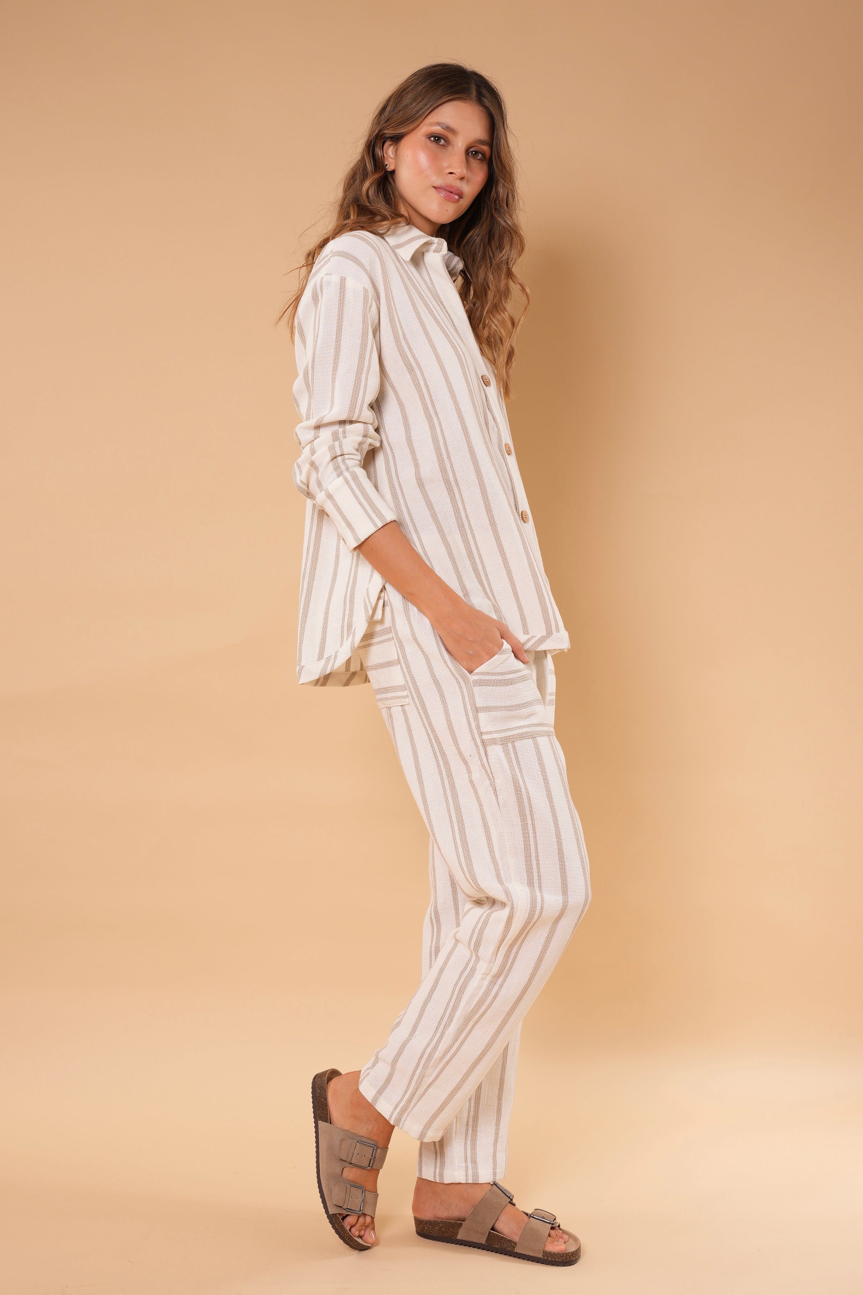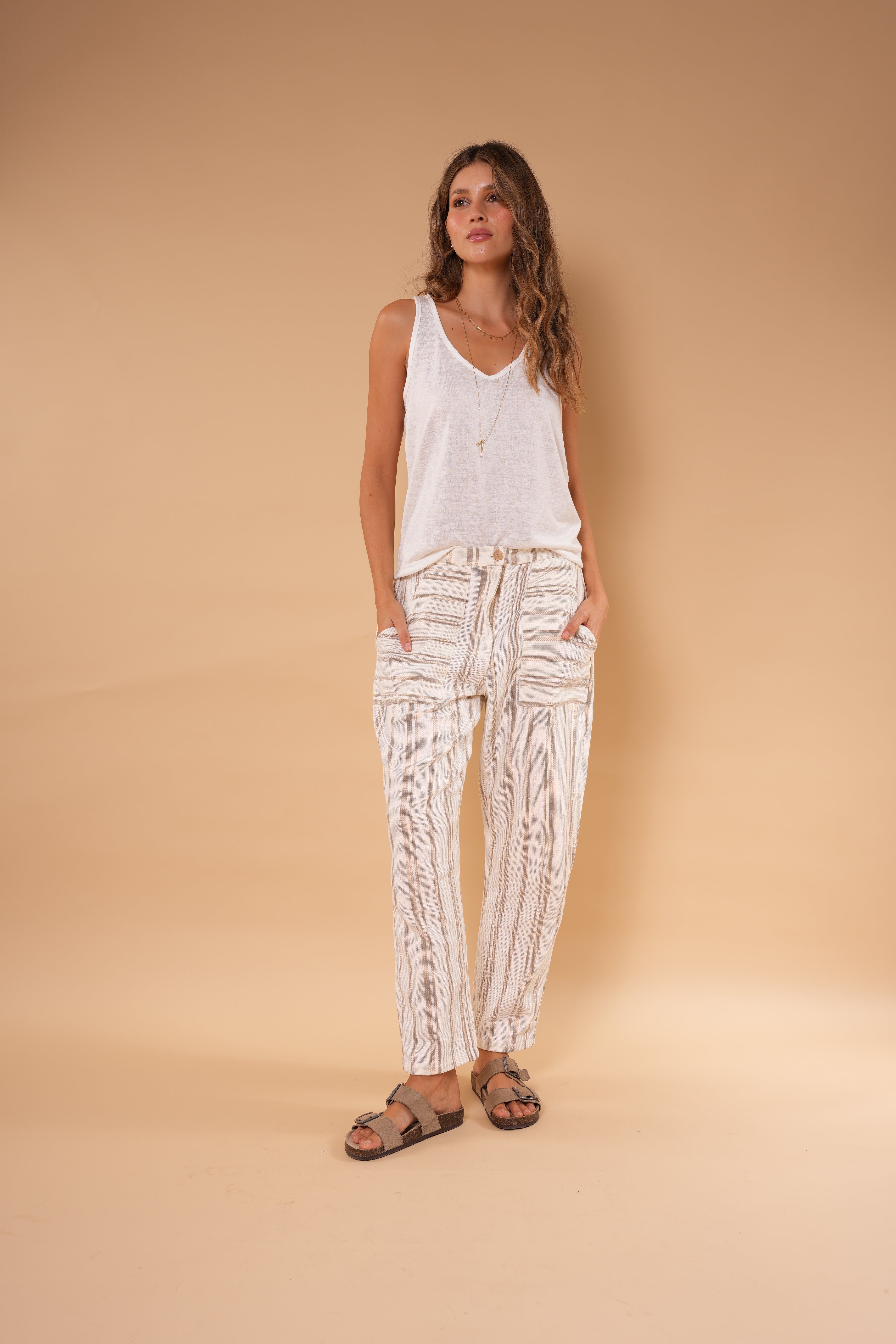 Pantalón crema con lineas cafes tela lino rayón , con bolsillos, cierre y cómodo elástico en cintura.