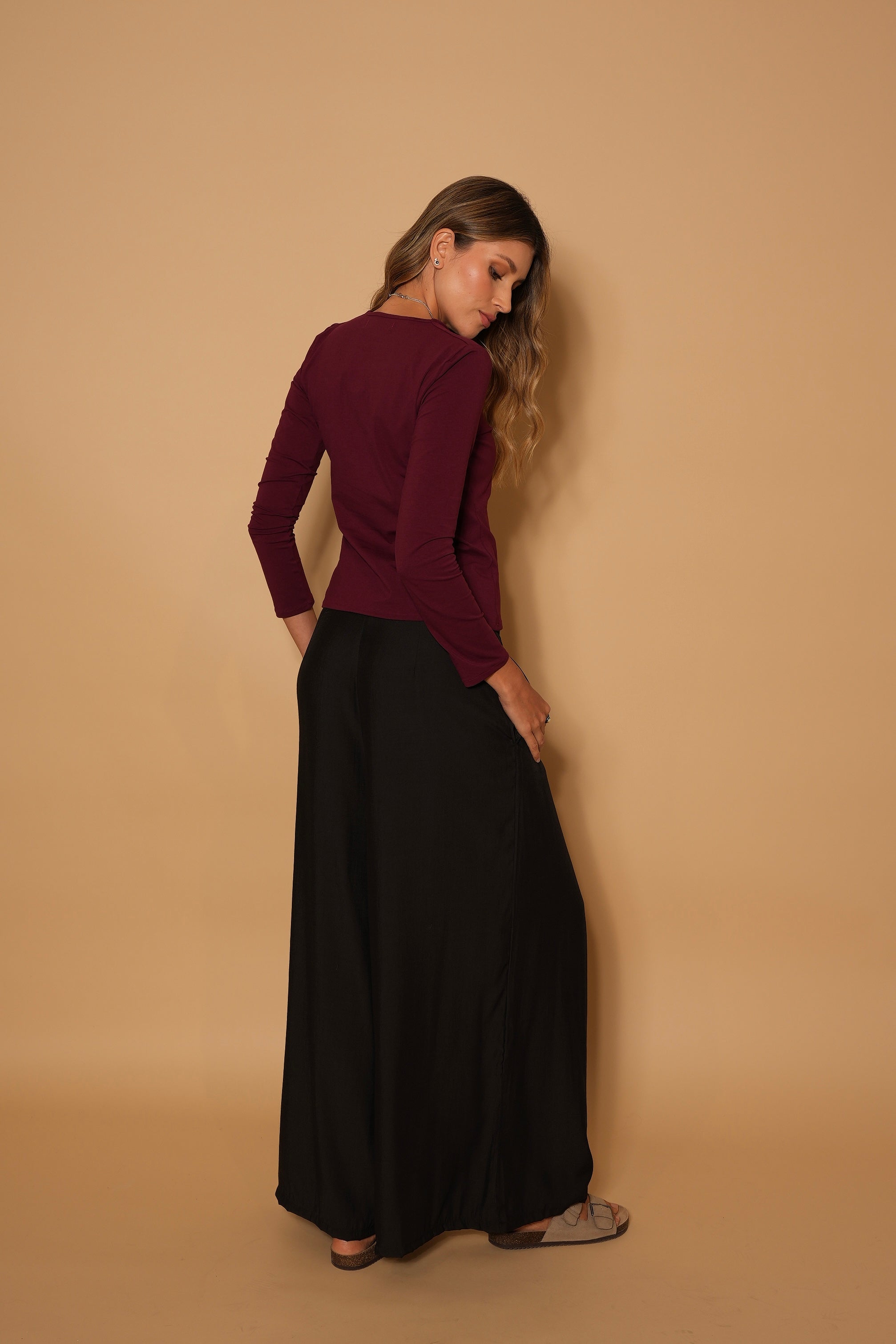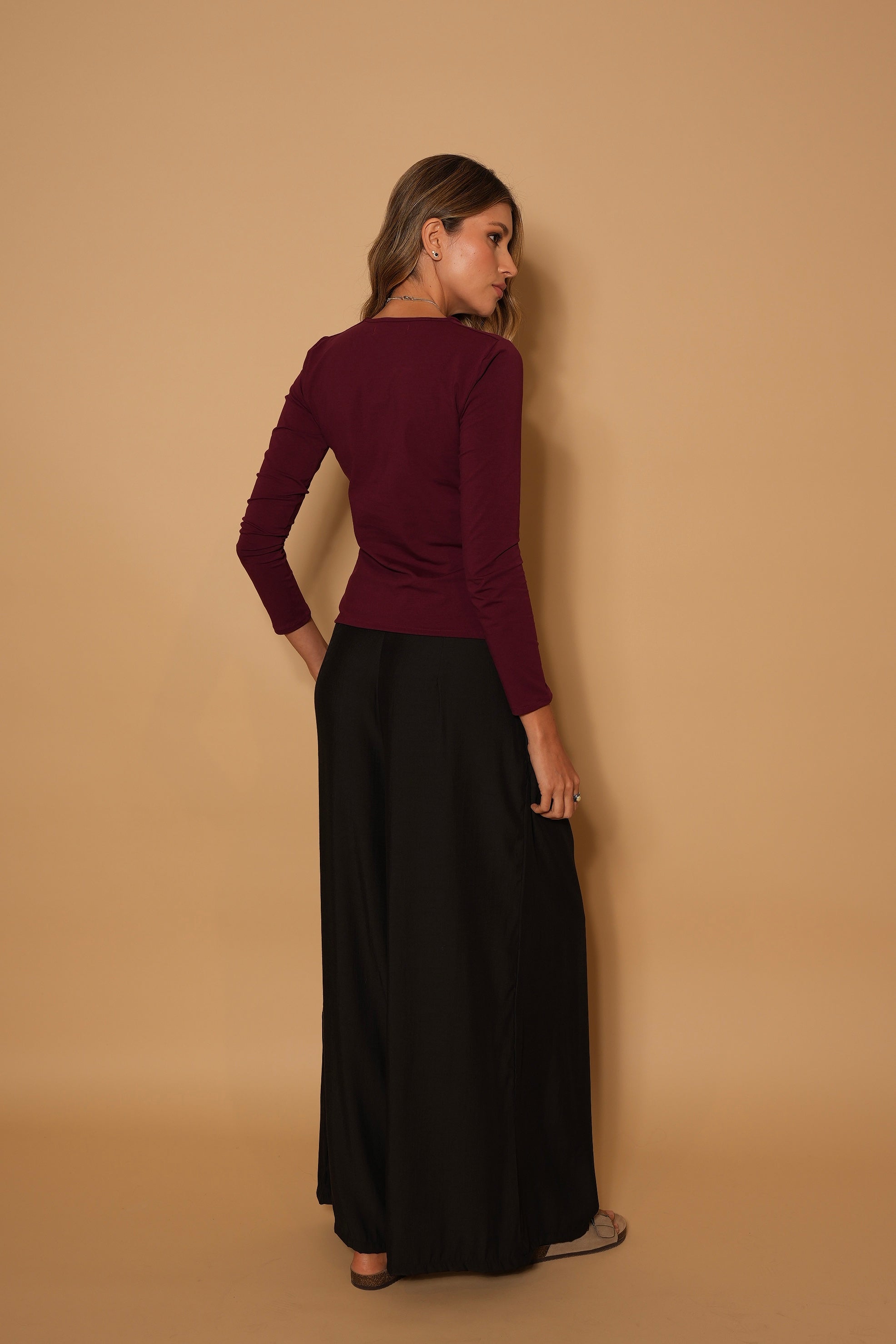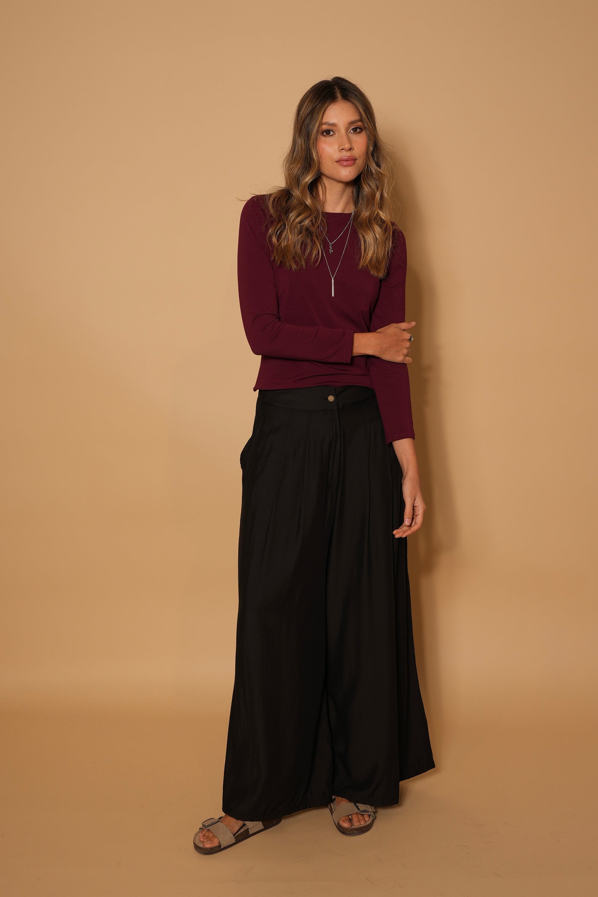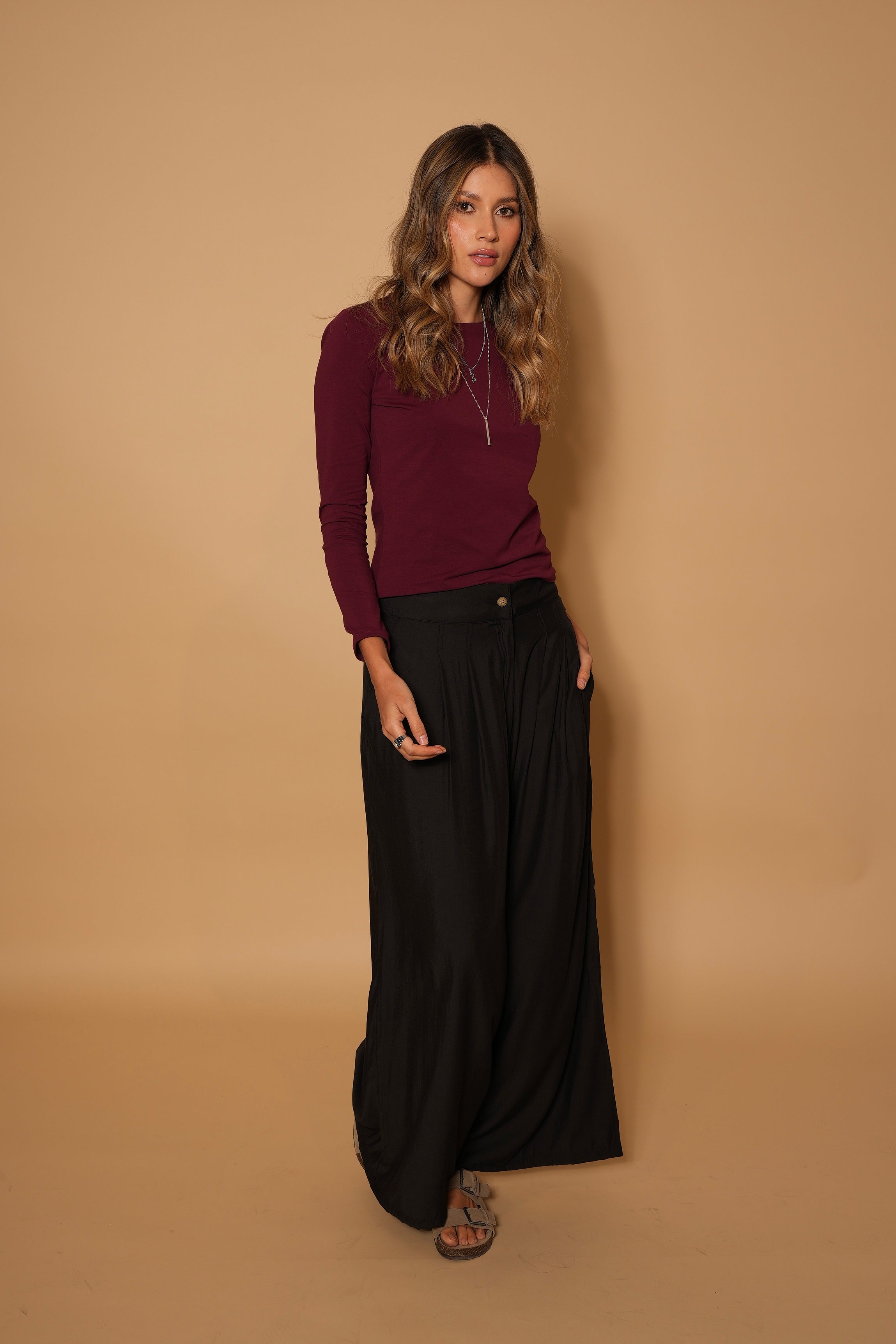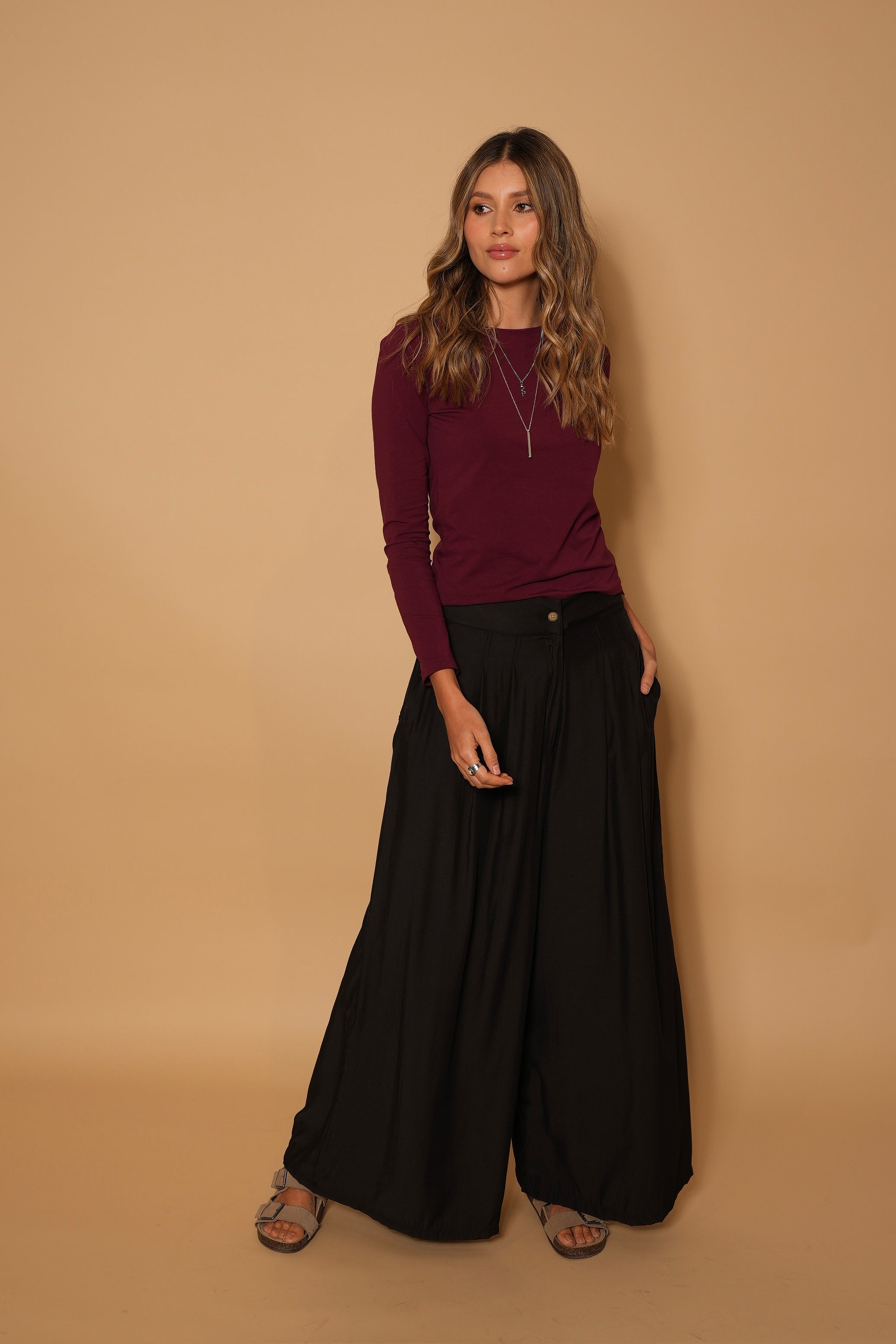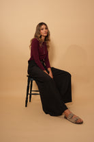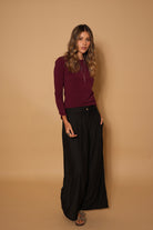 Pantalón negro, en  tela rayón, tiro alto, botones, bota ancha, cierre y bolsillos lo hacen una prenda infaltable en el armario.