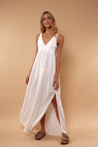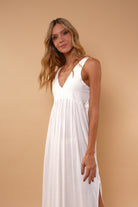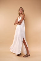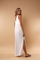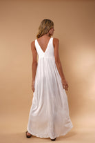 Este vestido largo destaca por su silueta etérea y movimiento natural. Confeccionado en una tela liviana y suave al tacto, cae con delicadeza desde el busto creando un efecto fluido que estiliza la figura. Su escote profundo en V realza el cuello y el escote de manera elegante, mientras que las sisas amplias aportan frescura y comodidad.