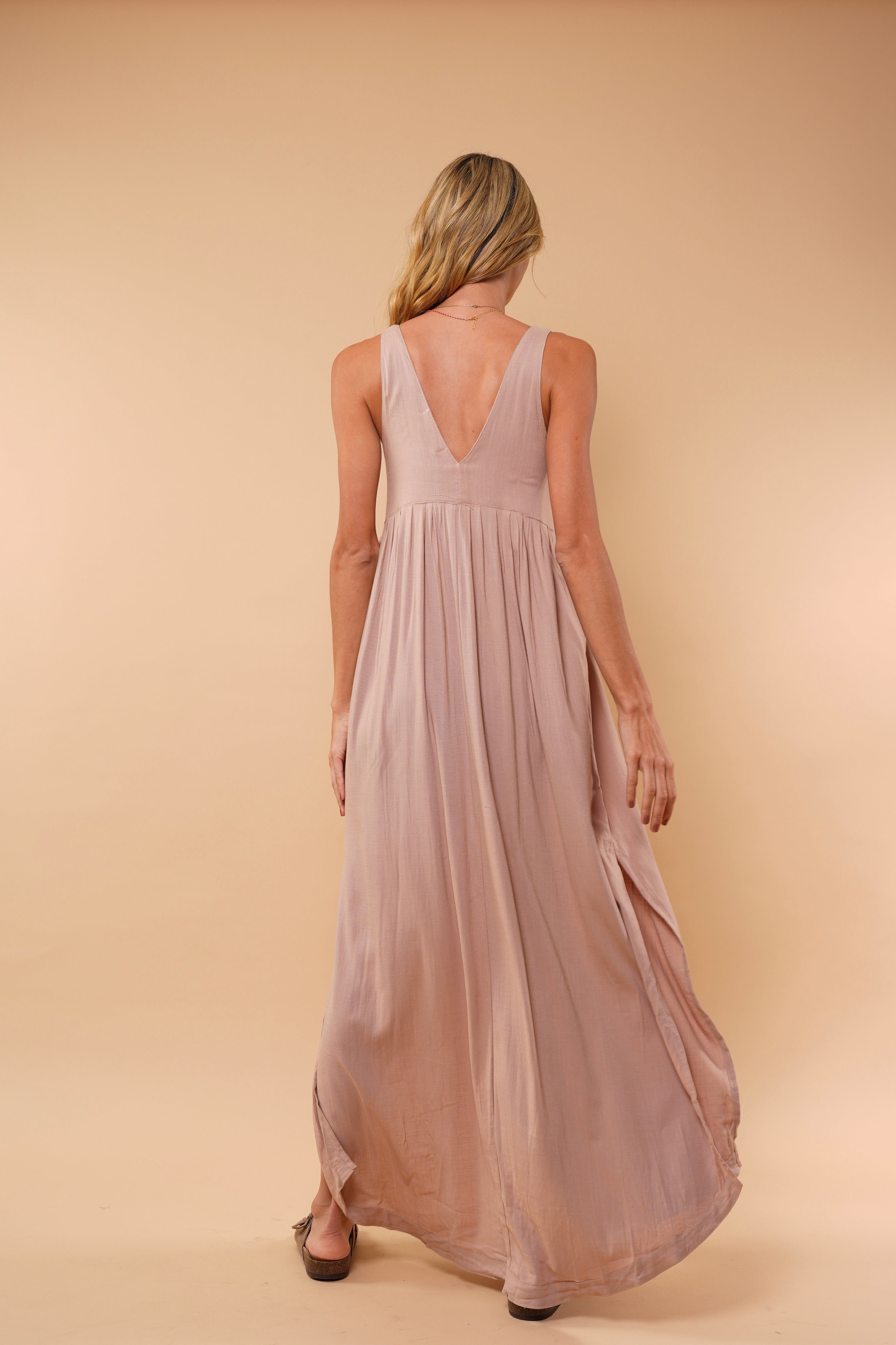Este vestido largo destaca por su silueta etérea y movimiento natural. Confeccionado en una tela liviana y suave al tacto, cae con delicadeza desde el busto creando un efecto fluido que estiliza la figura. Su escote profundo en V realza el cuello y el escote de manera elegante, mientras que las sisas amplias aportan frescura y comodidad.