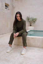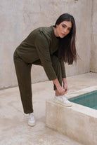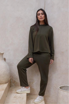 Sudadera en tela burda liviana color verde militar, con diseño moderno y cómodo. Su fit relajado y las costuras verticales aportan un toque estilizado, convirtiéndola en una prenda versátil para usar en cualquier ocasión.