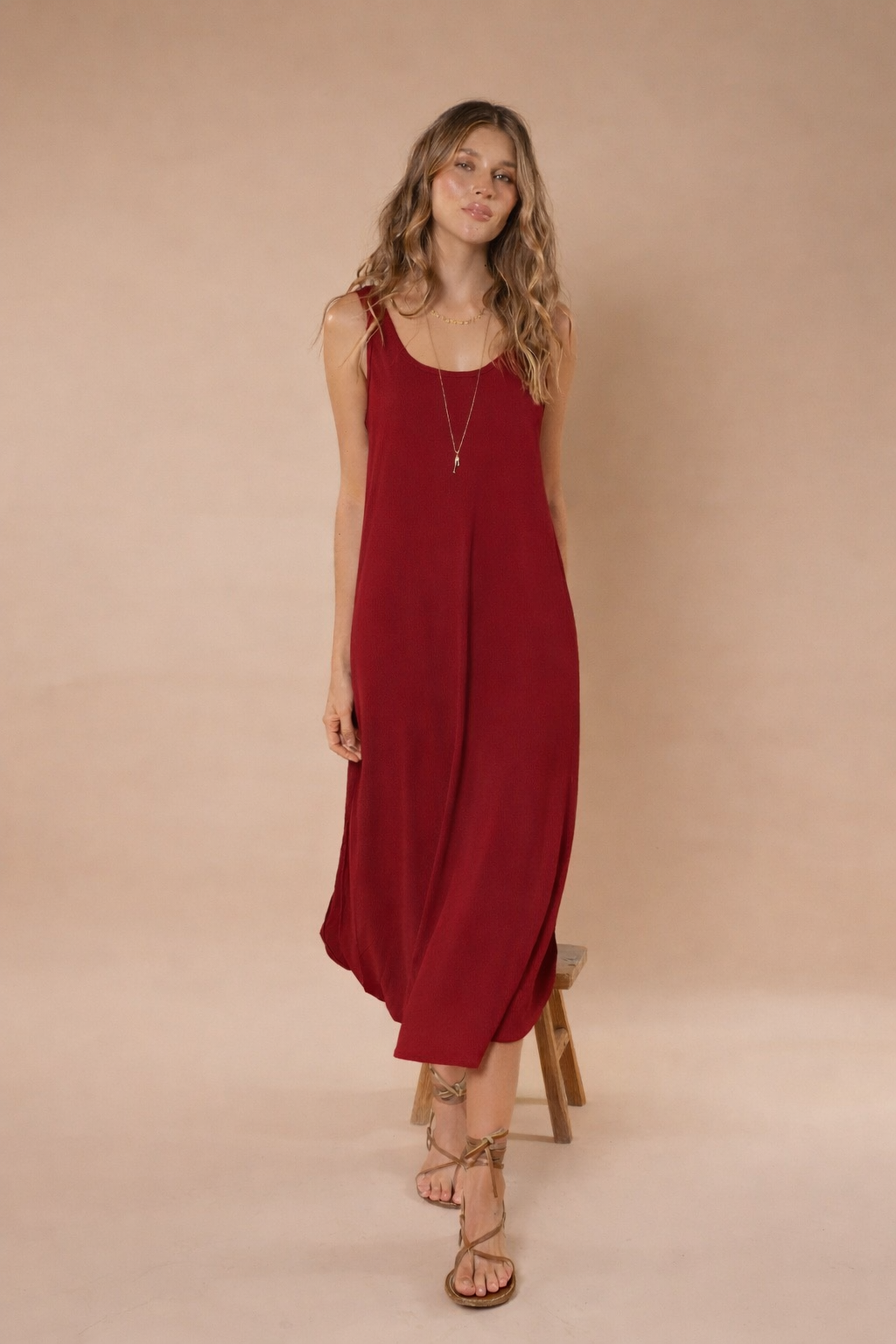 Vestido rojo largo básico, en tela Rib con elongación, manga sisa y abertura al costado de la falda, fresco y cómodo.