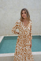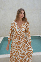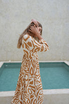 Vestido estampado naranja largo, en tela rayón con elongación, escote en V botones funcionales, resorte en la manga, bolsillos laterales y ajuste en cintura.