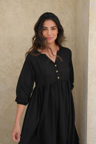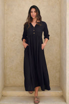 Vestido negro largo, en tela poliéster con elongación, escote en V botones funcionales, resorte en la manga, bolsillos laterales y ajuste en cintura.