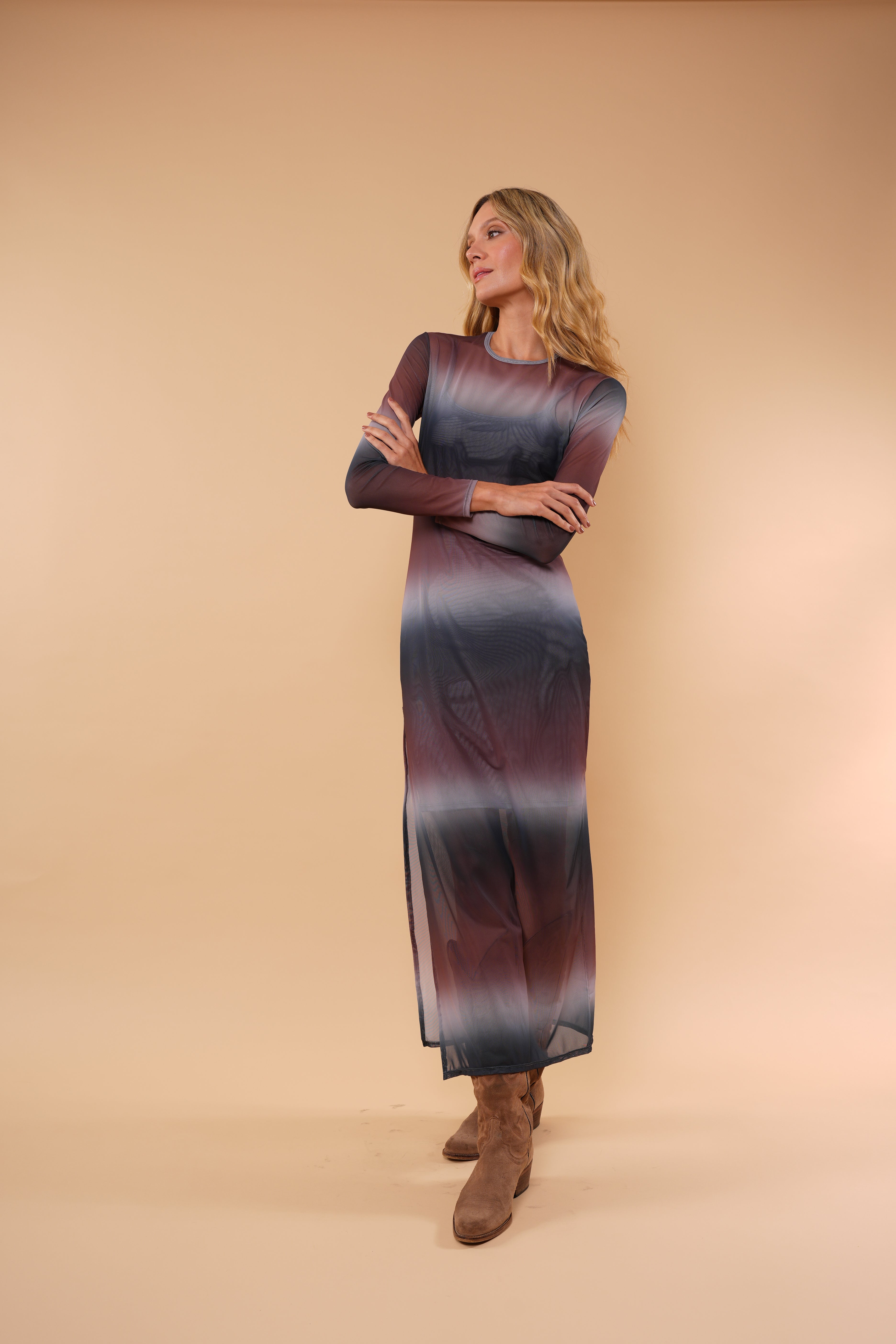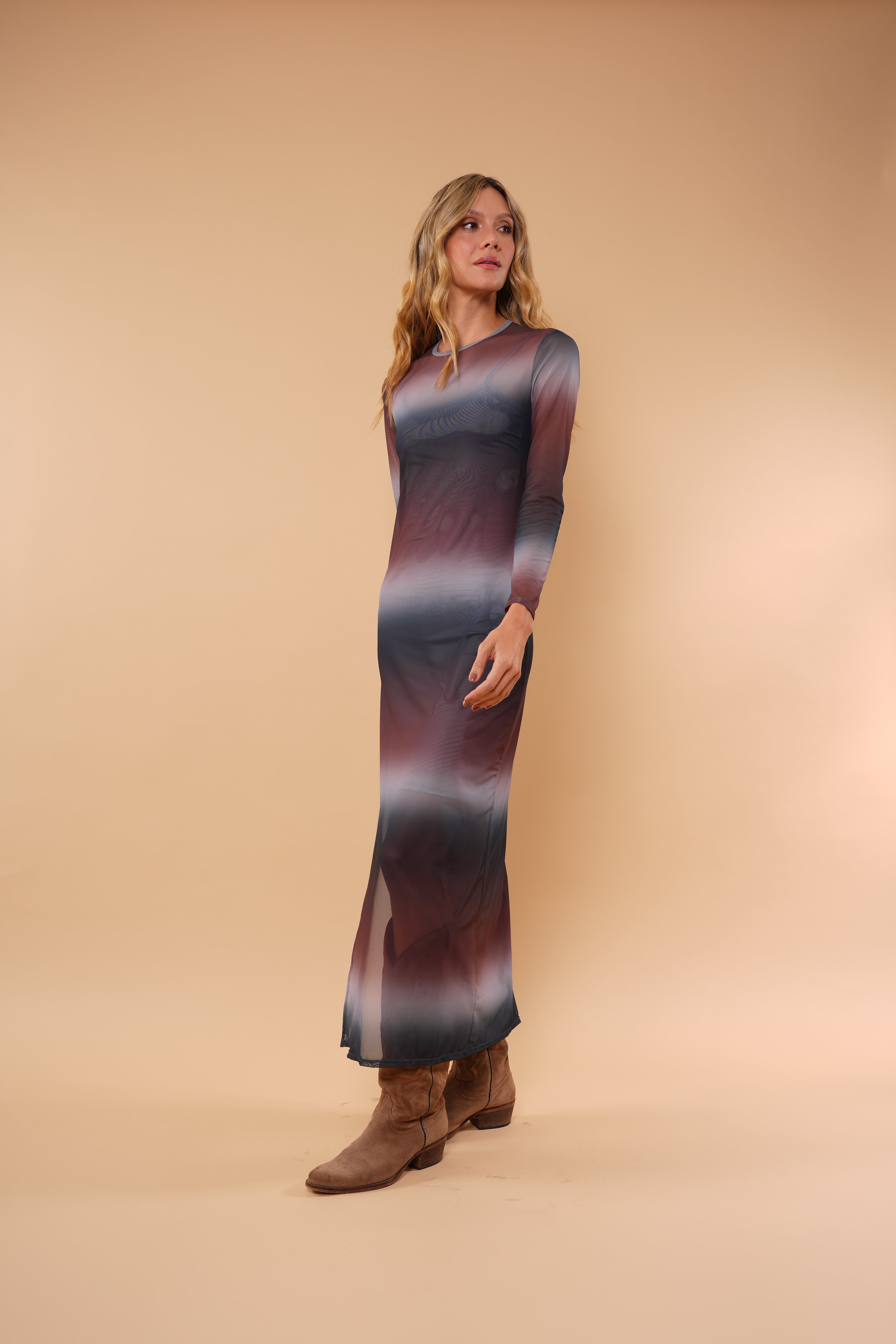 Nuestro Vestido INCLUYE VESTIDO INTERNO, en mayatex, es una pieza sofisticada y versátil que eleva cualquier look clásico y atemporal, mientras que la transparencia sutil de la malla crea un efecto femenino y moderno.