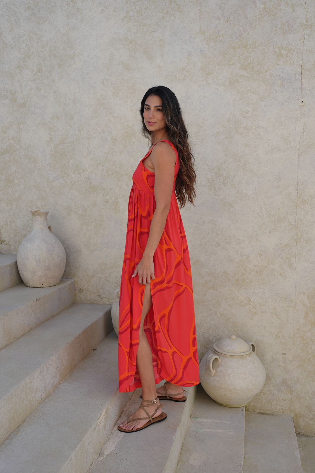 Vestido con estampado rojo y naranja largo con estampado de ondas, manga sisa en tela rayón, diseño fluido, escote en V y abertura al costado de la falda.
