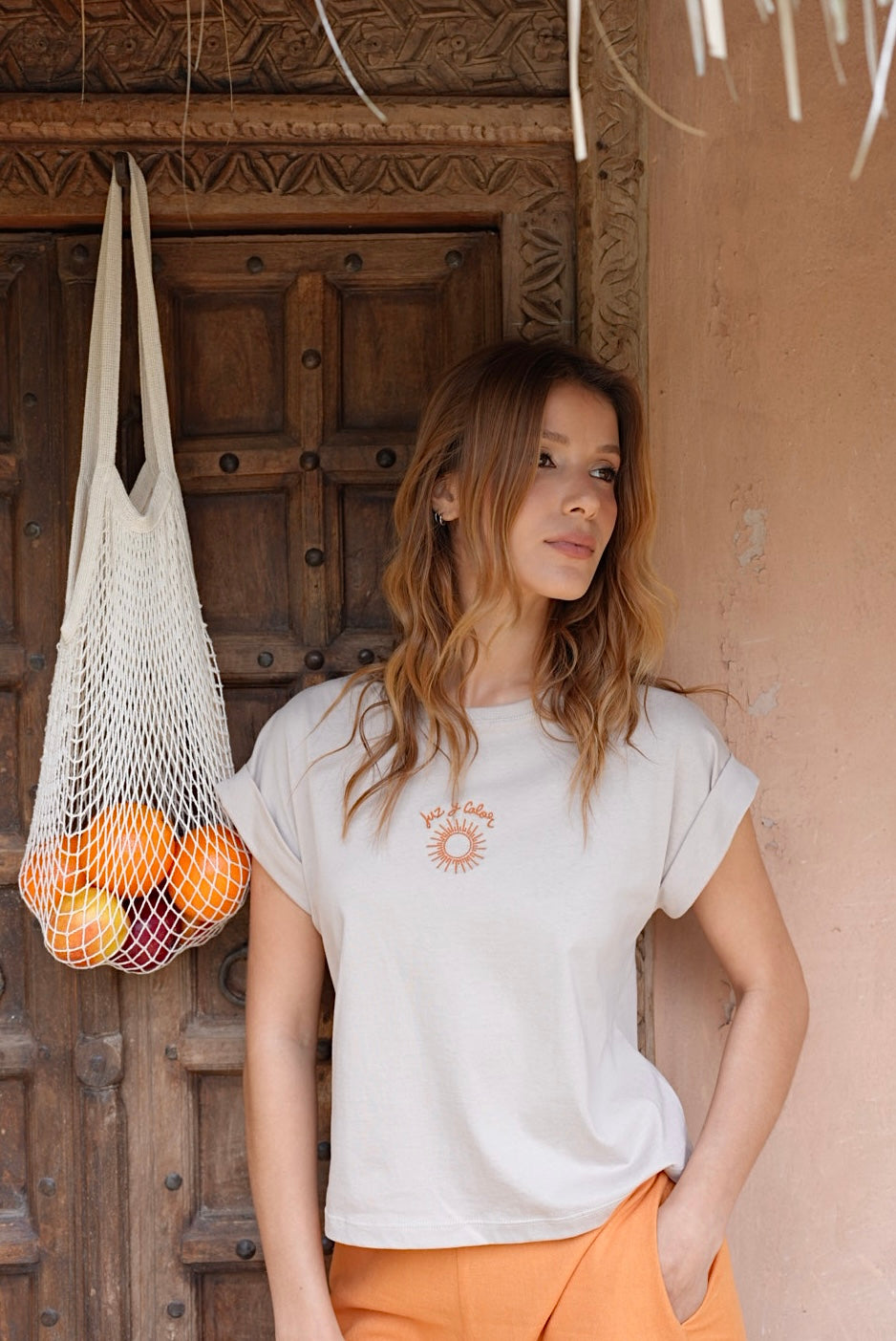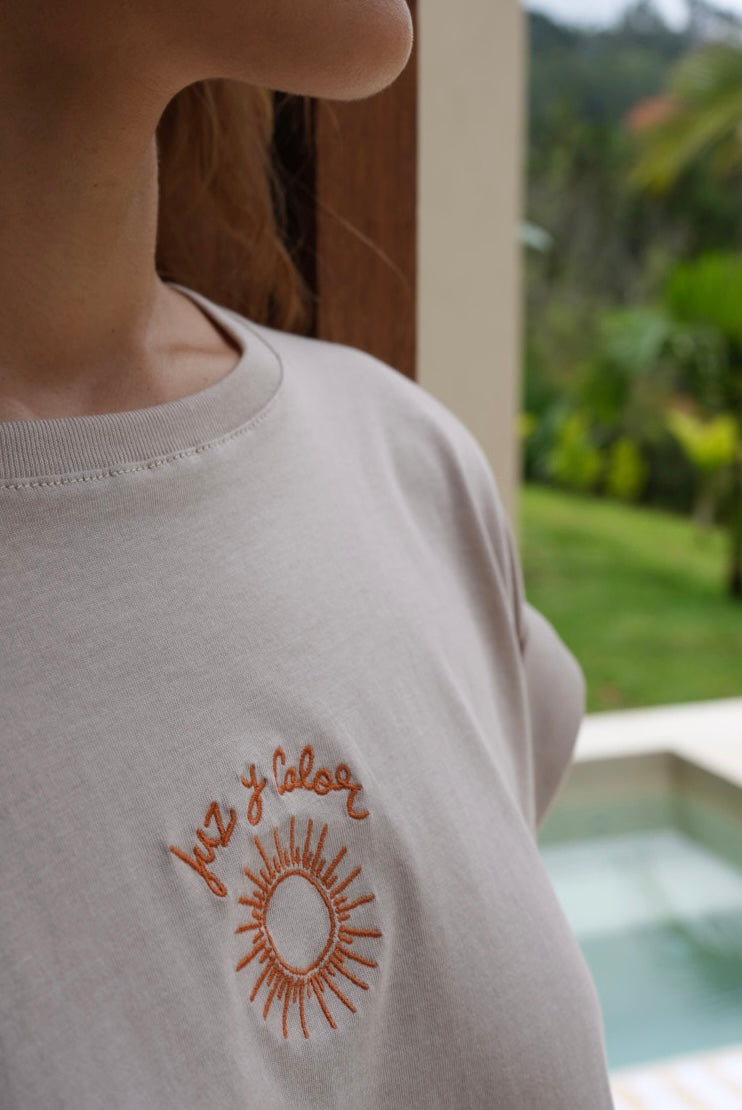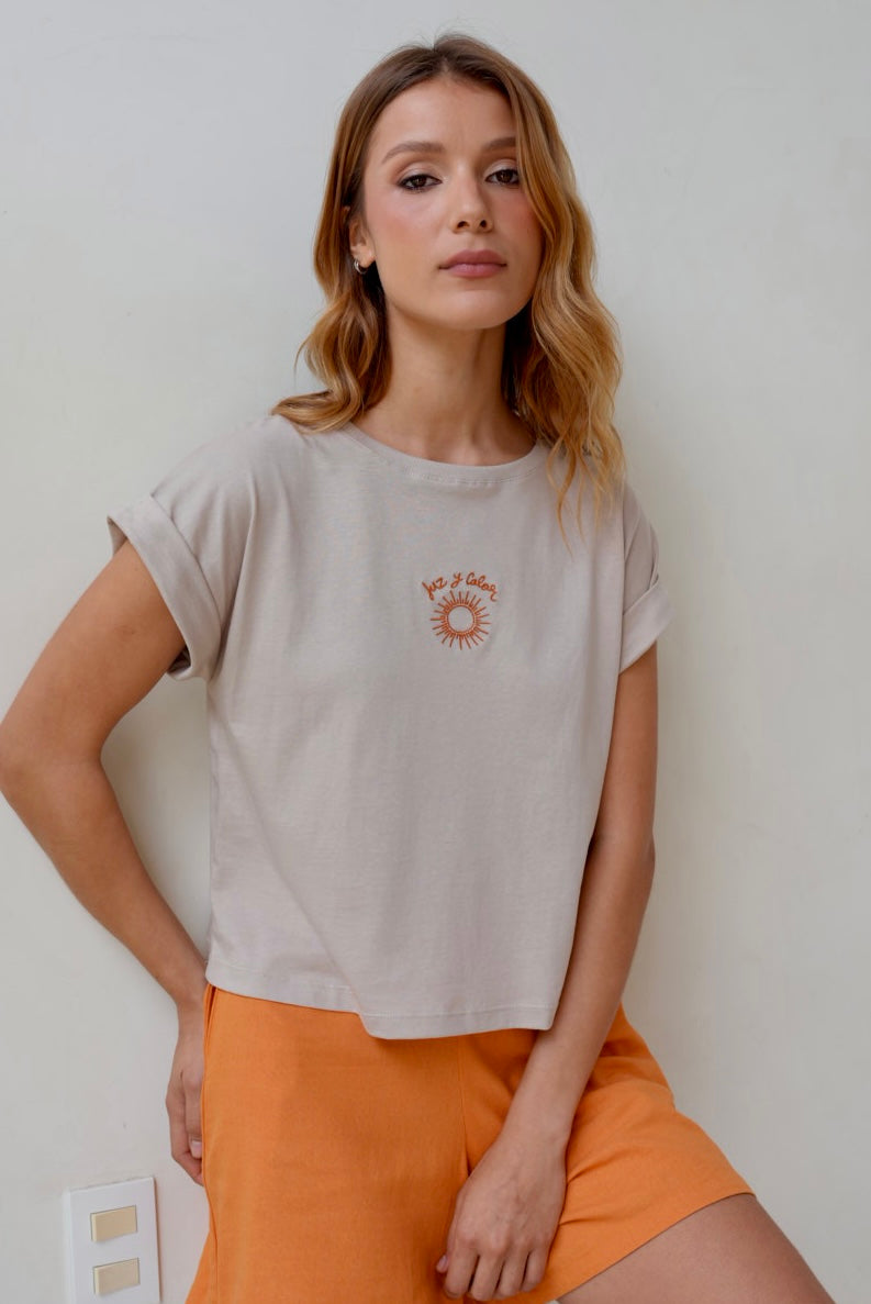 Camiseta taupe con bordado de sol, básica manga corta en tela Algodón y cuello redondo en rib, fresca y cómoda.
