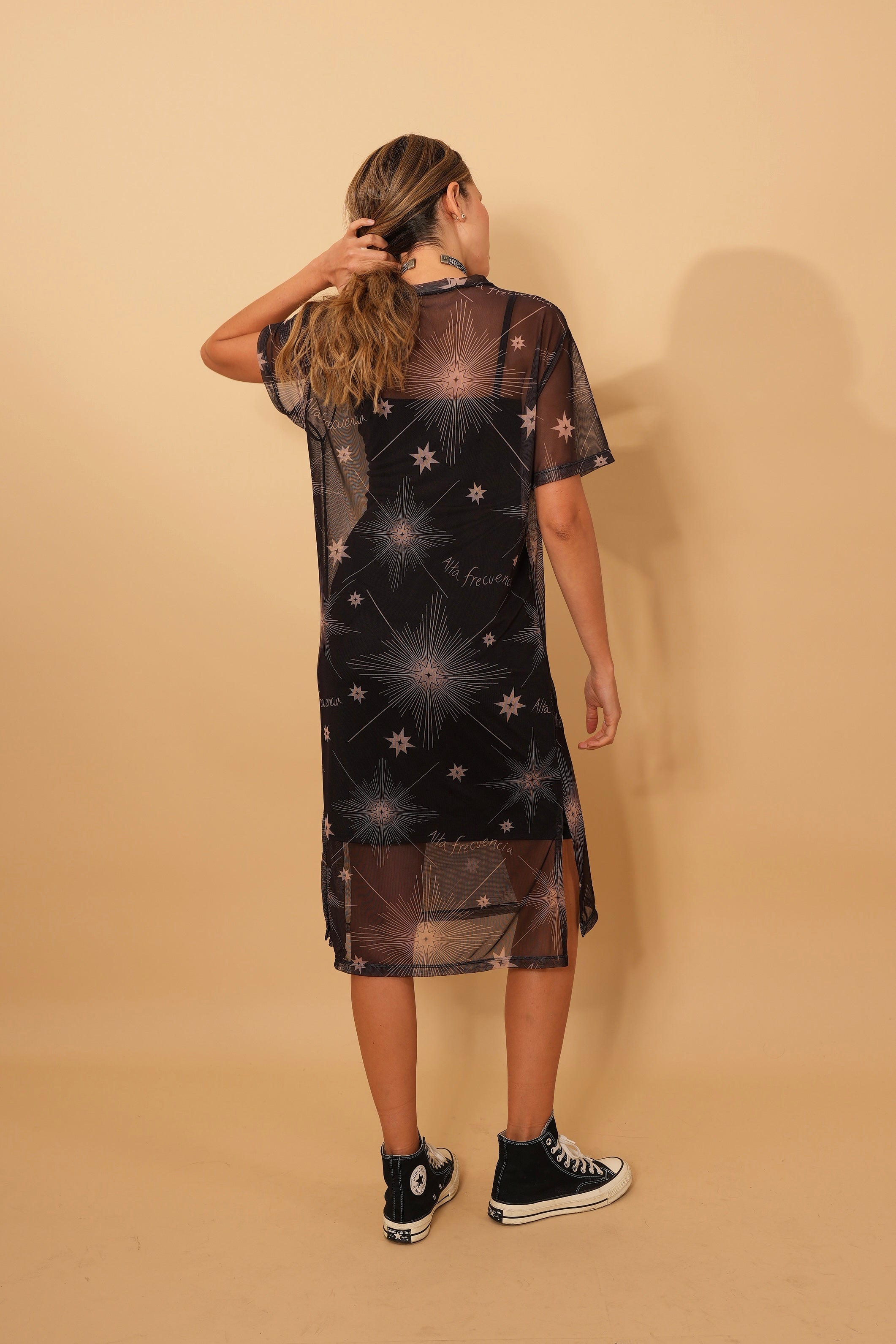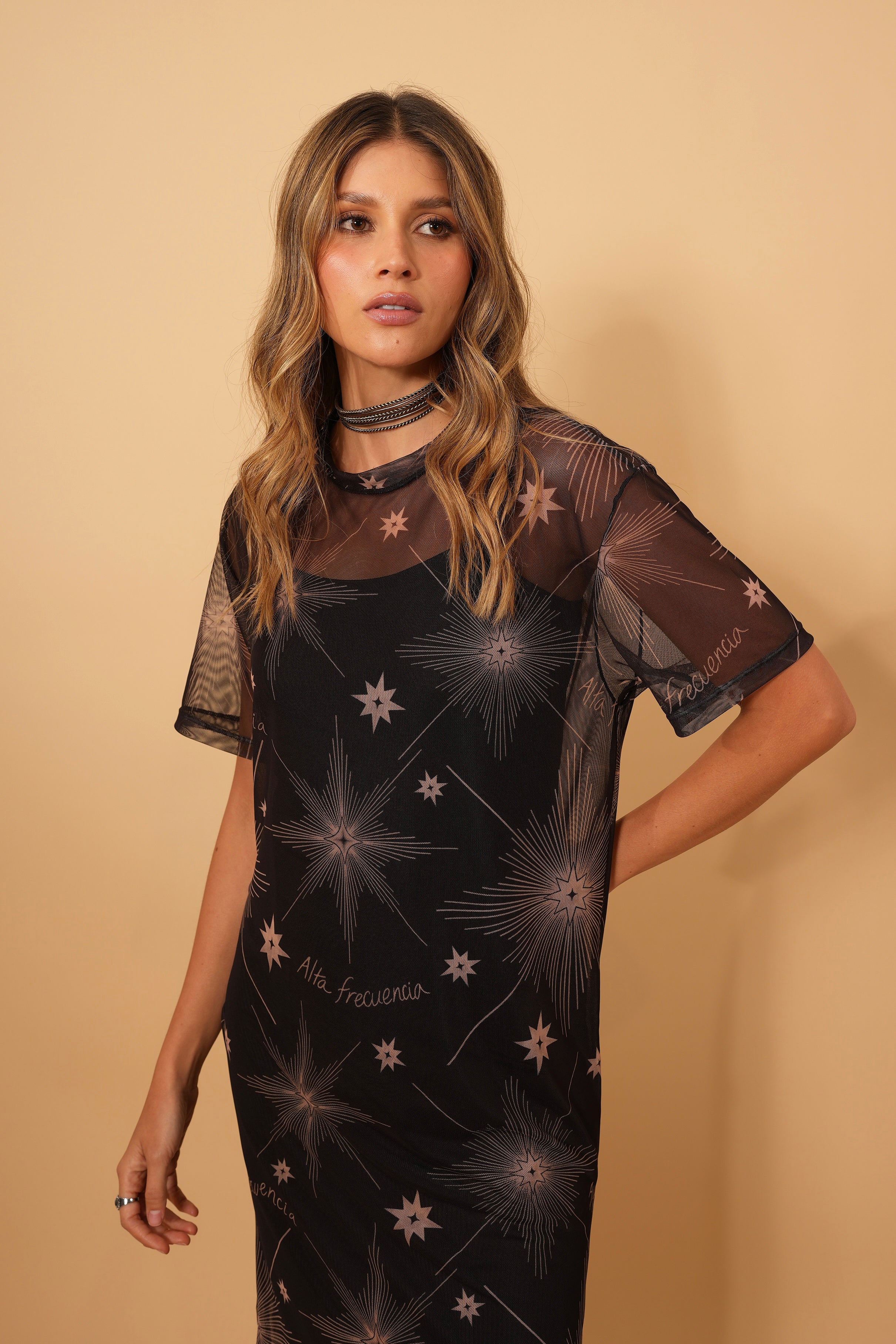 Vestido en mesh semitransparente con estampado de estrellas, de silueta recta y ligera. Tiene mangas cortas y aberturas laterales que aportan movimiento y frescura.