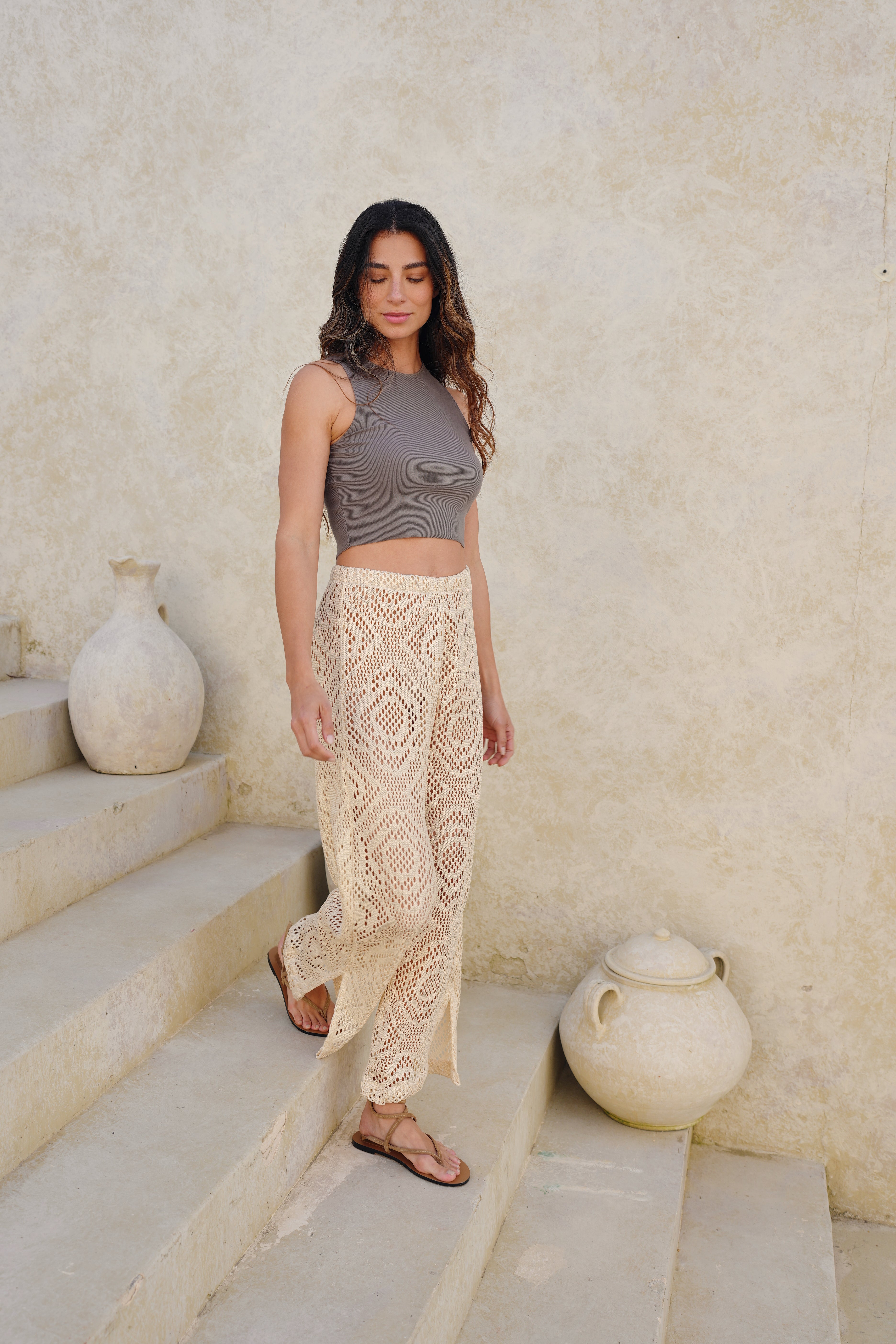 Pantalón tejido crema con destellos dorados , bota amplia en tela tejida, pretina con elástico y abertura lateral en la bota.