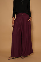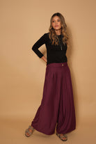 Pantalón vinotinto, en tela rayón, tiro alto, botones, bota ancha, cierre y bolsillos lo hacen una prenda infaltable en el armario.