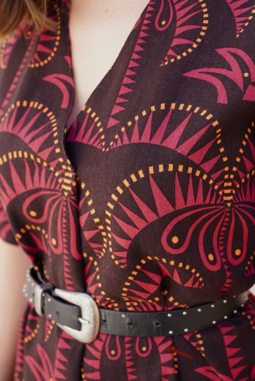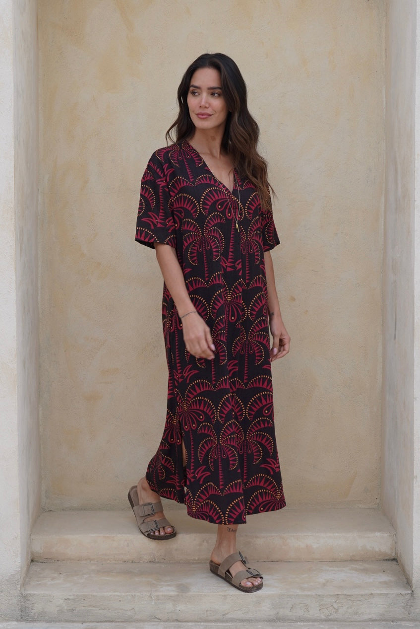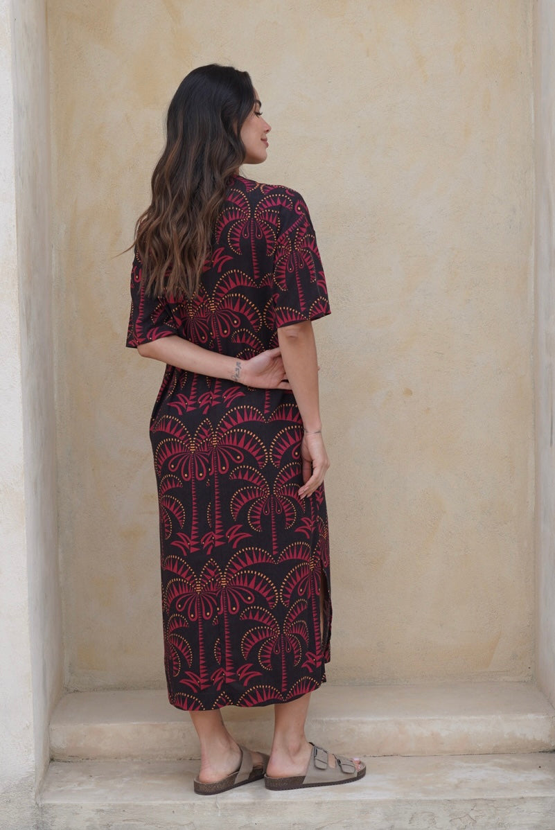 Vestido largo marrón oscuro con estampado de palmas, manga corta en tela rayón tipo lino con cinturón en la misma tela, y aberturas a los costados de la falda.