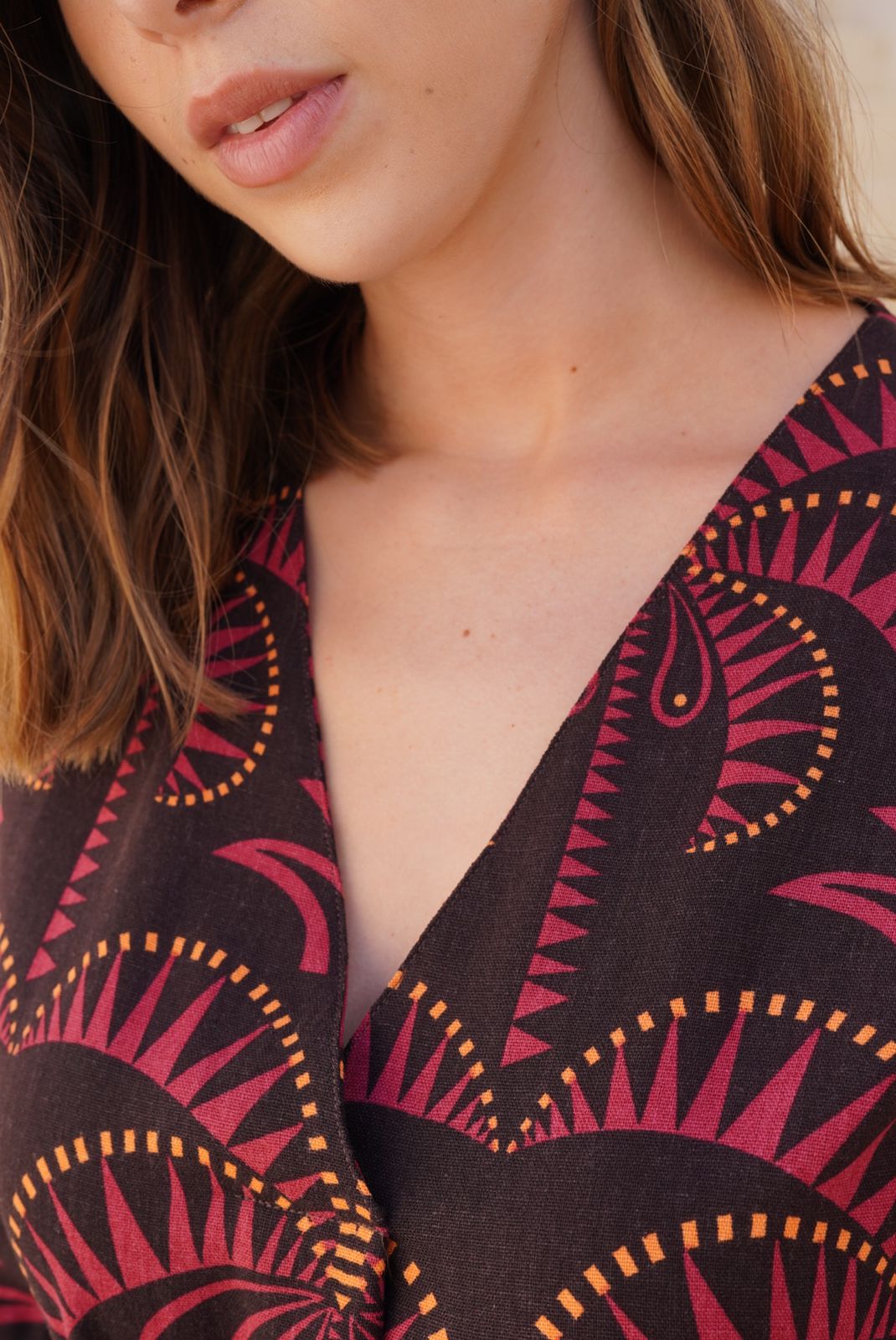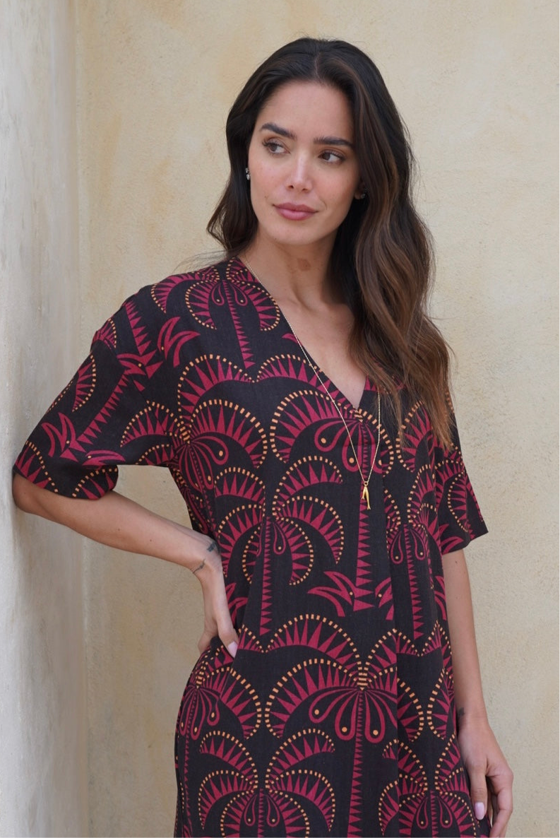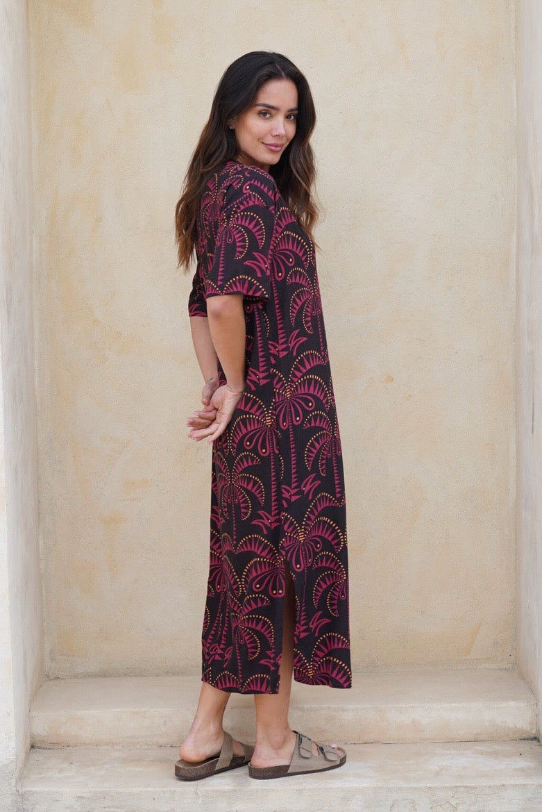 Vestido largo marrón oscuro con estampado de palmas, manga corta en tela rayón tipo lino con cinturón en la misma tela, y aberturas a los costados de la falda.