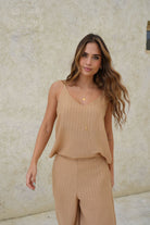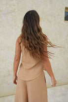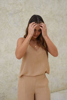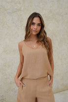 Blusa taupe en tela rayón ligera, con tirantes graduables, escote en V y corte suelto.