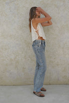 Blusa amarilla crop en algodón bordado con detalles florales, ideal para looks frescos y casuales. Su diseño sin mangas con costados ajustables mediante lazos la convierte en una prenda versátil, perfecta para combinar.