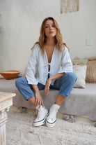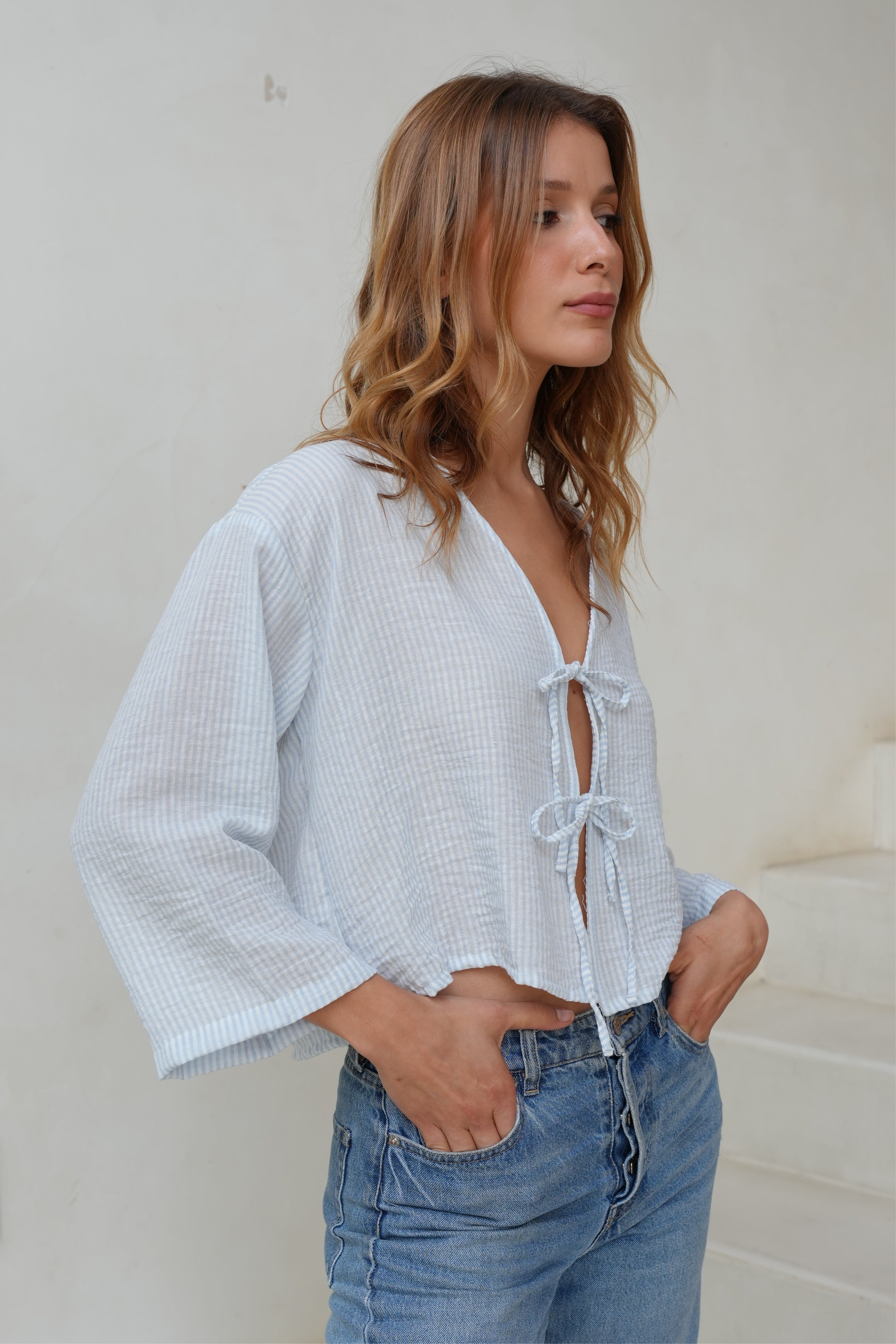 Blusa azul con rayas blancas manga midi ancha con escote en V, en tela rayón tipo lino, ajustable al frente con dos delicados lazos del mismo tejido.