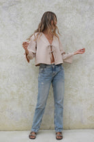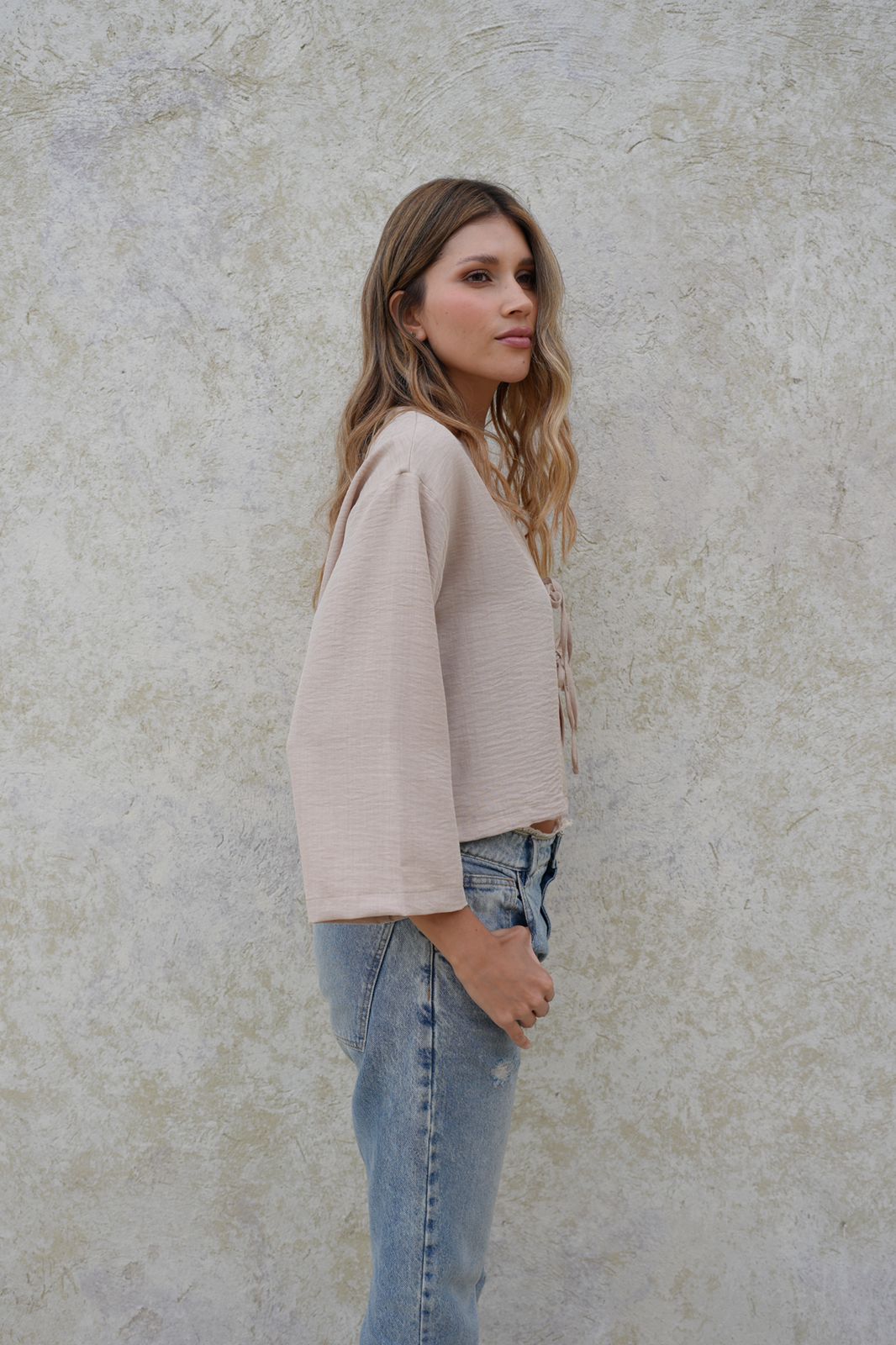 Blusa taupe manga midi ancha con escote en V, en tela poliéster, ajustable al frente con dos delicados lazos del mismo tejido.